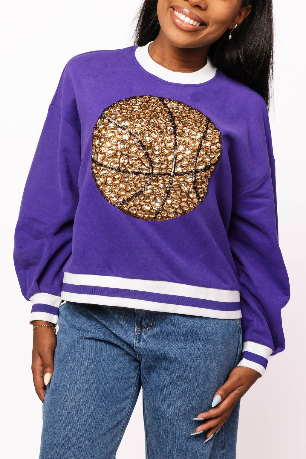 - Why We ❤ It: A luxe twist on sporty style—this jeweled basketball sweatshirt adds just the right amount of sparkle to your gameday lineup.