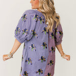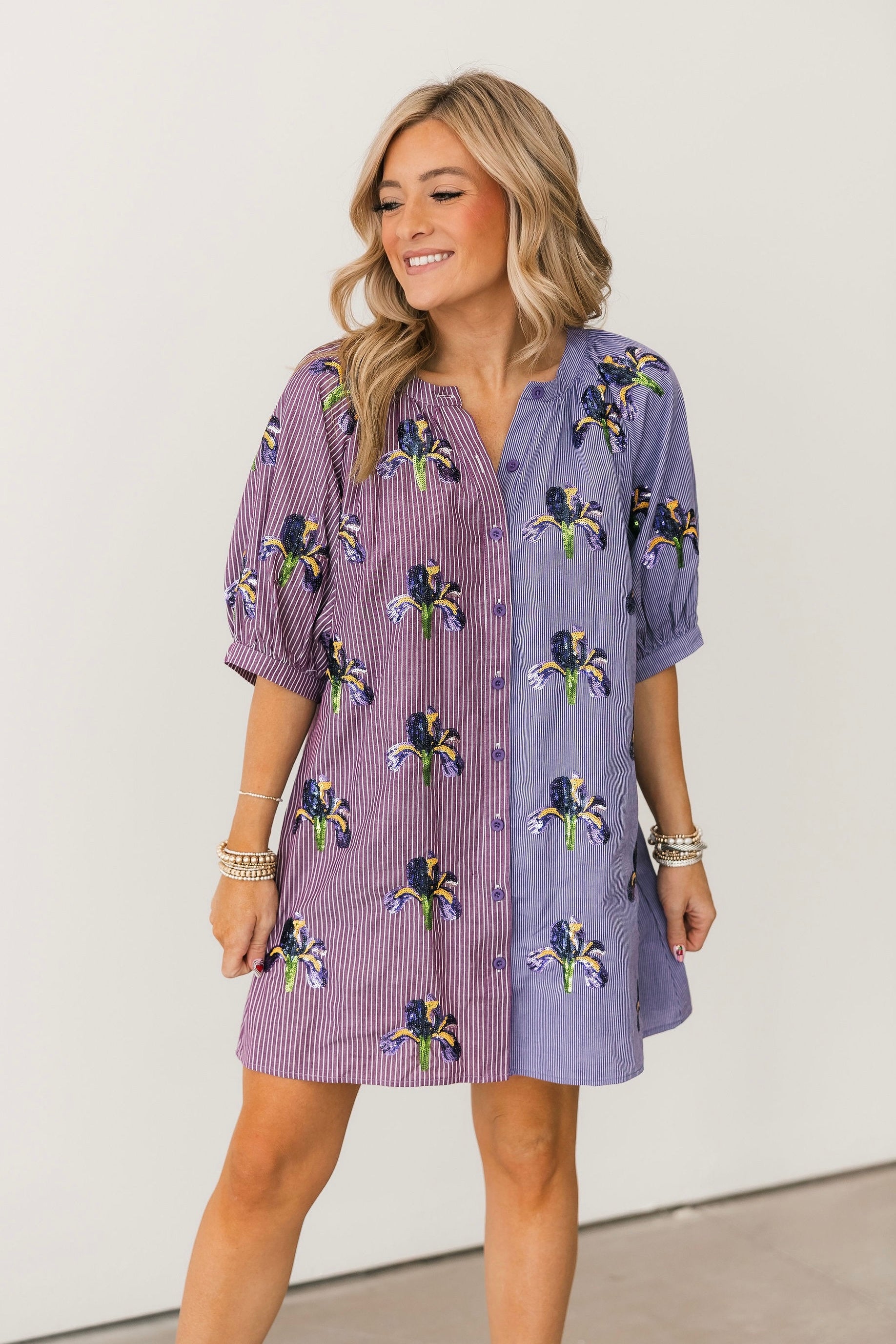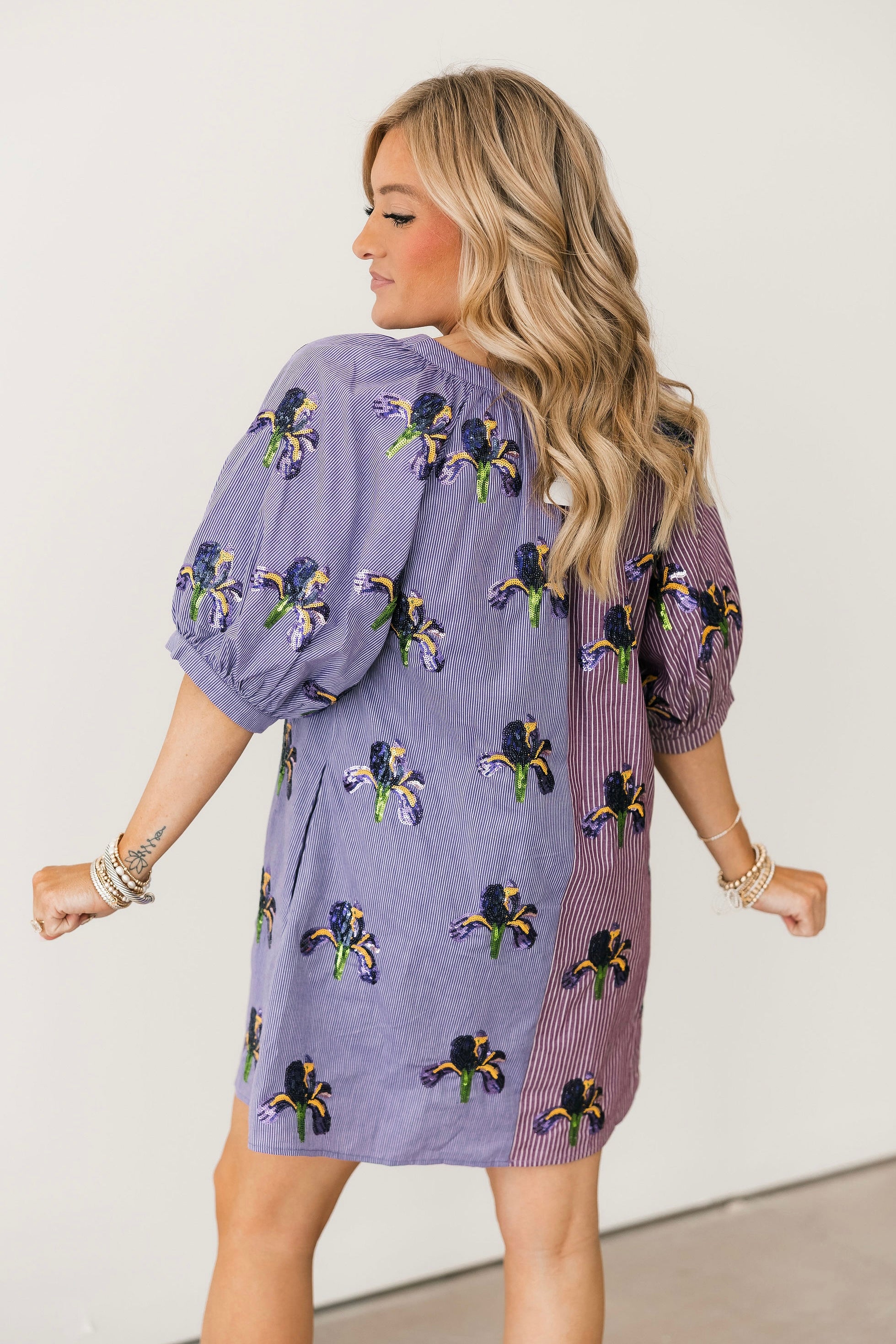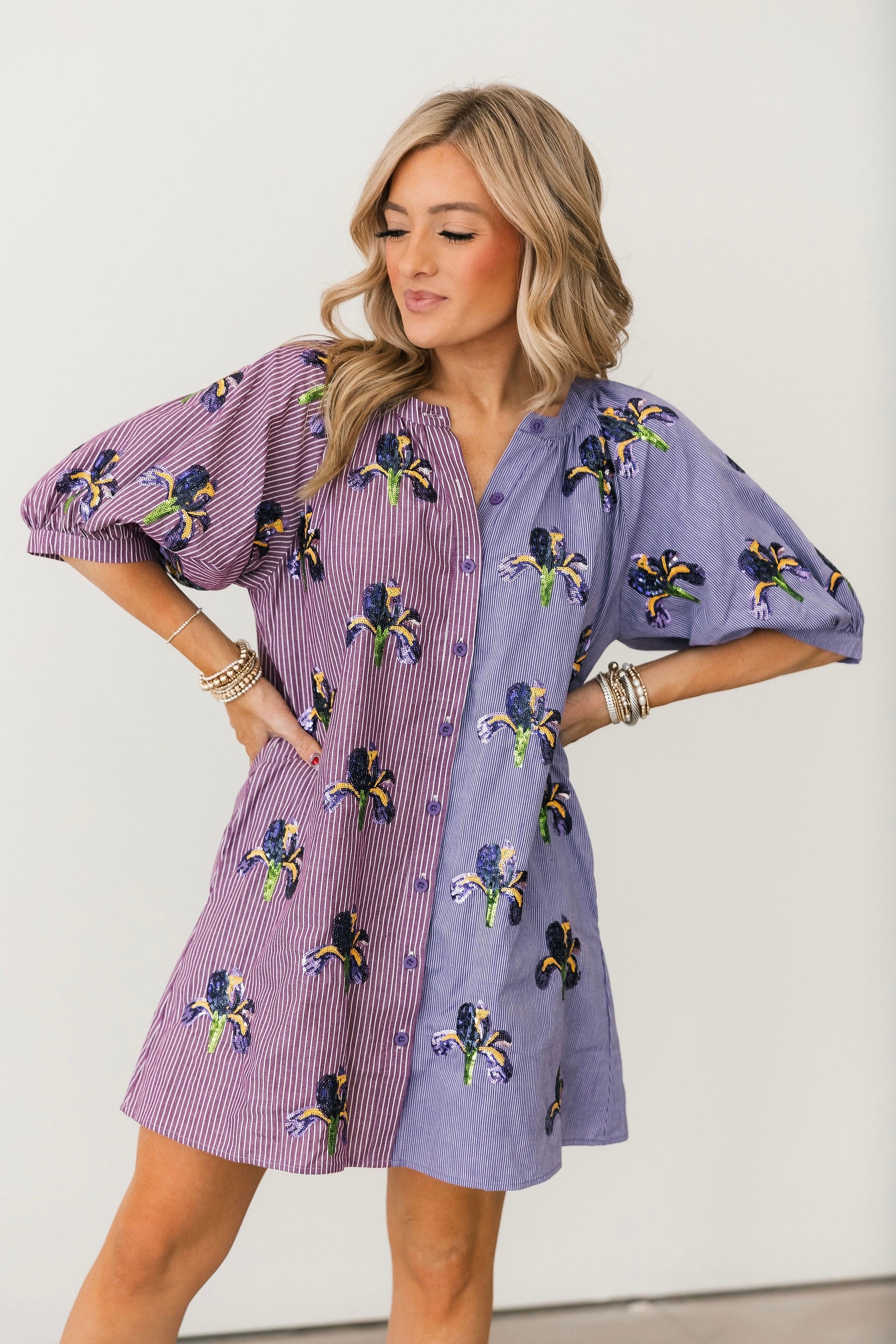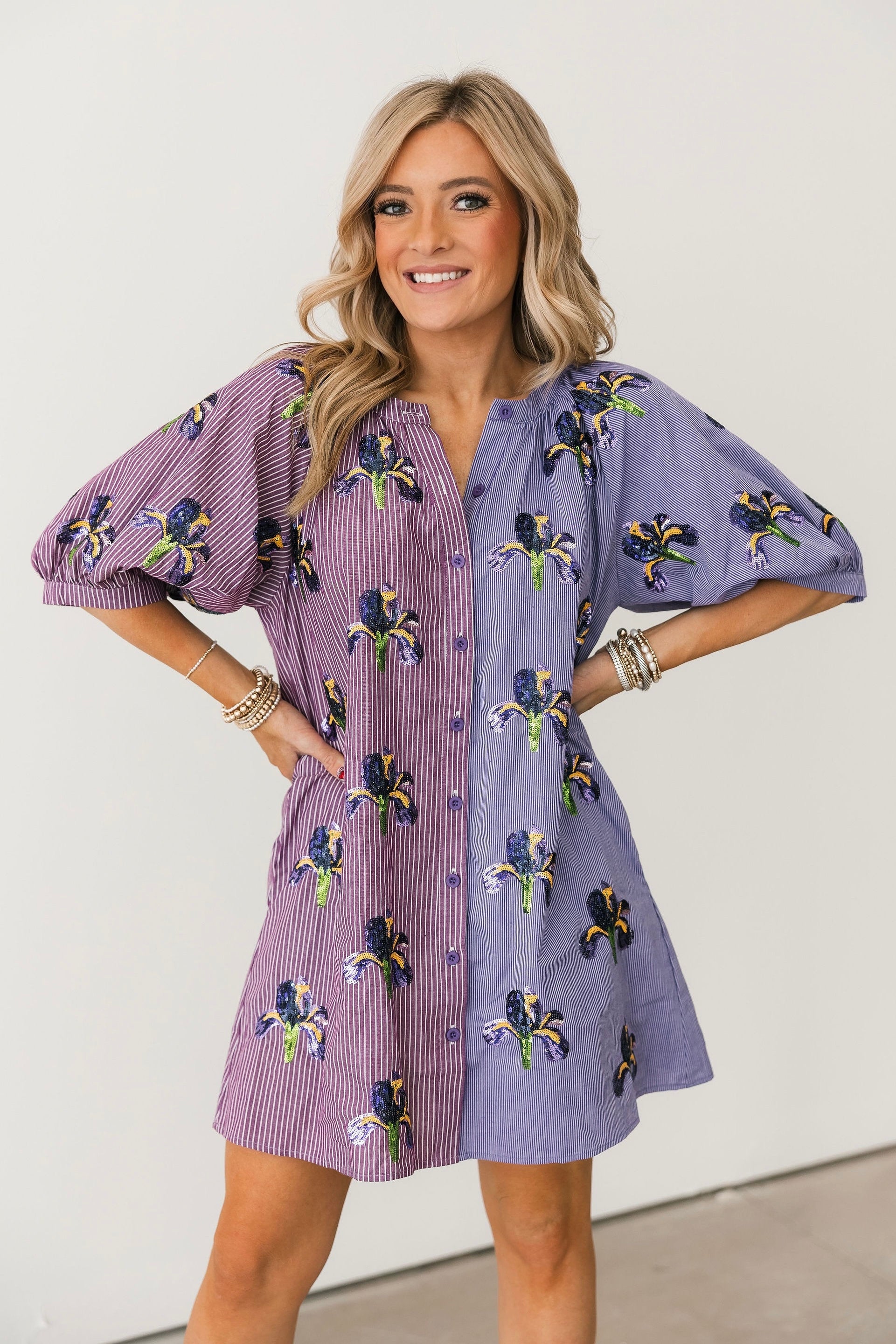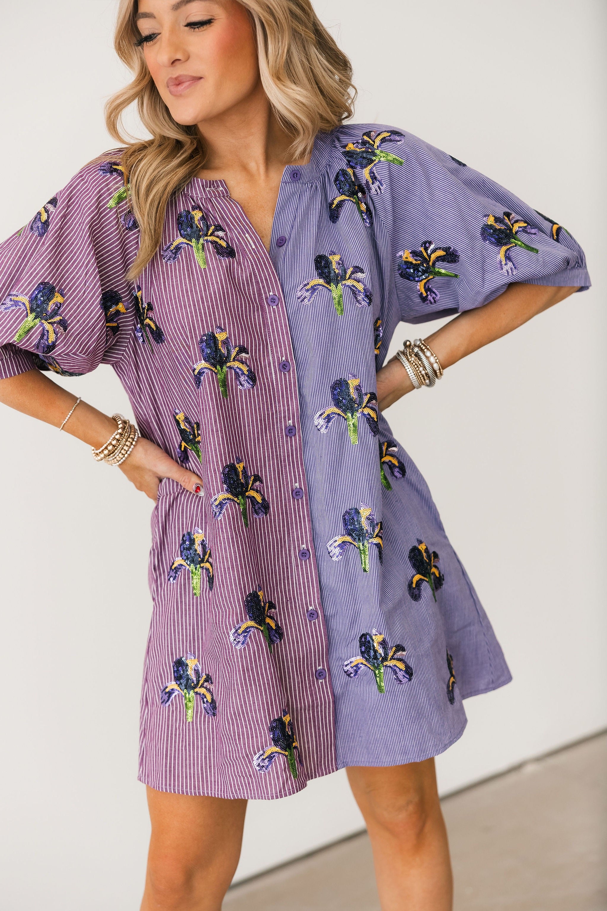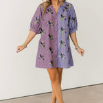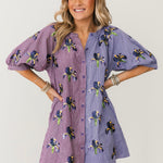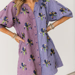 Celebrate Mardi Gras in standout style with this vibrant cotton dress featuring playful purple colorblock stripes and sparkling iris graphics. Designed with a breezy, relaxed fit and charming bubble sleeves, this button-up beauty delivers effortless comfort and festive flair. Lexi Jade is wearing an XS.