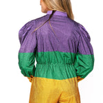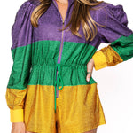 Shine brighter than the Mardi Gras parade in this dazzling full-rhinestone romper. Featuring bold purple, green, and gold colorblocking, this one-piece is designed with a relaxed fit, a flattering drawstring waist, and a front zip closure for easy wear. Finished with a chic mock neck and long sleeves, it’s the ultimate statement piece for a festive night out.