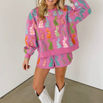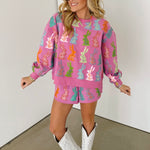 The Queen Of Sparkles Purple Multi Easter Bunny Sweatshirt features an oversized, relaxed fit with a classic crewneck and long sleeves. Colorful Easter bunnies bring a festive, playful touch, while the soft fabric ensures all-day comfort. Perfect paired with matching shorts or styled with your favorite jeans for an Easter look. Lexi Jade is wearing an XS.