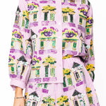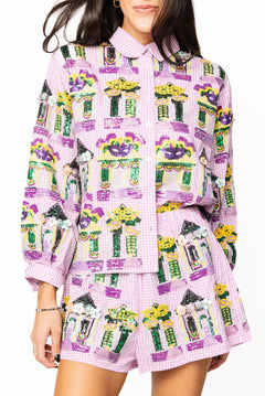 Celebrate Mardi Gras in playful style with these relaxed-fit shorts featuring a festive purple and white gingham pattern. Adorned with sparkling porch graphics inspired by New Orleans’ iconic celebrations, they’re the perfect mix of comfort and carnival charm.