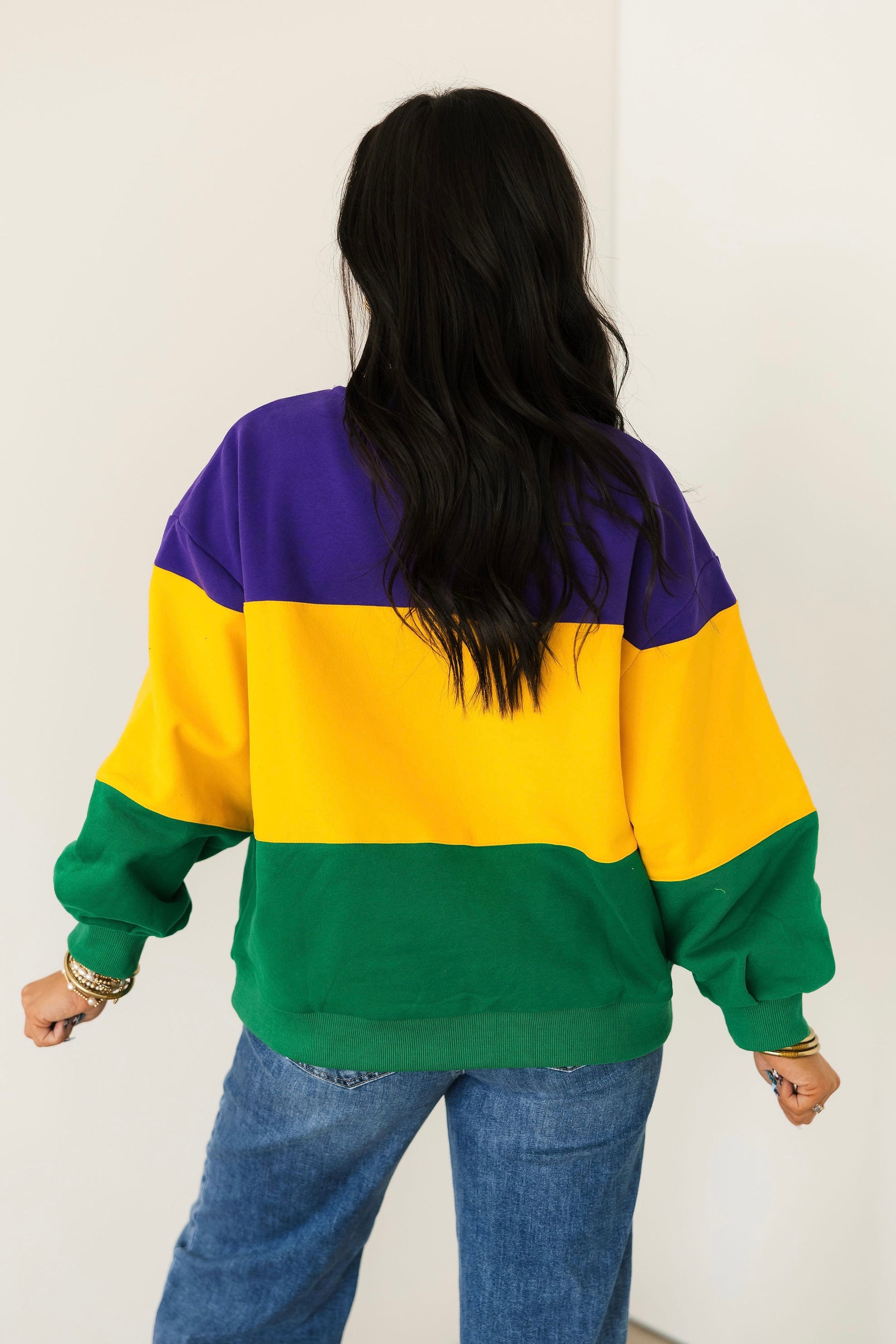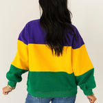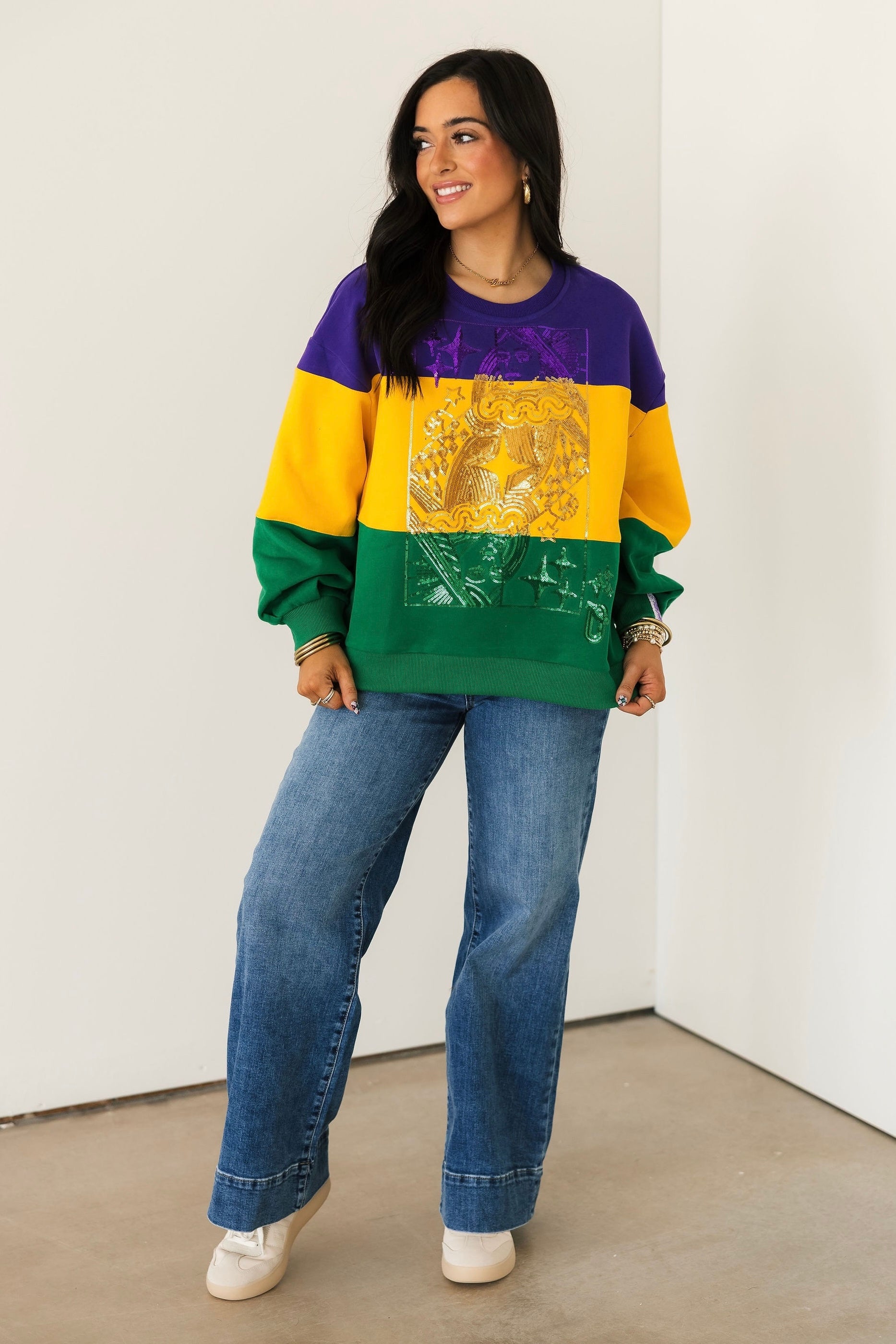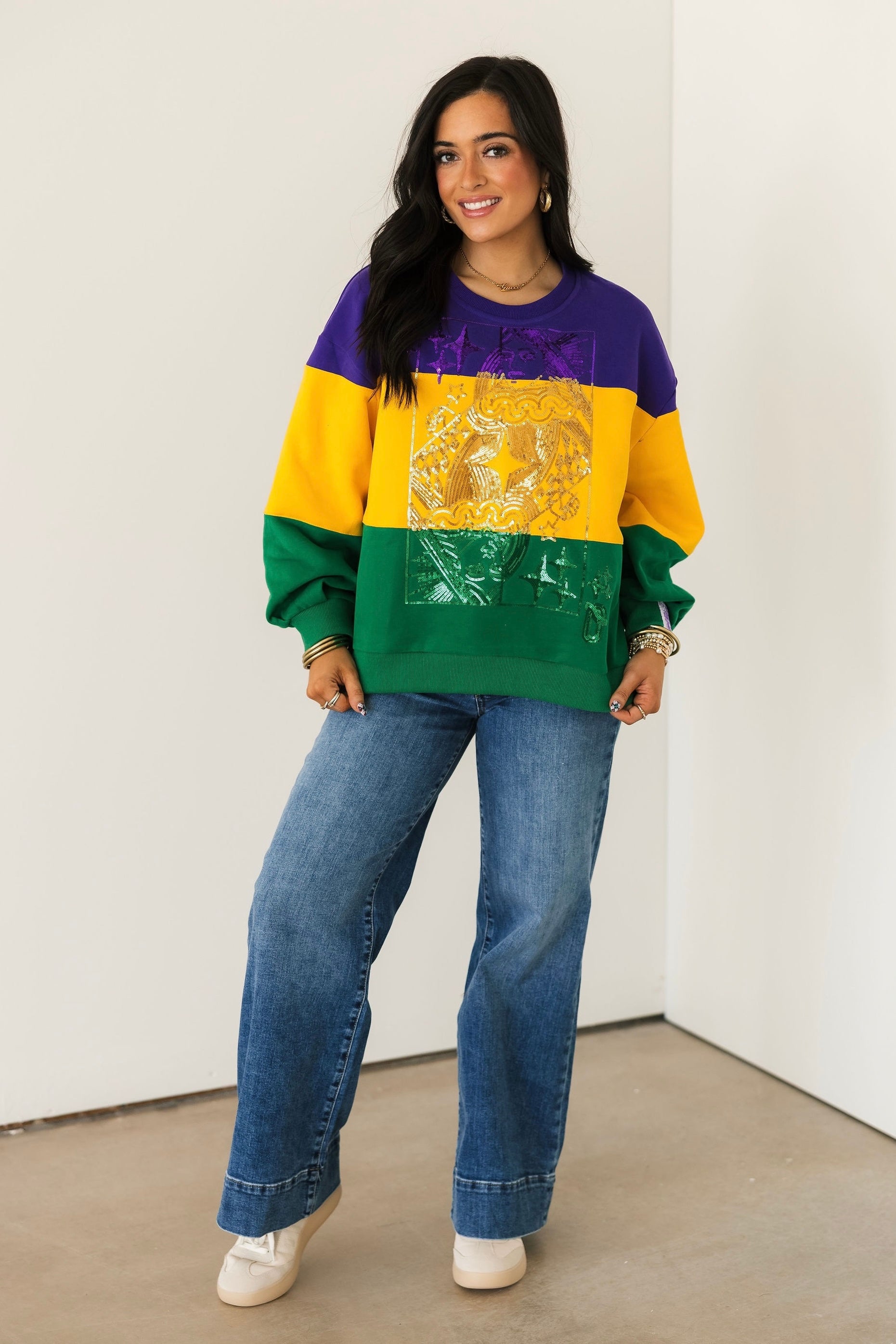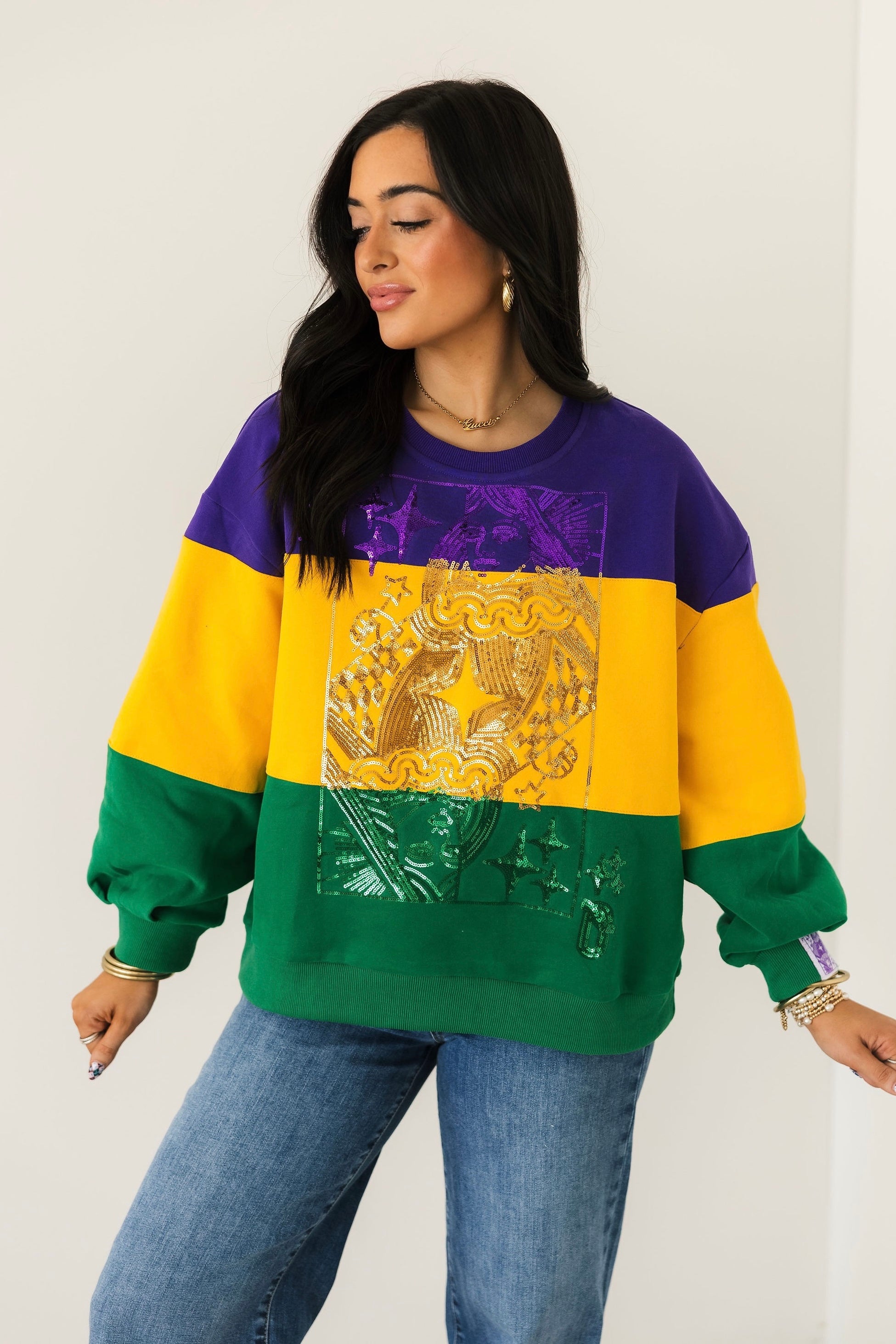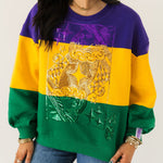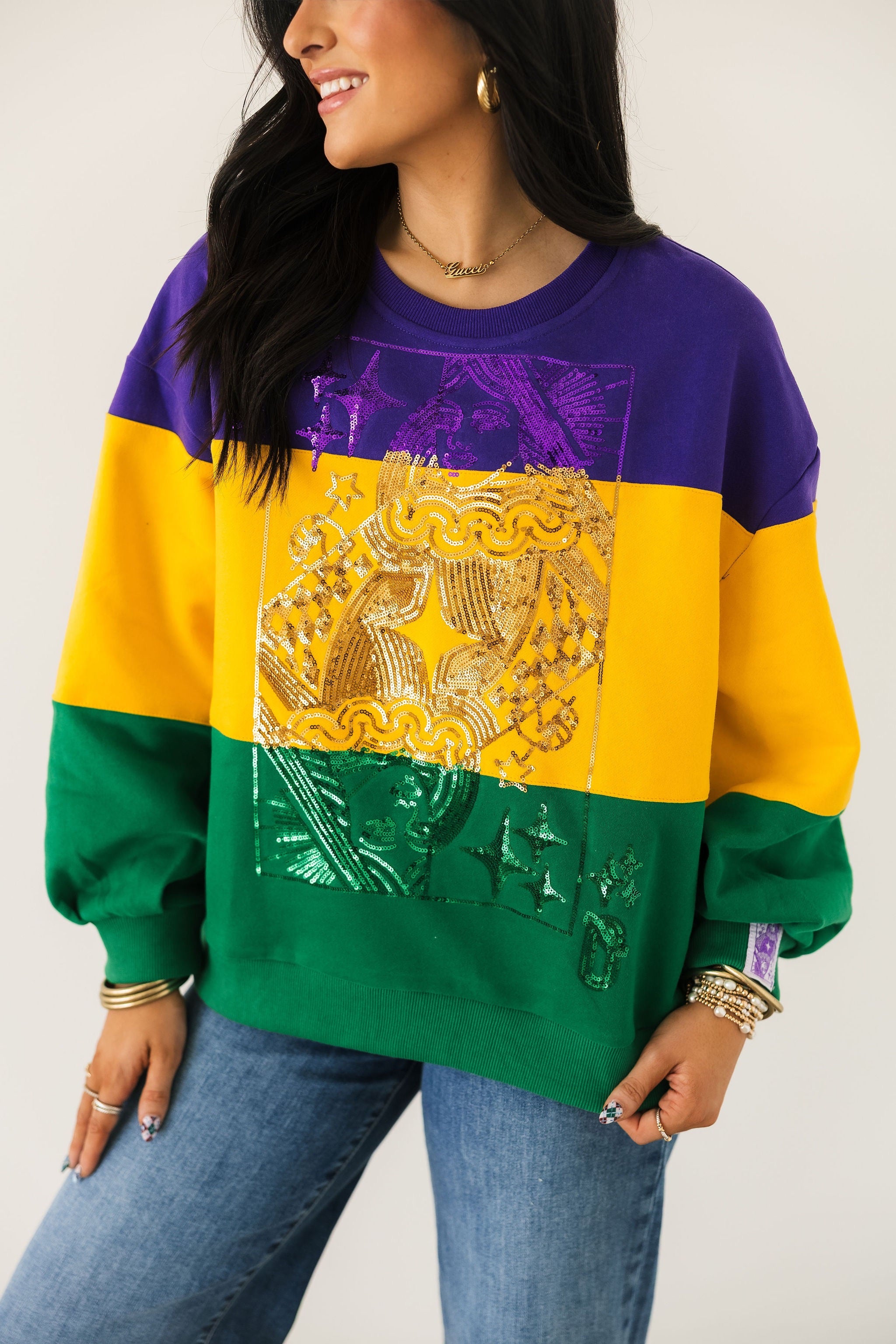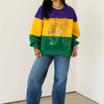 The Queen Of Sparkles Purple, Yellow & Green Striped Queen Card Sweatshirt is a bold celebration of Mardi Gras style. Designed with a relaxed fit, this cozy sweatshirt features a classic crewneck, long sleeves, and striking colorblocked stripes in festive hues. Finished with the signature QOS Queen card logo, it’s the perfect statement piece for the season. Sage is wearing an XS.