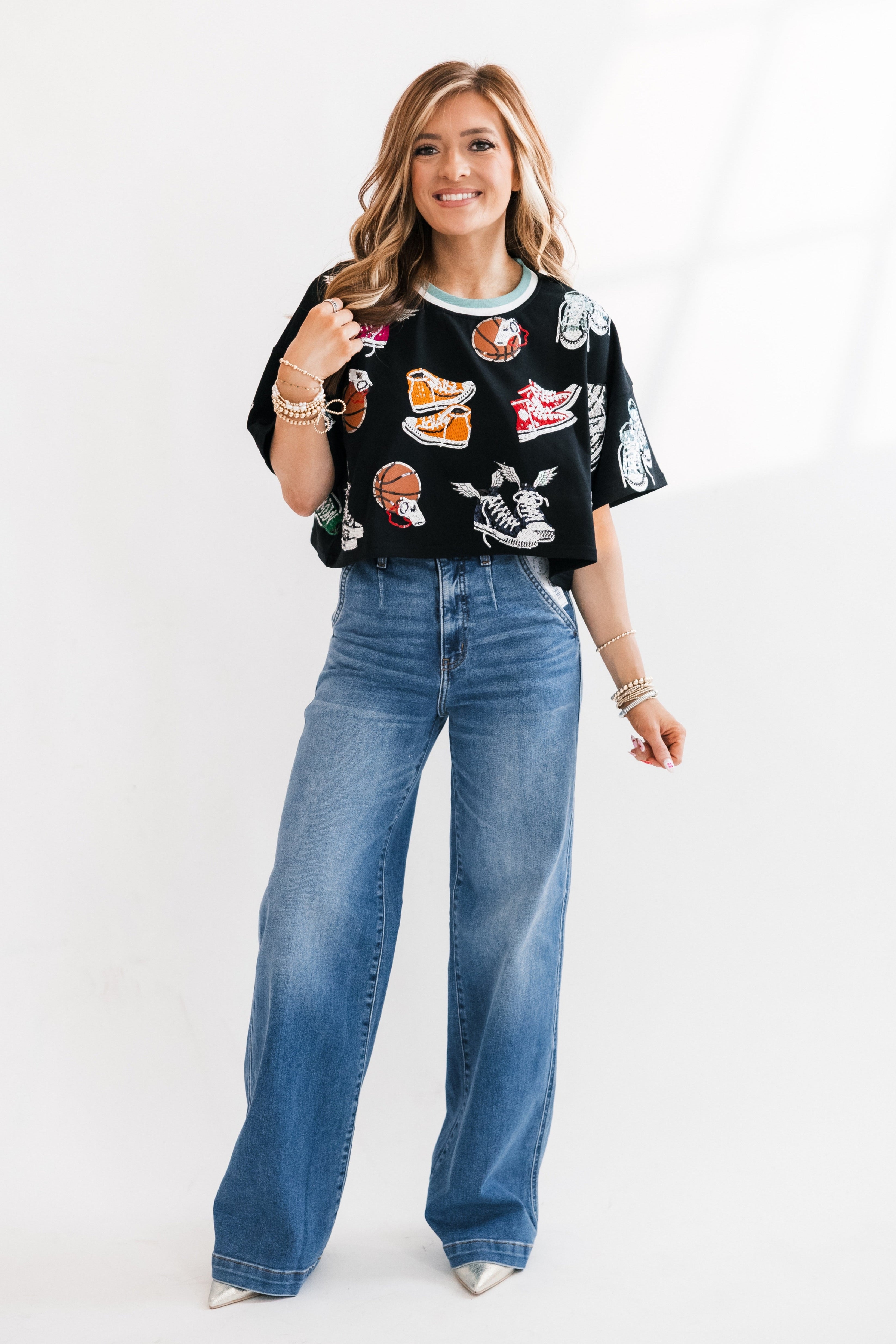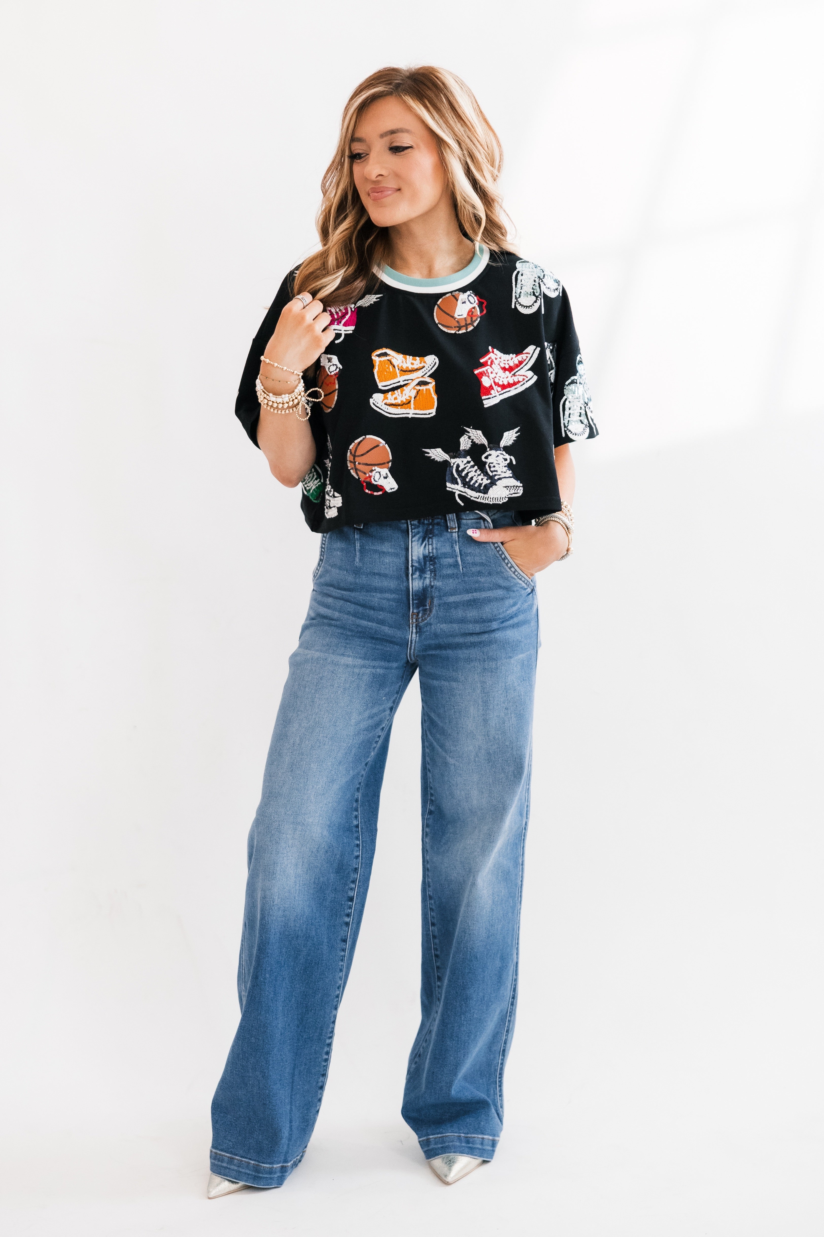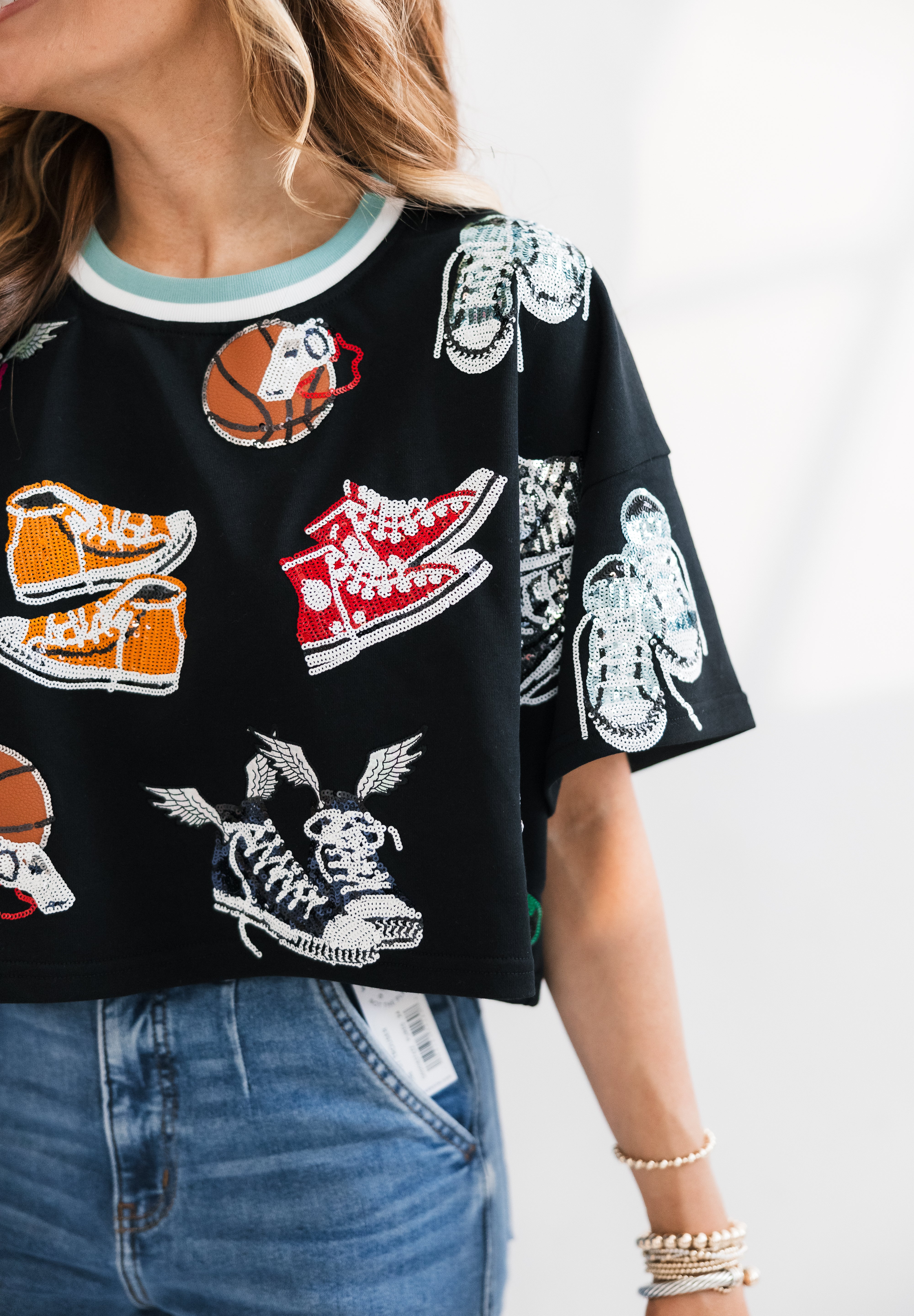 Step up your game with the Queen of Sparkles Top featuring sequined sneakers with wings, basketballs, and whistles all over! Sporty meets sparkly in this fun and flashy design, and the matching skort takes it to the next level. Perfect for making a statement on or off the court! 🏀✨👟