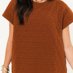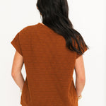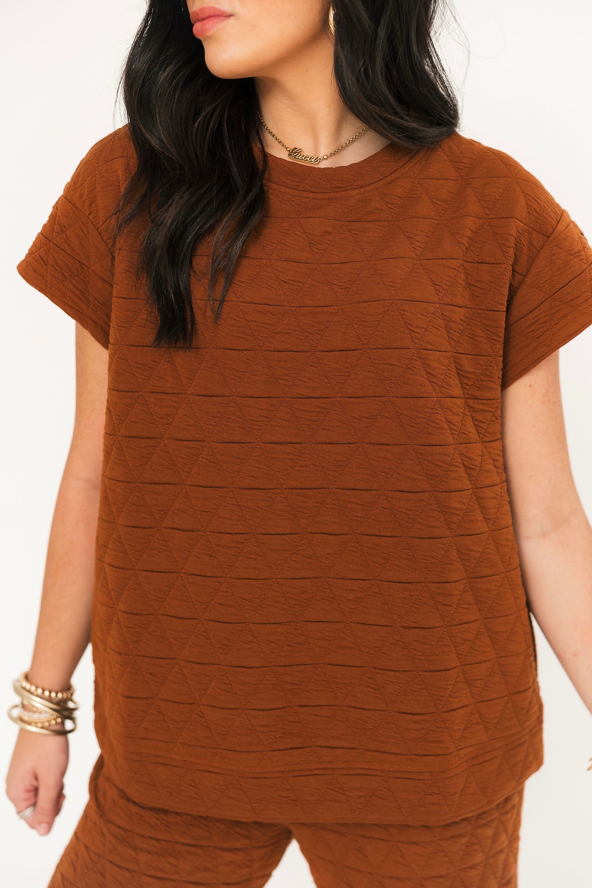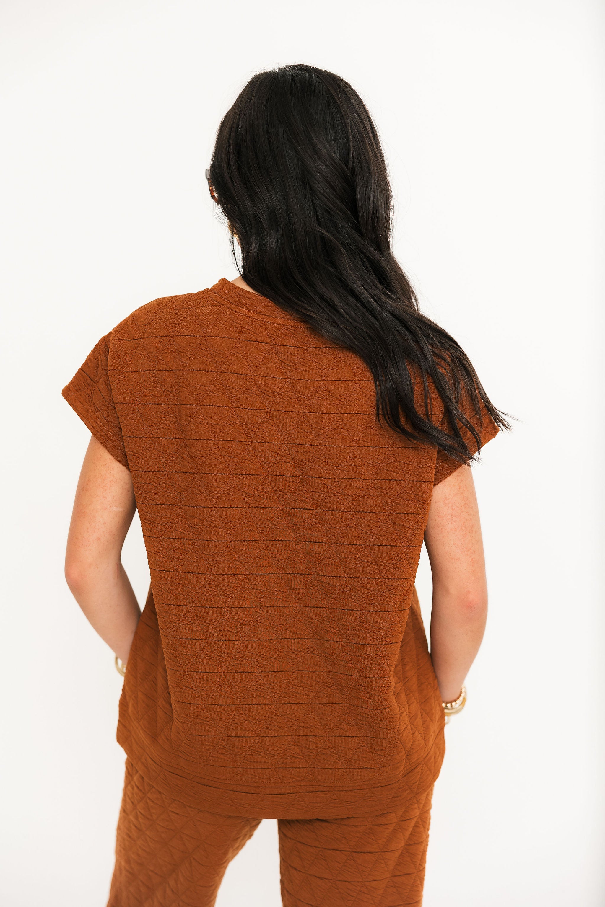 The Quilted Top in Rust brings an elevated touch to a casual staple. Featuring short sleeves, a classic crew neckline, and soft quilted detailing, this relaxed-fit top makes styling simple yet chic. Pair it with jeans for an easy everyday look or wear it with the coordinating quilted pants for a polished set that transitions seamlessly from lounging to stepping out. Sage is wearing a small.