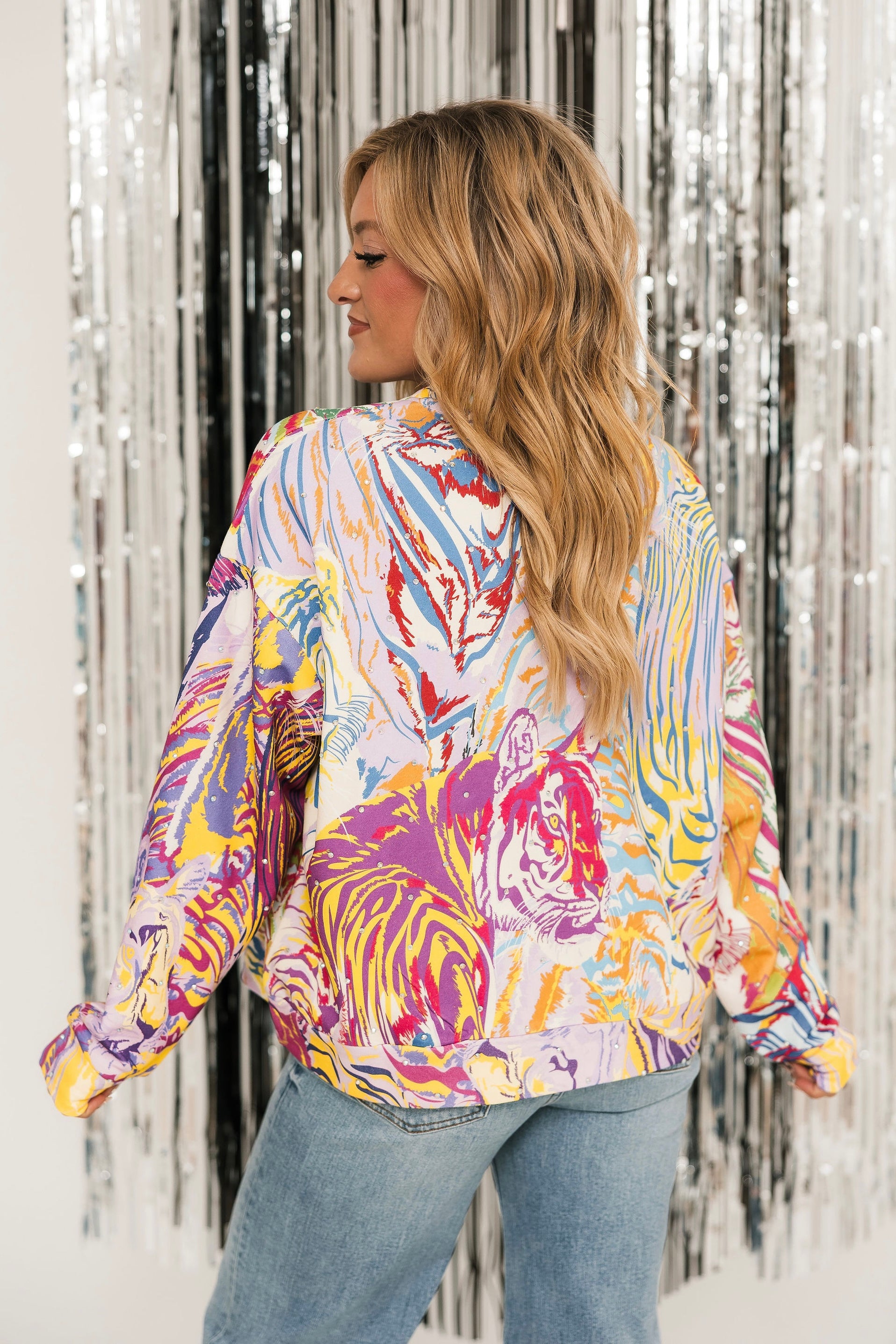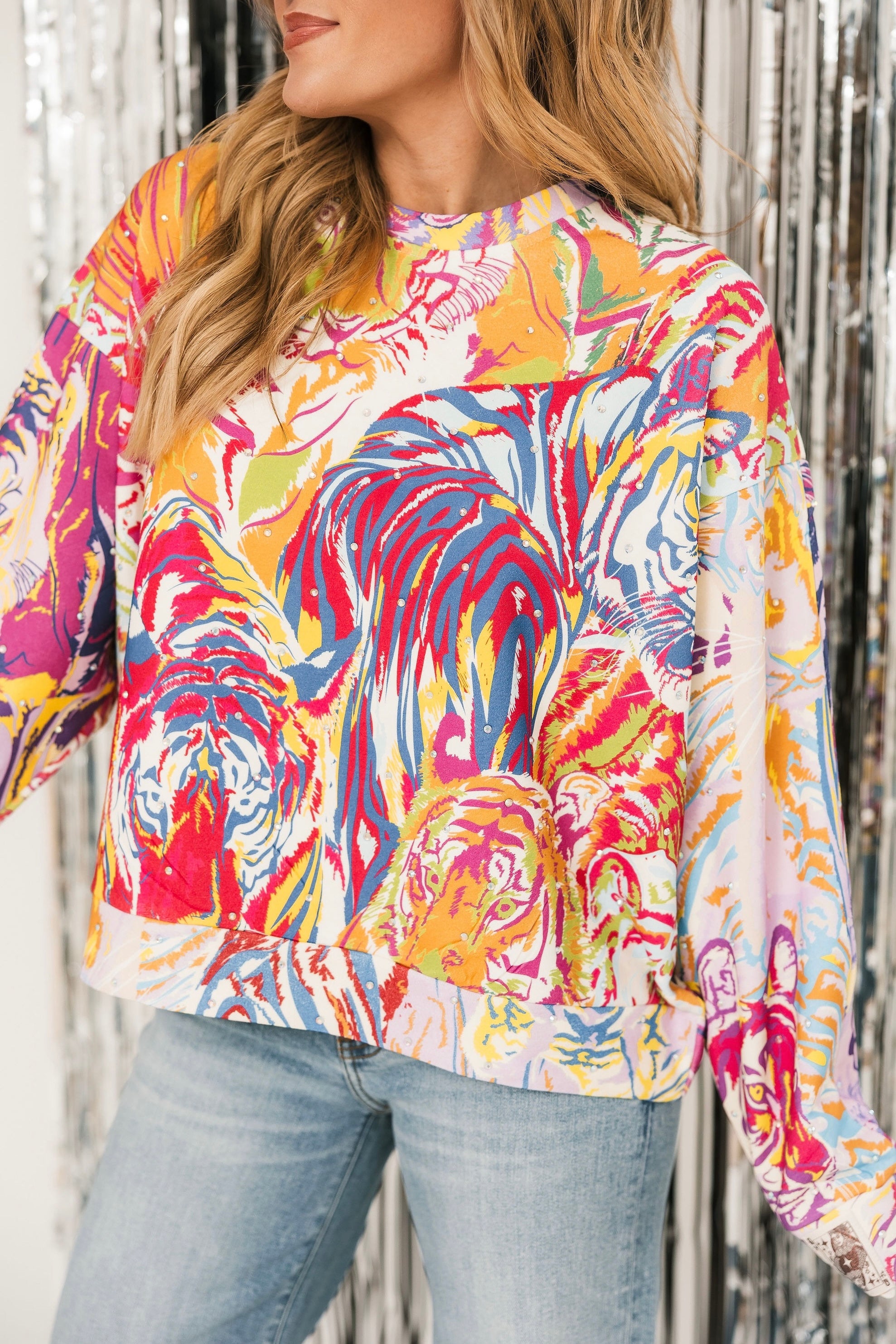 Make a bold statement in this relaxed-fit crewneck sweatshirt. Featuring a colorful abstract tiger design in vibrant rainbow tones, it’s the perfect way to add playful, artistic flair to your fall wardrobe. Pair with jeans, leggings, or layered under jackets for an effortlessly eye-catching look. Lexi is wearing an XS.