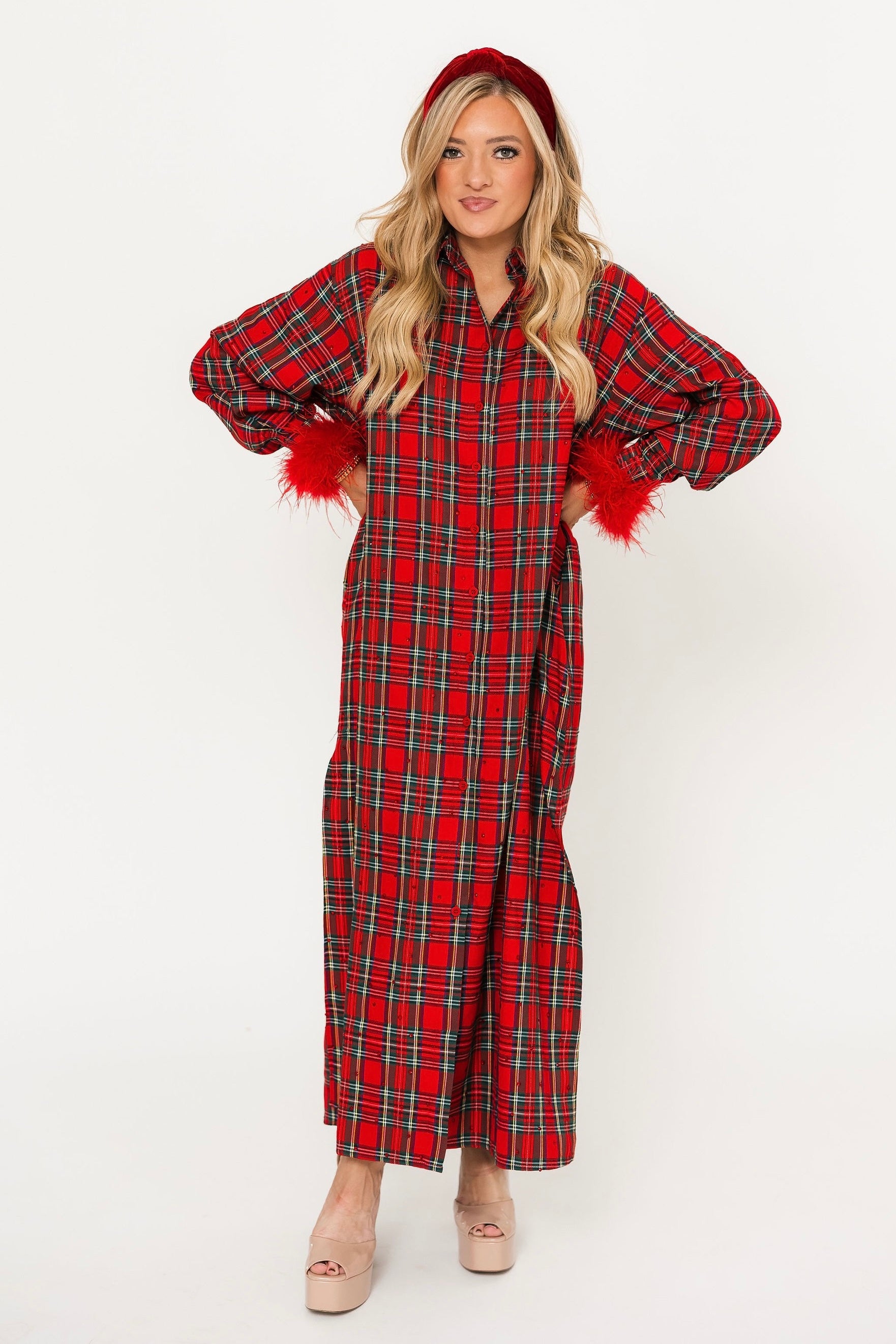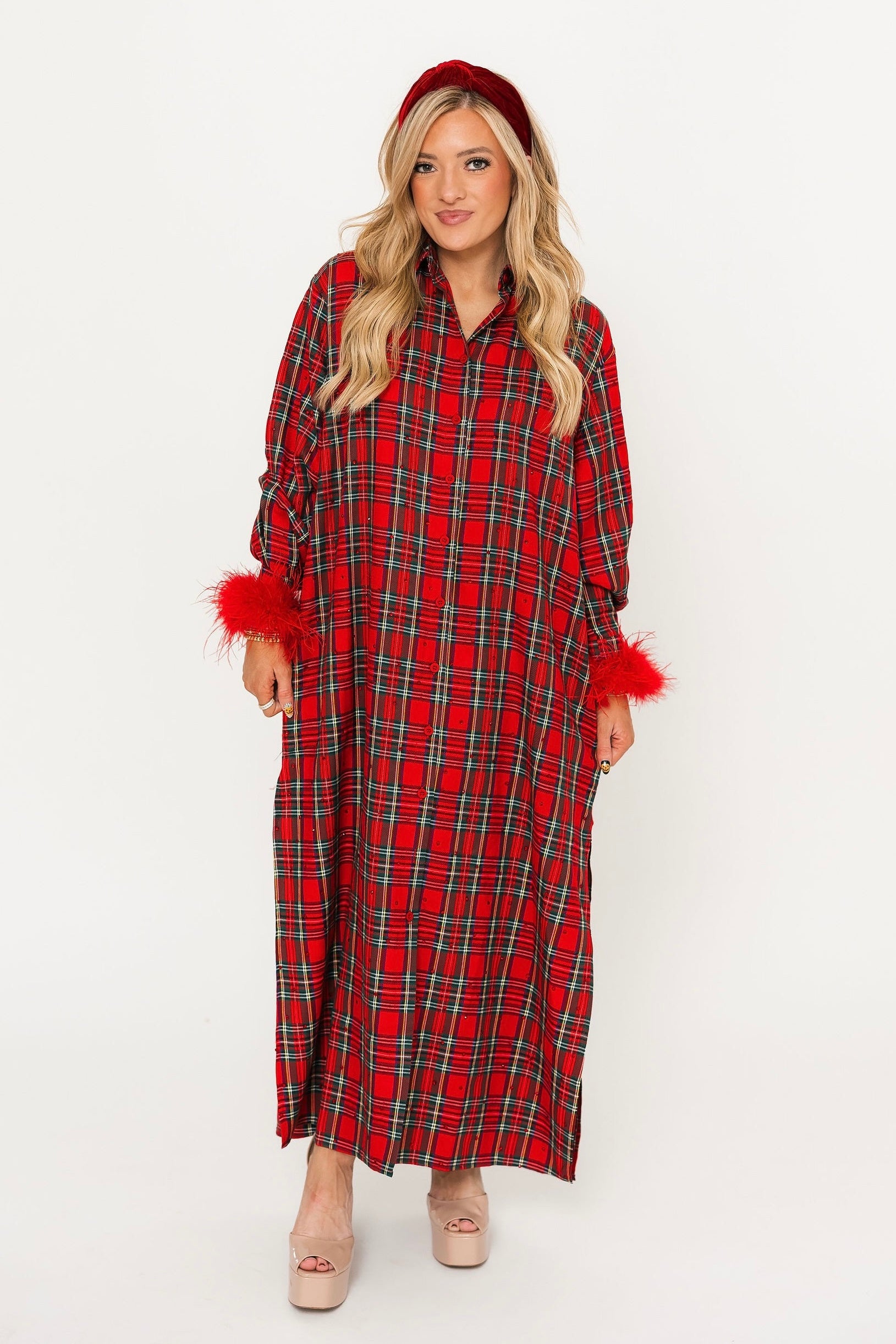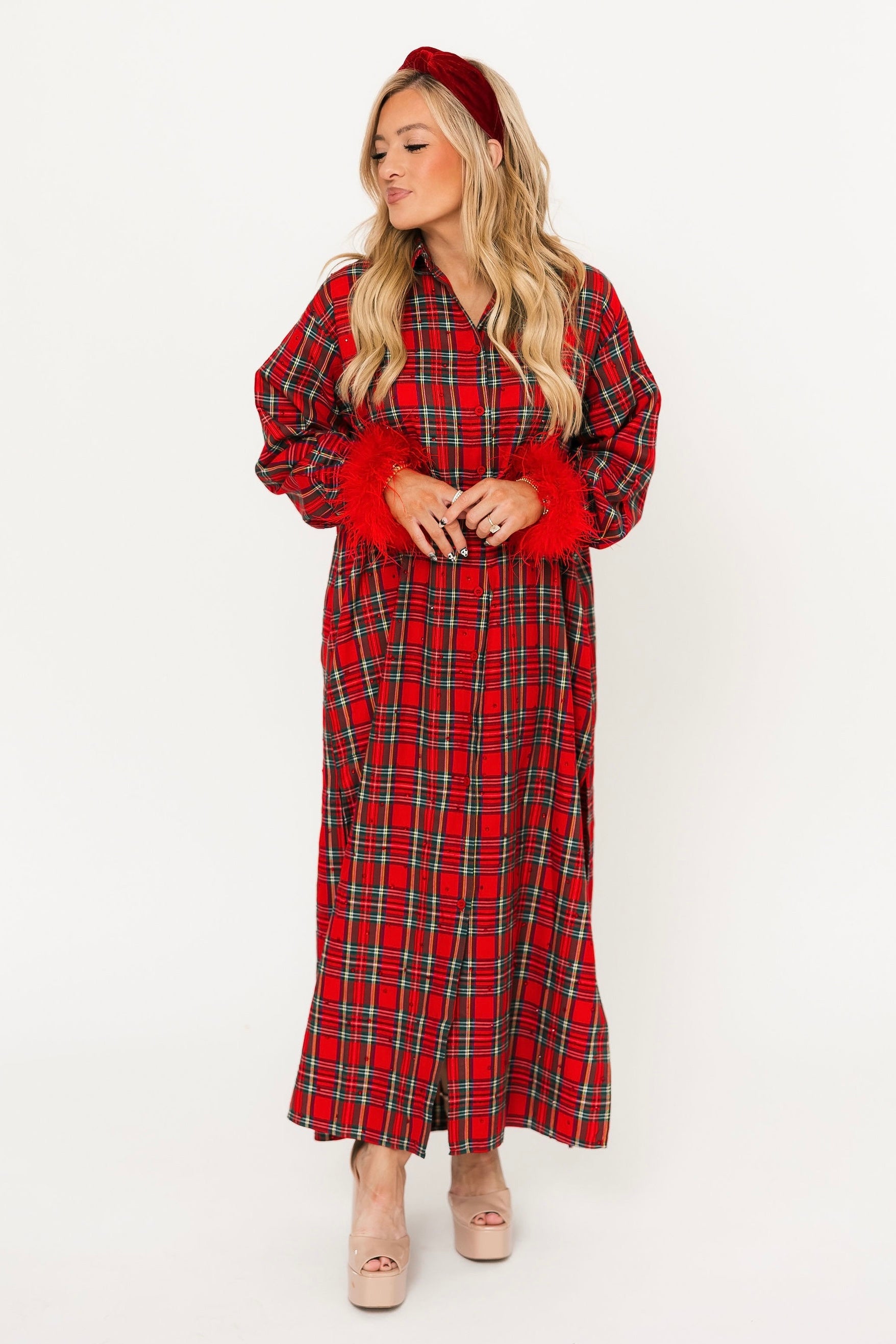 The Queen Of Sparkles Red & Green Plaid Feather Sleeve Button Up Midi Dress is a festive holiday essential with a relaxed fit and classic plaid design. Featuring a collared neckline, button-down front, midi length, and playful feather-trimmed sleeve cuffs, this standout dress is perfect for holiday gatherings, parties, or any moment you want to sparkle a little brighter. Lexi Jade is wearing an XS.