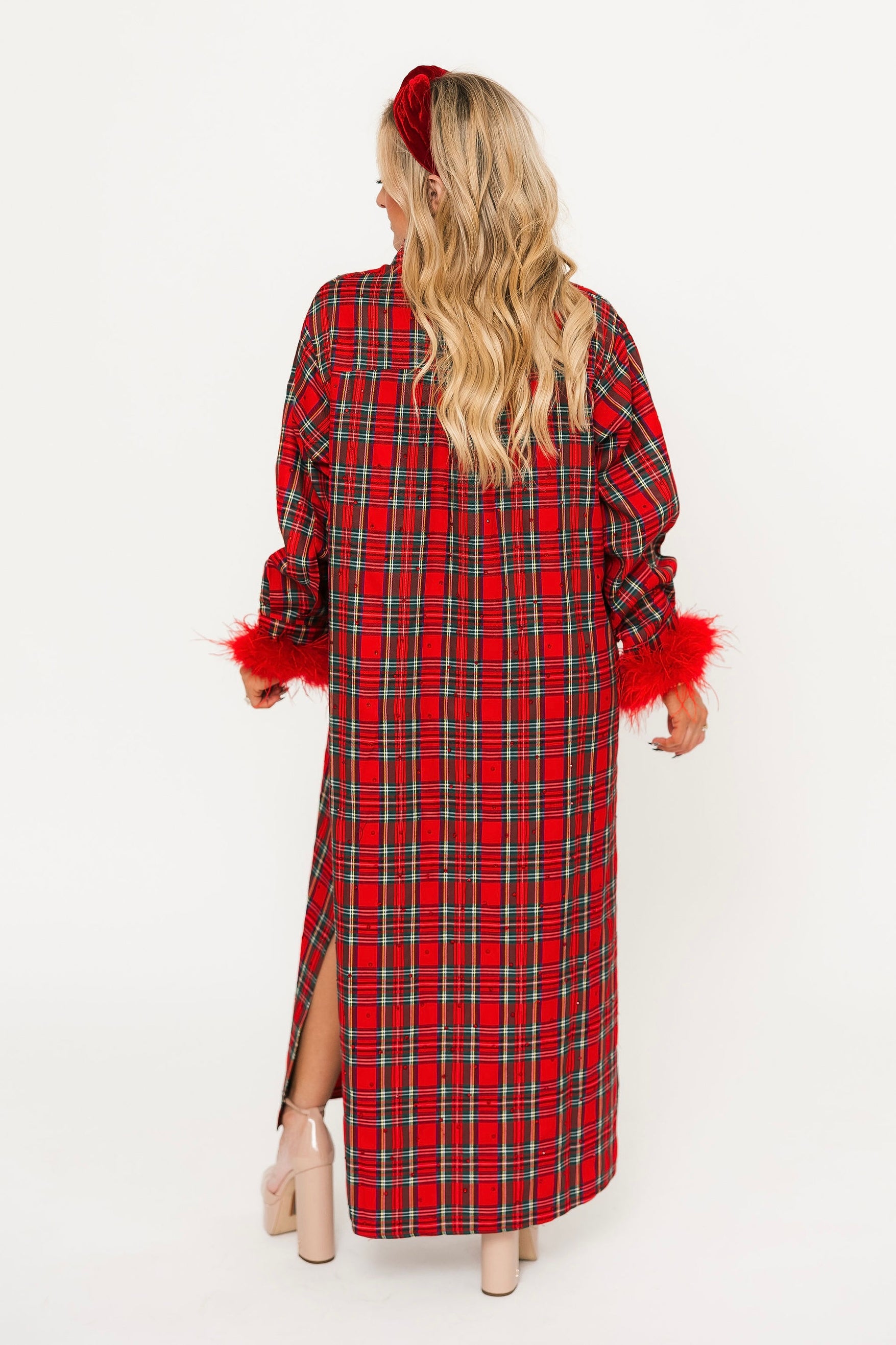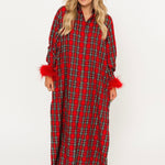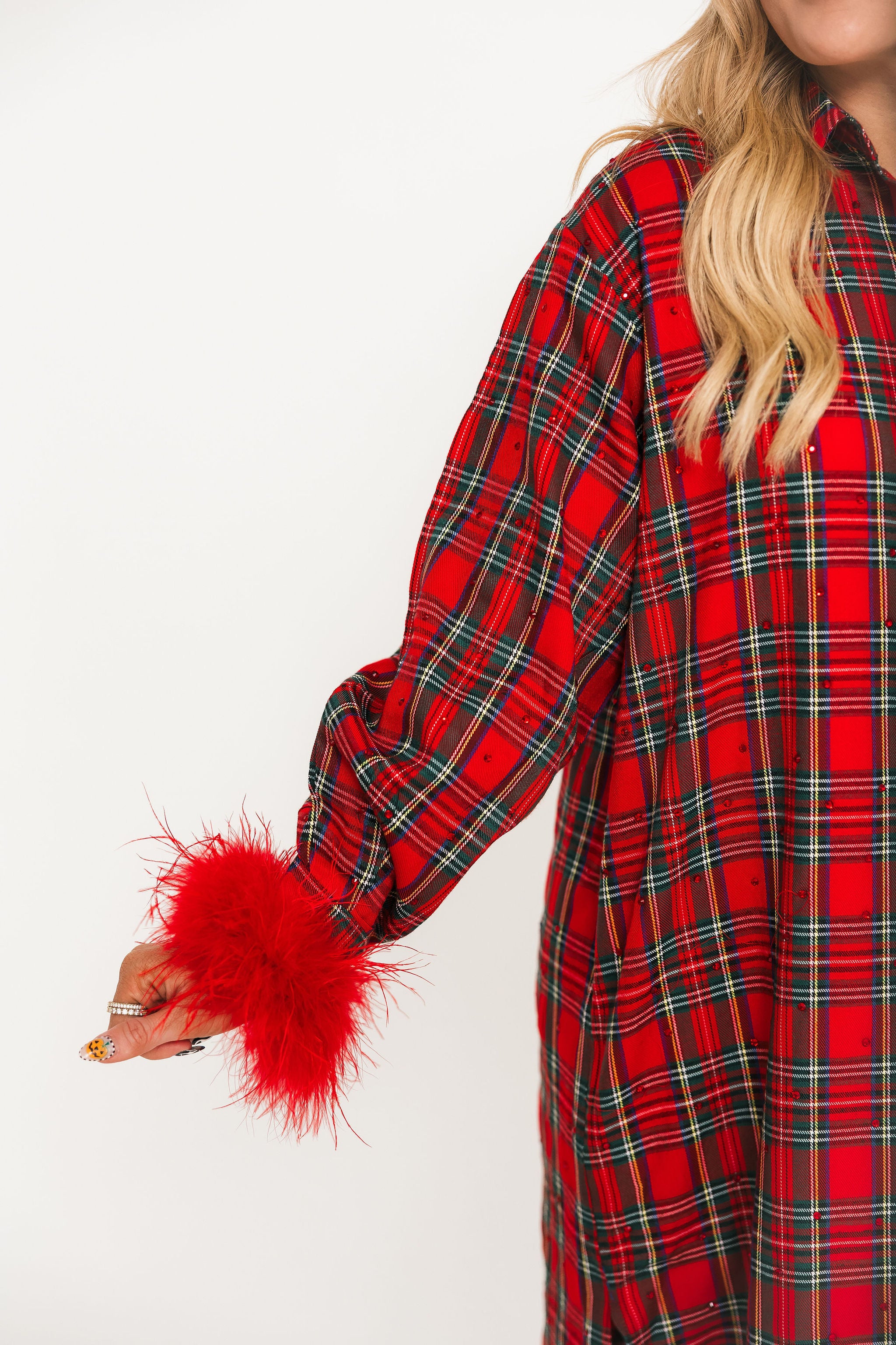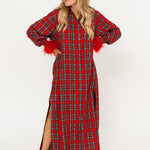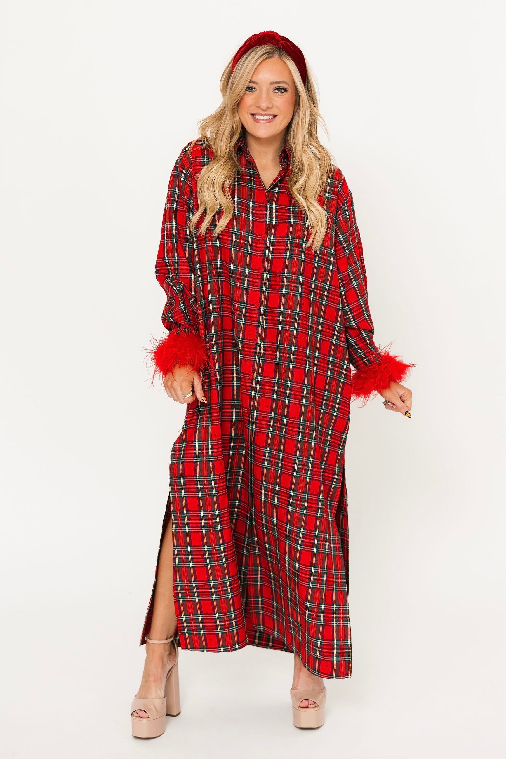 The Queen Of Sparkles Red & Green Plaid Feather Sleeve Button Up Midi Dress is a festive holiday essential with a relaxed fit and classic plaid design. Featuring a collared neckline, button-down front, midi length, and playful feather-trimmed sleeve cuffs, this standout dress is perfect for holiday gatherings, parties, or any moment you want to sparkle a little brighter. Lexi Jade is wearing an XS.