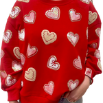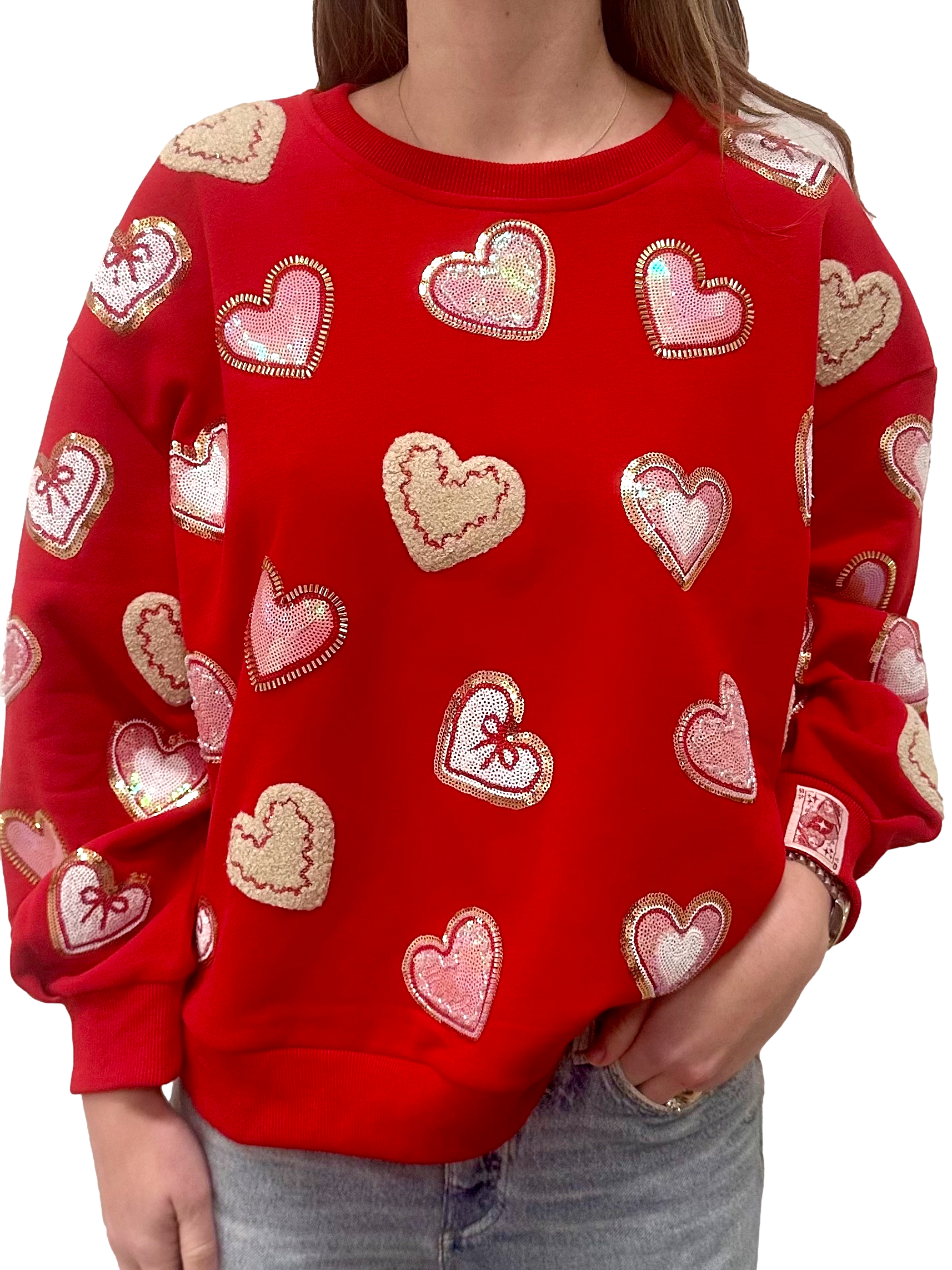 The Queen Of Sparkles Red Heart Cookies Oversized Sweatshirt features a true-to-size fit with a classic crewneck and long sleeves. Soft and comfy, it’s perfect for lounging, casual outings, or styling with matching Queen Of Sparkles pieces for a festive, playful look.