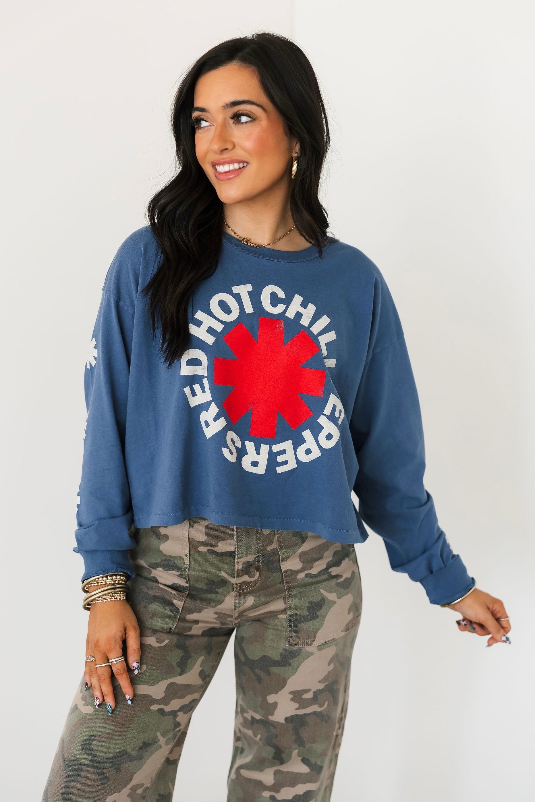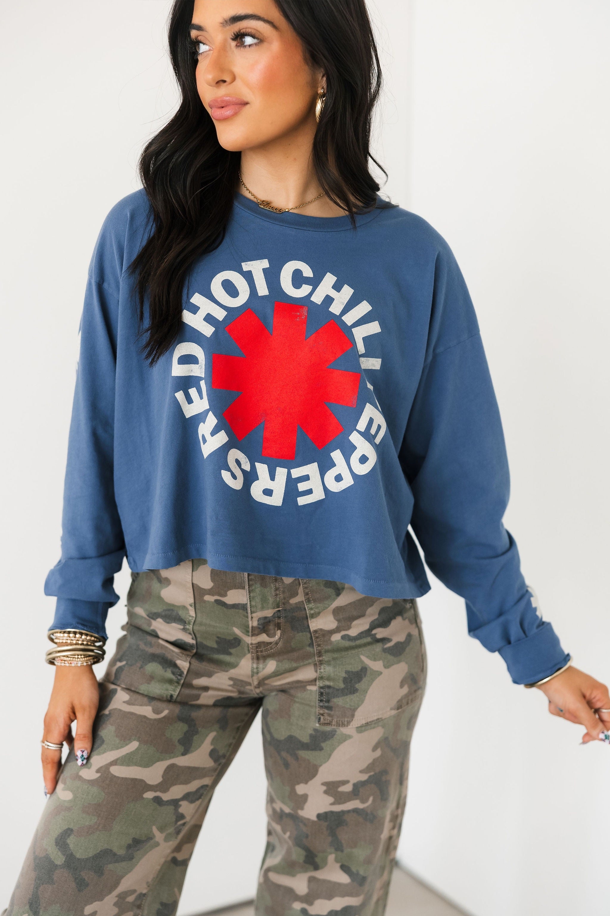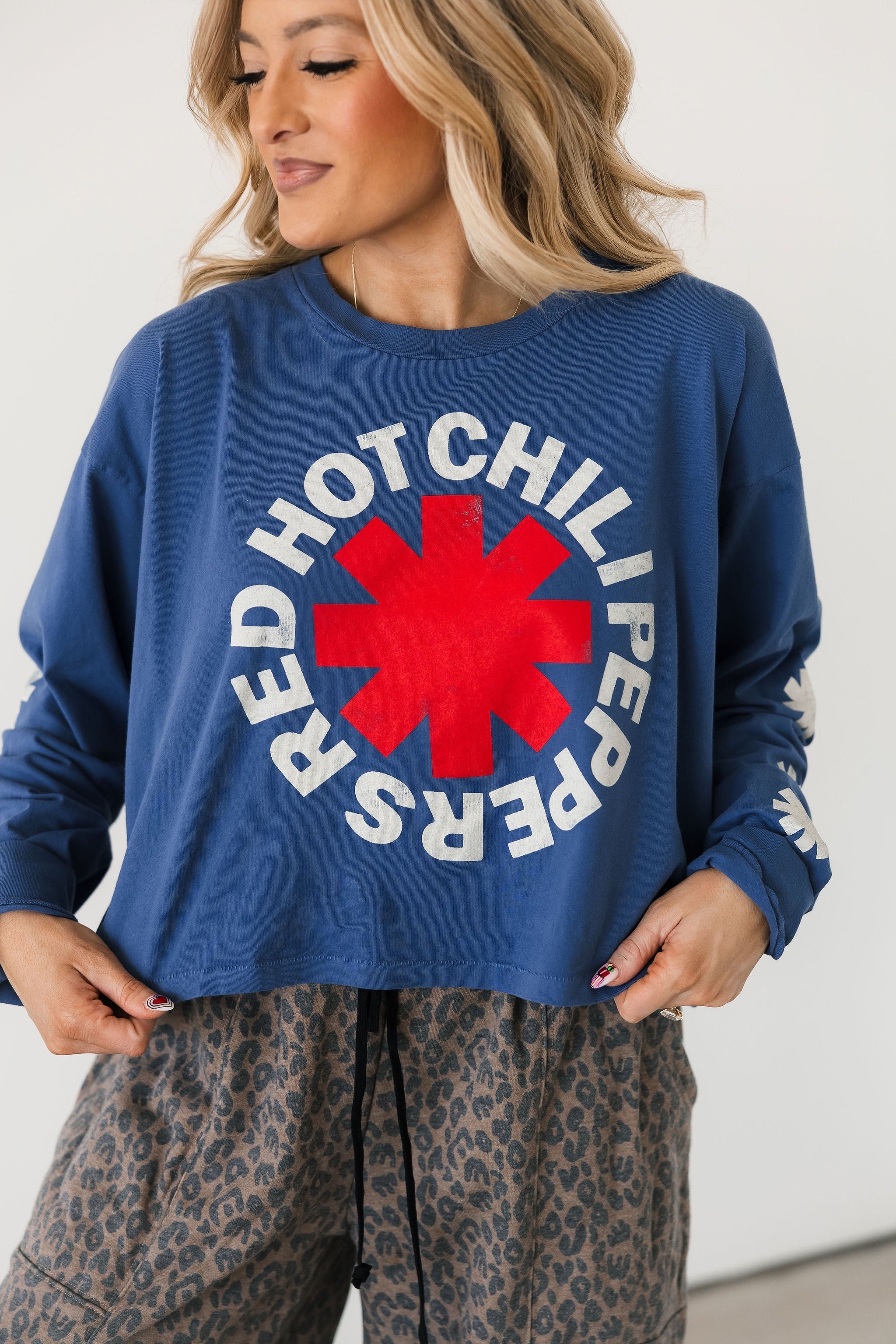 The Daydreamer Red Hot Chili Peppers Asteriskis Meet & Greet Long Sleeve features a relaxed fit with a classic crew neckline and long sleeves. Designed with Daydreamer’s signature soft fabrication, it has that perfectly worn-in feel that makes it an instant go-to for casual days, layering seasons, and year-round wear. Lexi and Sage are both wearing an xs.