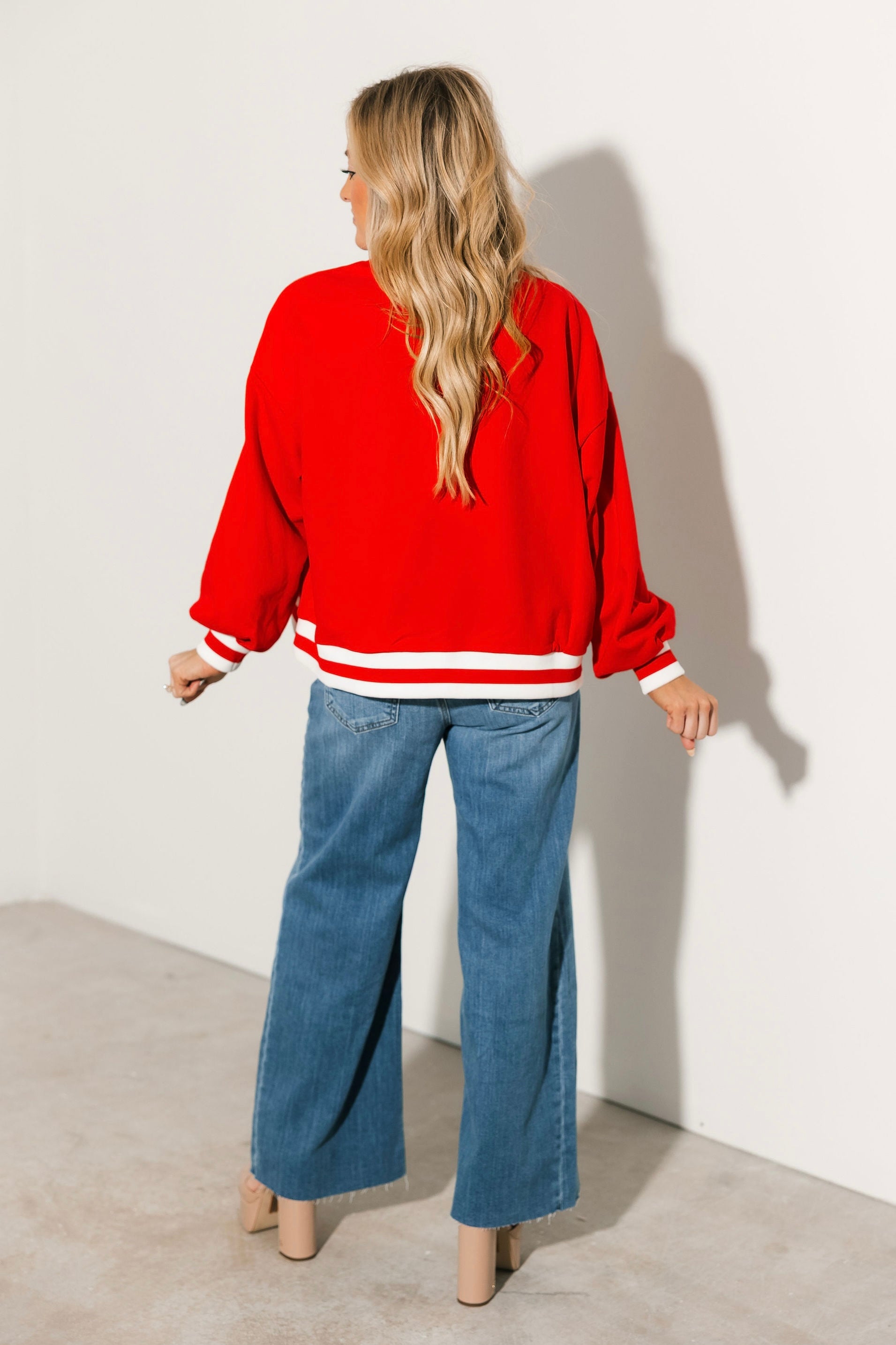 Bring the sparkle to game day with the Queen Of Sparkles Red Jeweled Basketball Sweatshirt. Designed in a bold red hue and accented with dazzling jeweled basketball graphics, this relaxed-fit sweatshirt blends cozy comfort with statement-making style. Whether you're courtside or cheering from home, it's the perfect mix of sporty and chic. Lexi Jade is wearing an XS.