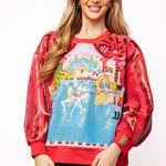 The Queen Of Sparkles Red Nutcracker Ballet Stage Scene Sweatshirt features a relaxed fit with a classic crewneck and long sleeves. Decorated with a sparkling graphic of the Nutcracker ballet stage, this cozy piece is perfect for holiday gatherings, festive outings, or adding a whimsical, seasonal touch to your wardrobe.