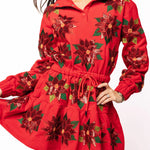 Red Poinsettia Button Up Mock Neck Tie Sweatshirt Dress | Queen Of Sparkles