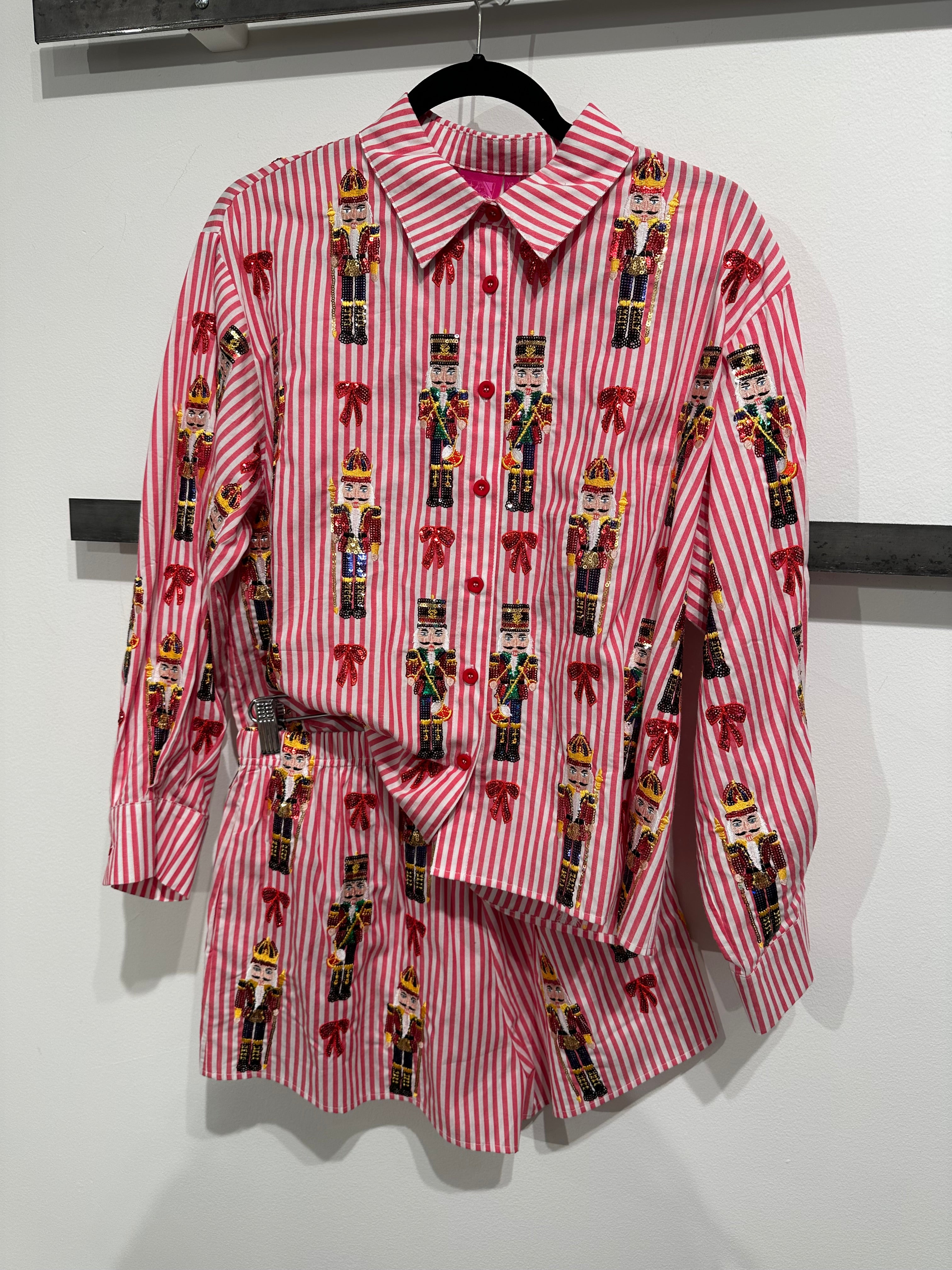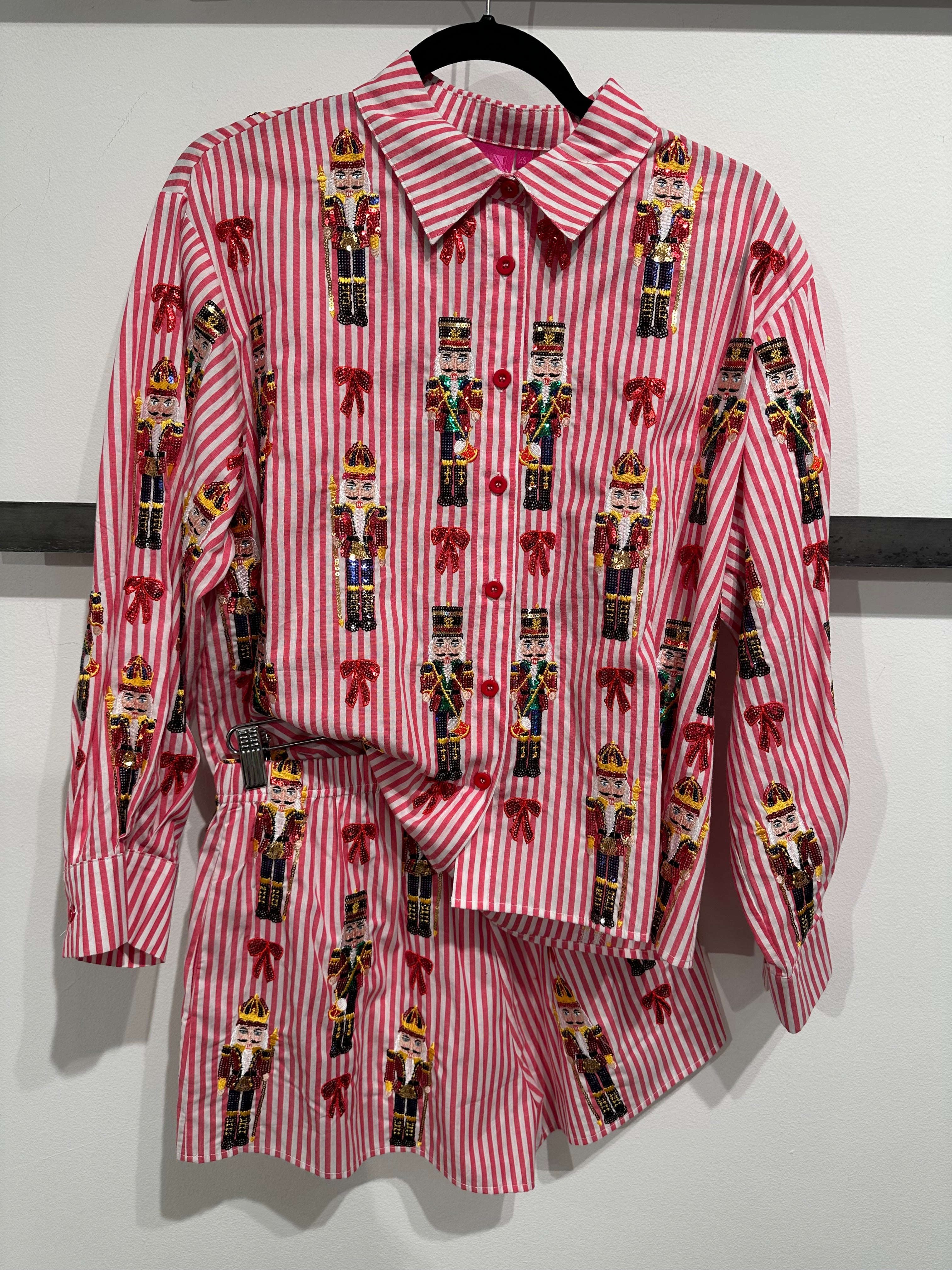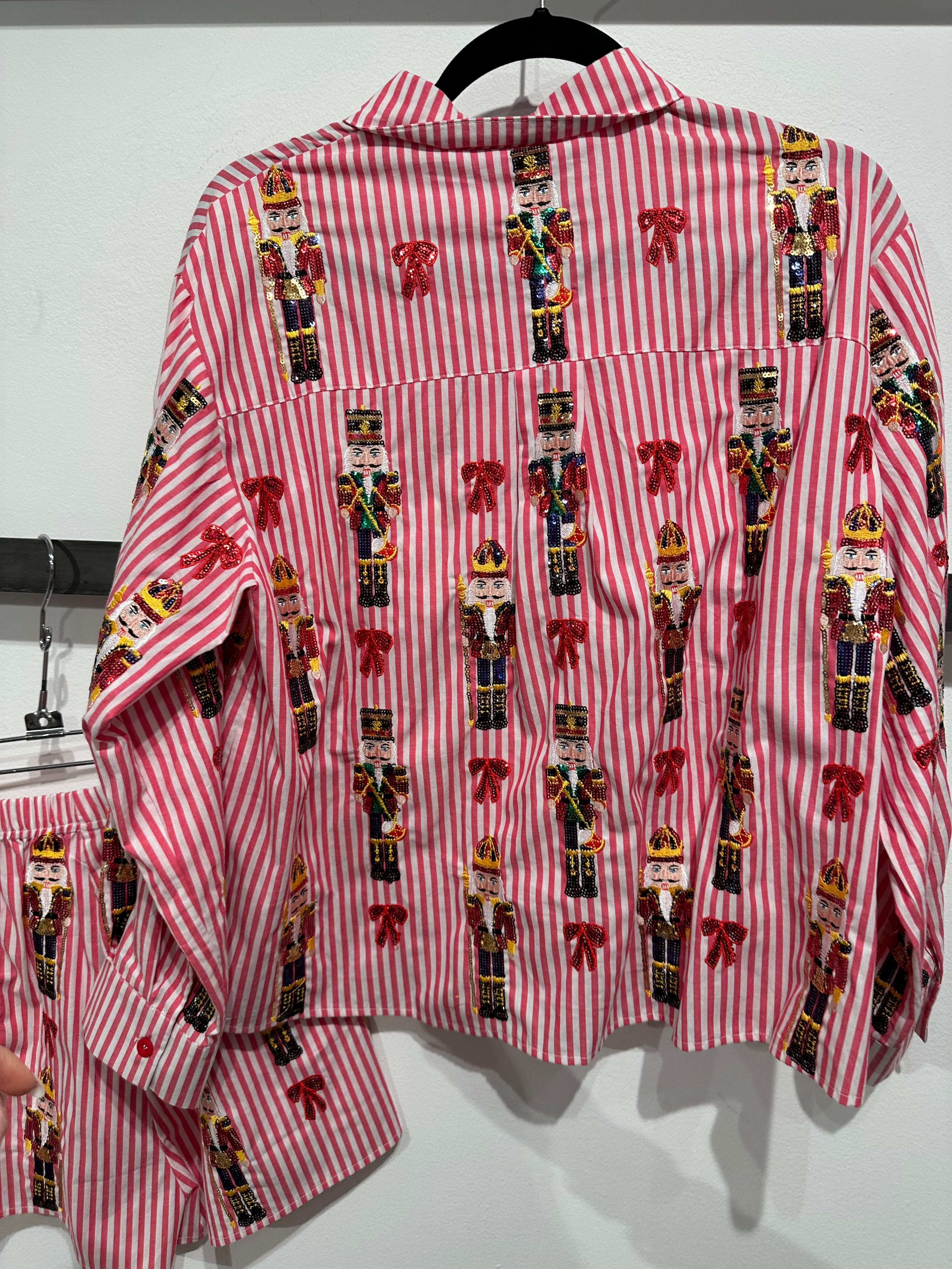- Why We ❤ It: A playful twist on a classic button-up—festive stripes meet sparkling nutcracker and bow details for the perfect statement top.