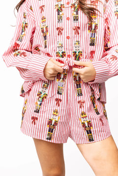 Red Stripe Scattered Nutcracker & Bow Cotton Button Up Top | Queen Of Sparkles