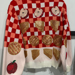 The Queen Of Sparkles Red & White Checkered Apple Pie Button Up Cardigan features a relaxed fit with a classic V-neckline, functional button-up front, and long sleeves. Designed with a cheerful checkered print and accented by sparkling apple and apple pie graphics, it’s a whimsical statement piece that’s as cozy as it is festive. Perfect for Thanksgiving gatherings, seasonal parties, or adding a touch of holiday fun to your everyday style.