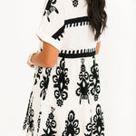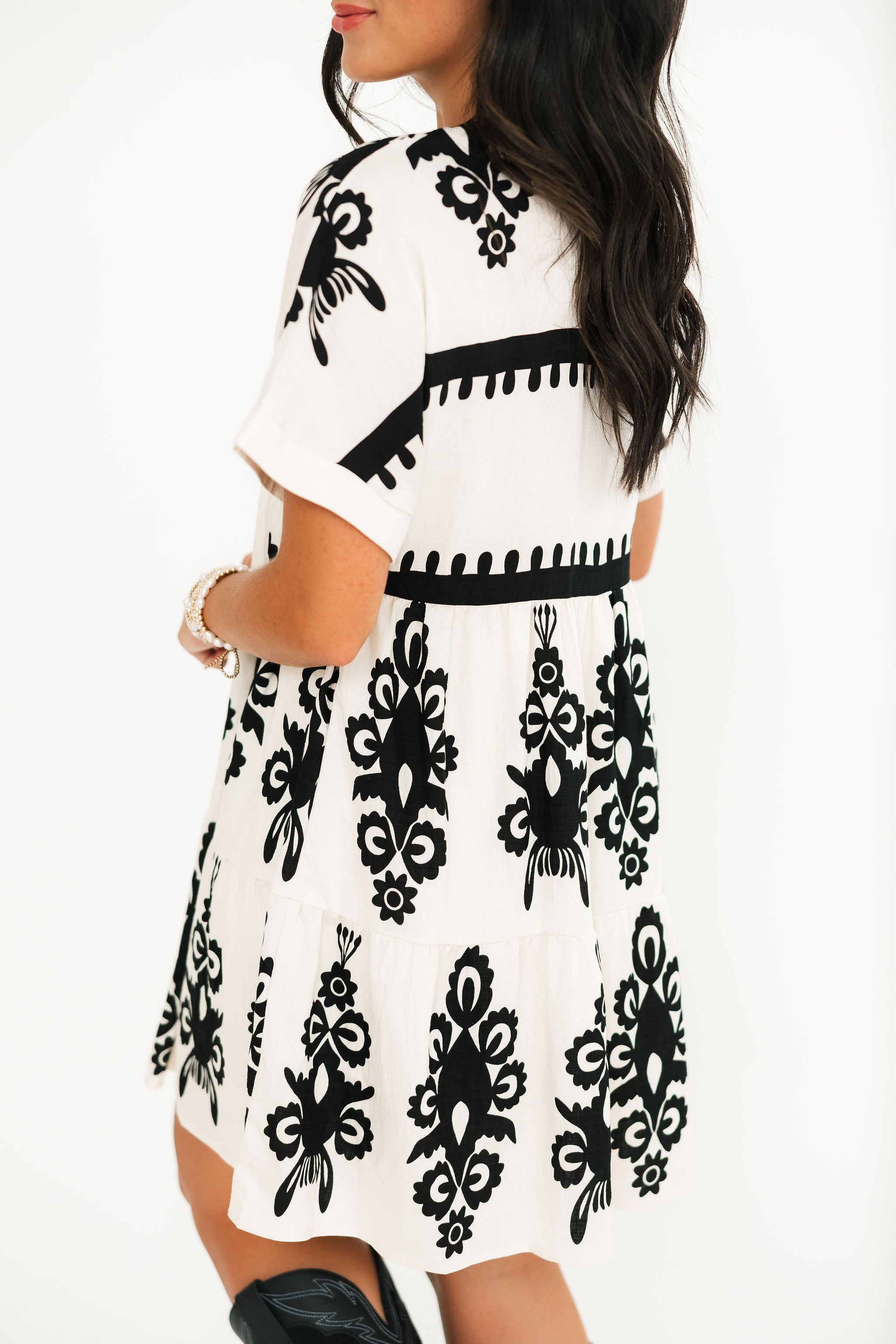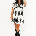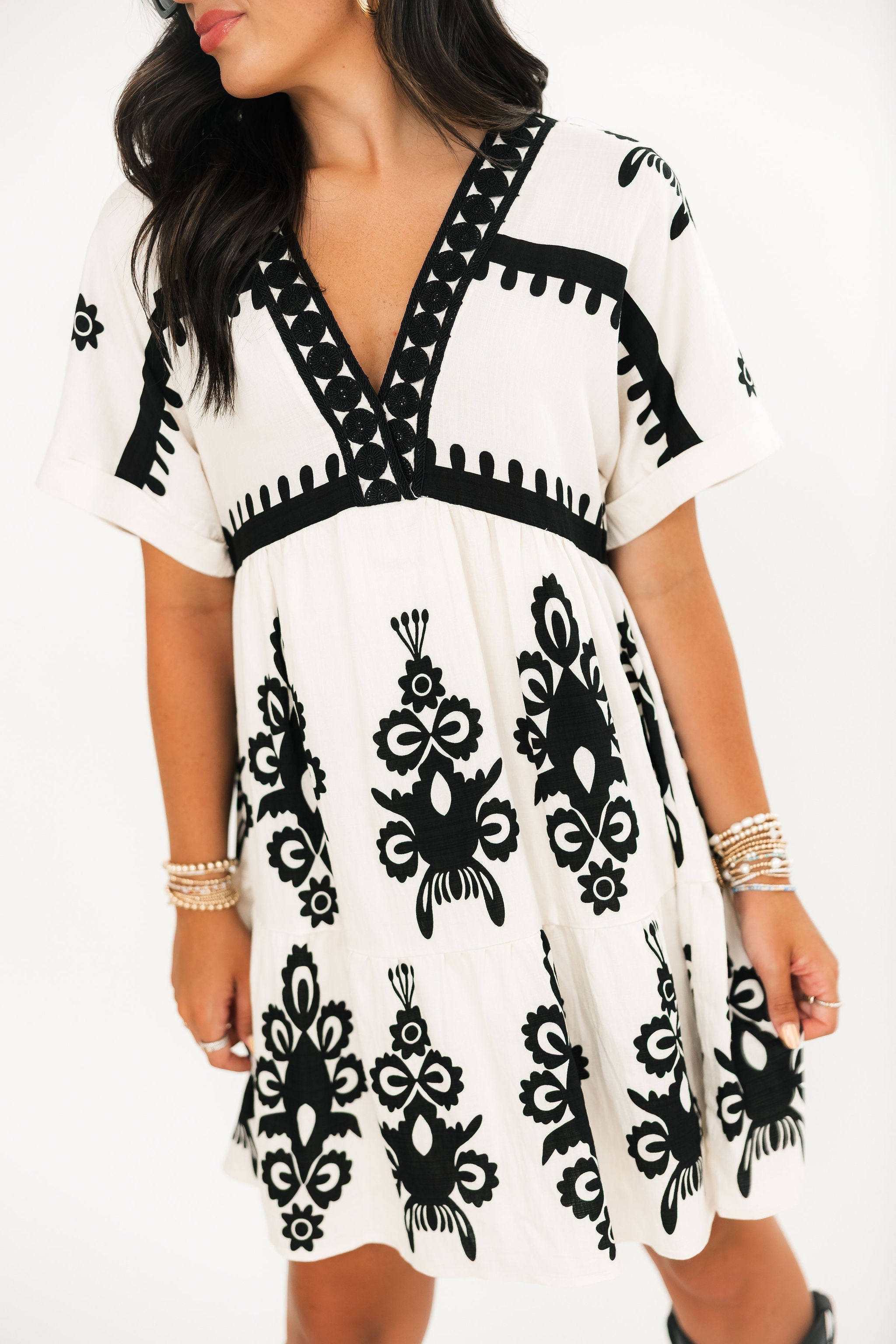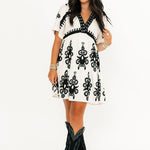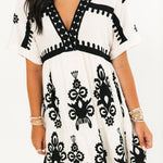 Breezy, bold, and effortlessly chic—this neutral resort-style mini dress is your go-to for sun-soaked escapes and laid-back weekends. Featuring a relaxed silhouette with oversized sleeves and a deep V-neckline, it’s adorned with striking ivory embroidery that adds a luxe, artisan touch. The soft, lightweight fabric keeps you cool and comfortable from beach strolls to brunch dates. Sage is wearing a small.