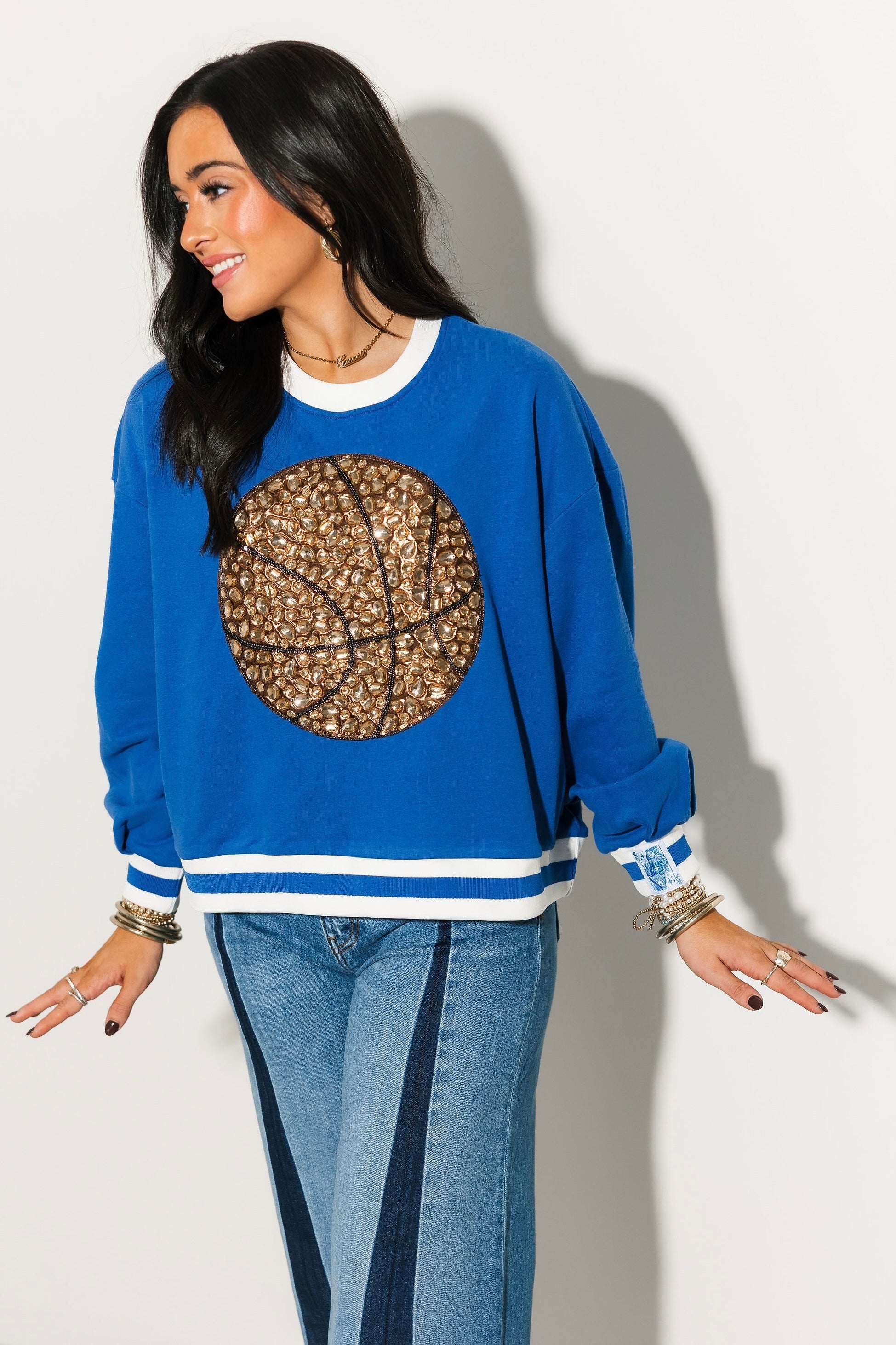 - Why We ❤ It: A bold gameday statement piece—this royal blue sweatshirt shines with its jeweled basketball graphic, blending sporty energy with signature sparkle.