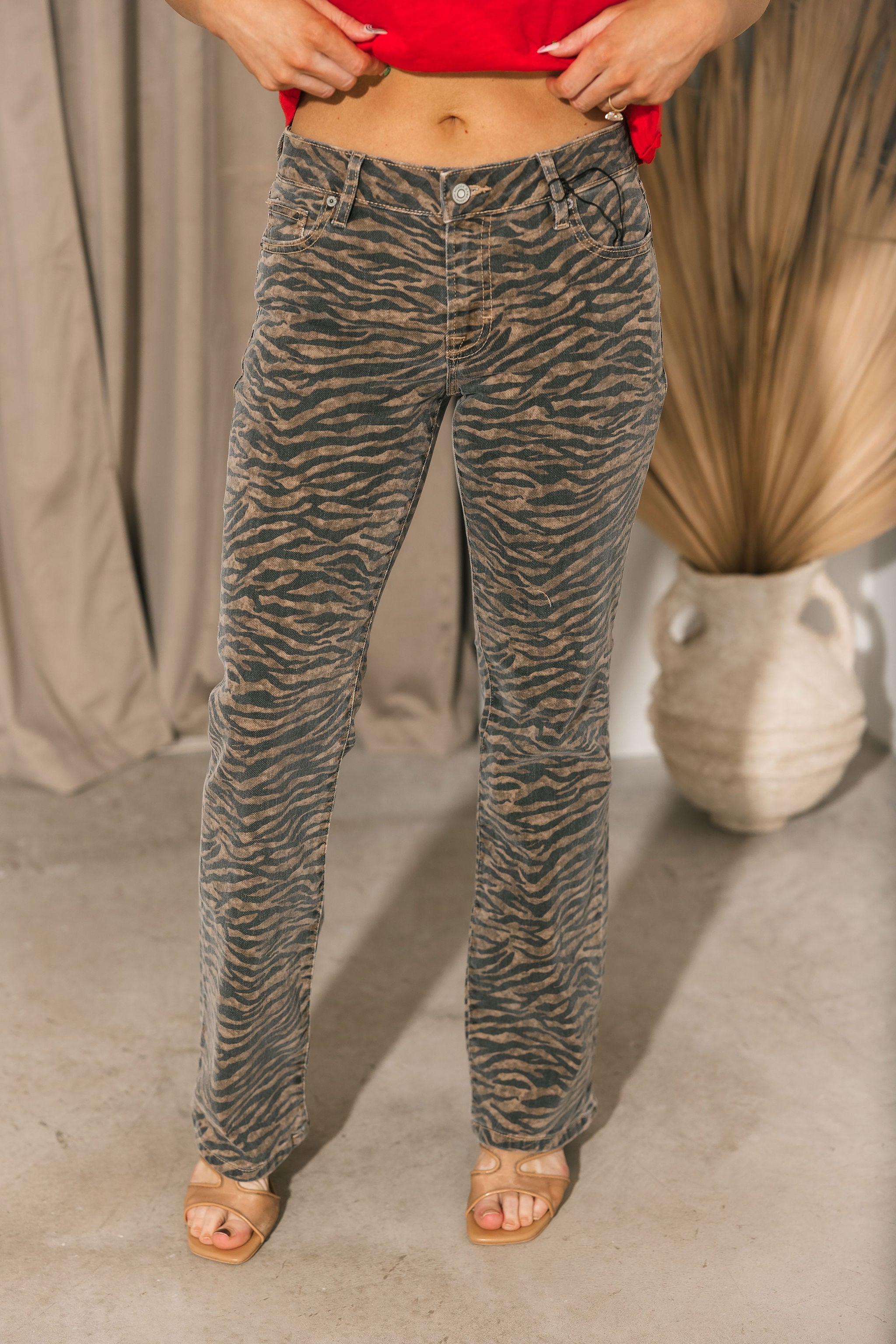 The Ryan Boot Cut Jeans in Tiger feature a low-rise waist with a classic bootcut leg that elongates the silhouette. The eye-catching tiger print adds a fierce edge to any outfit. Style them with a simple tee or cropped sweater to let the print do all the talking.