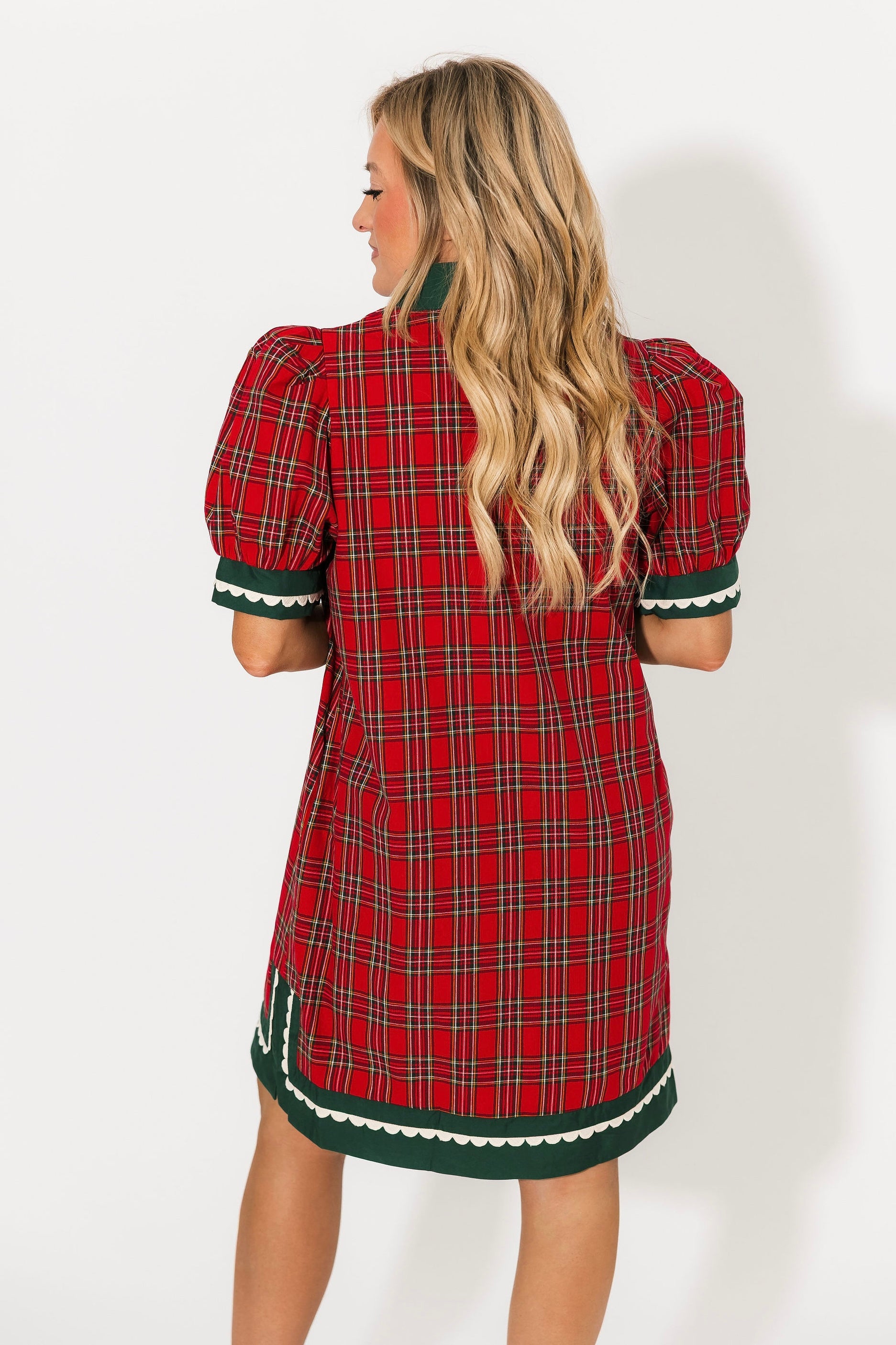 The Santa Baby Mini Dress in red features a plaid pattern and relaxed silhouette, making it the perfect mix of comfort and style. Designed with short puff sleeves, contrast accents, and a caftan-inspired band, it offers subtle structure while keeping things easy to wear. Finished with side pockets and a slit hem, it’s a go-to piece for casual gatherings and cozy holiday outings. Lexi is wearing a small.