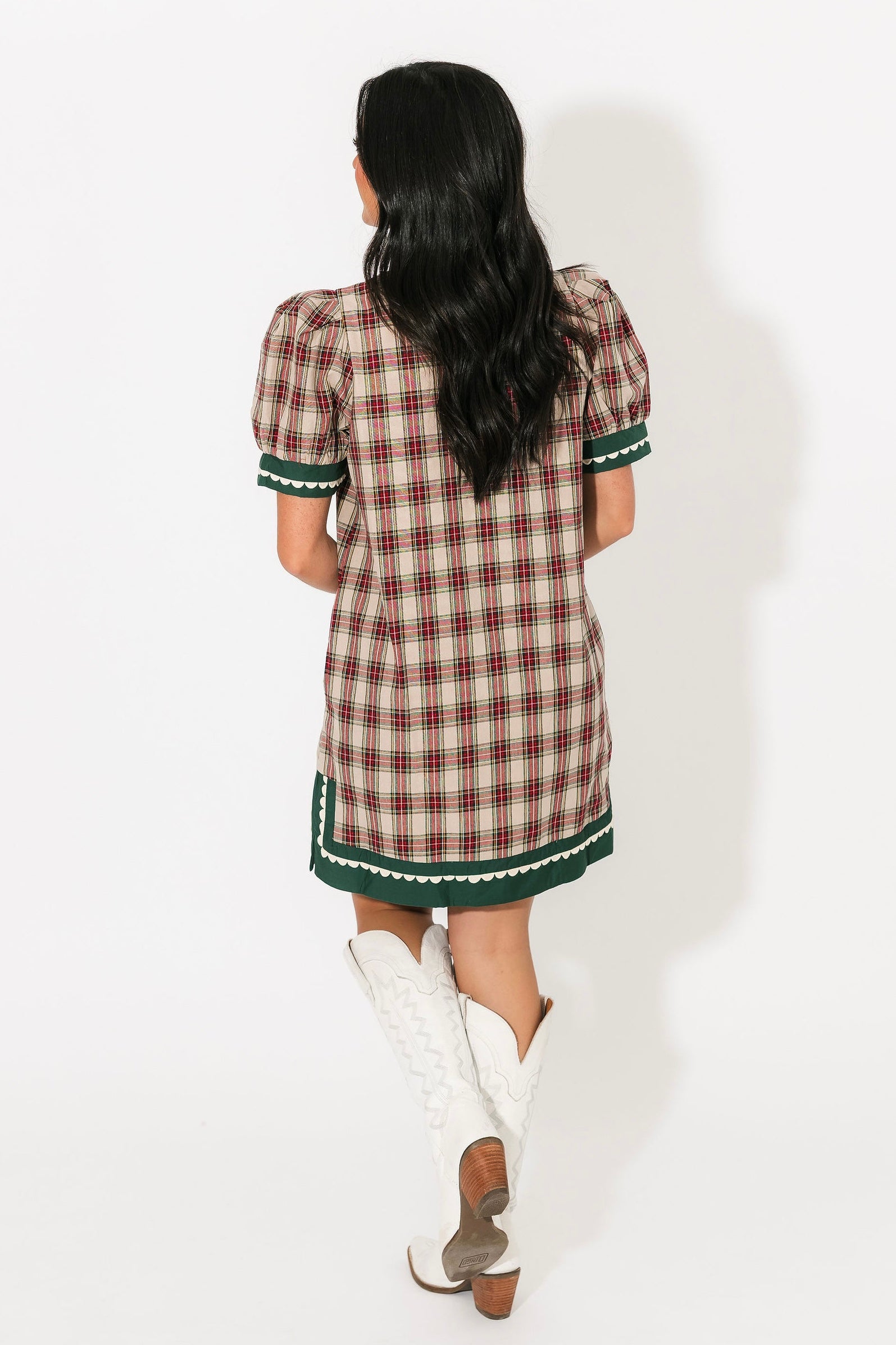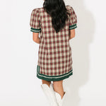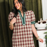The Santa Baby Mini Dress in Taupe features a soft plaid pattern and relaxed silhouette, making it the perfect mix of comfort and style. Designed with short puff sleeves, contrast accents, and a caftan-inspired band, it offers subtle structure while keeping things easy to wear. Finished with side pockets and a slit hem, it’s a go-to piece for casual gatherings and cozy holiday outings. Sage is wearing a small.