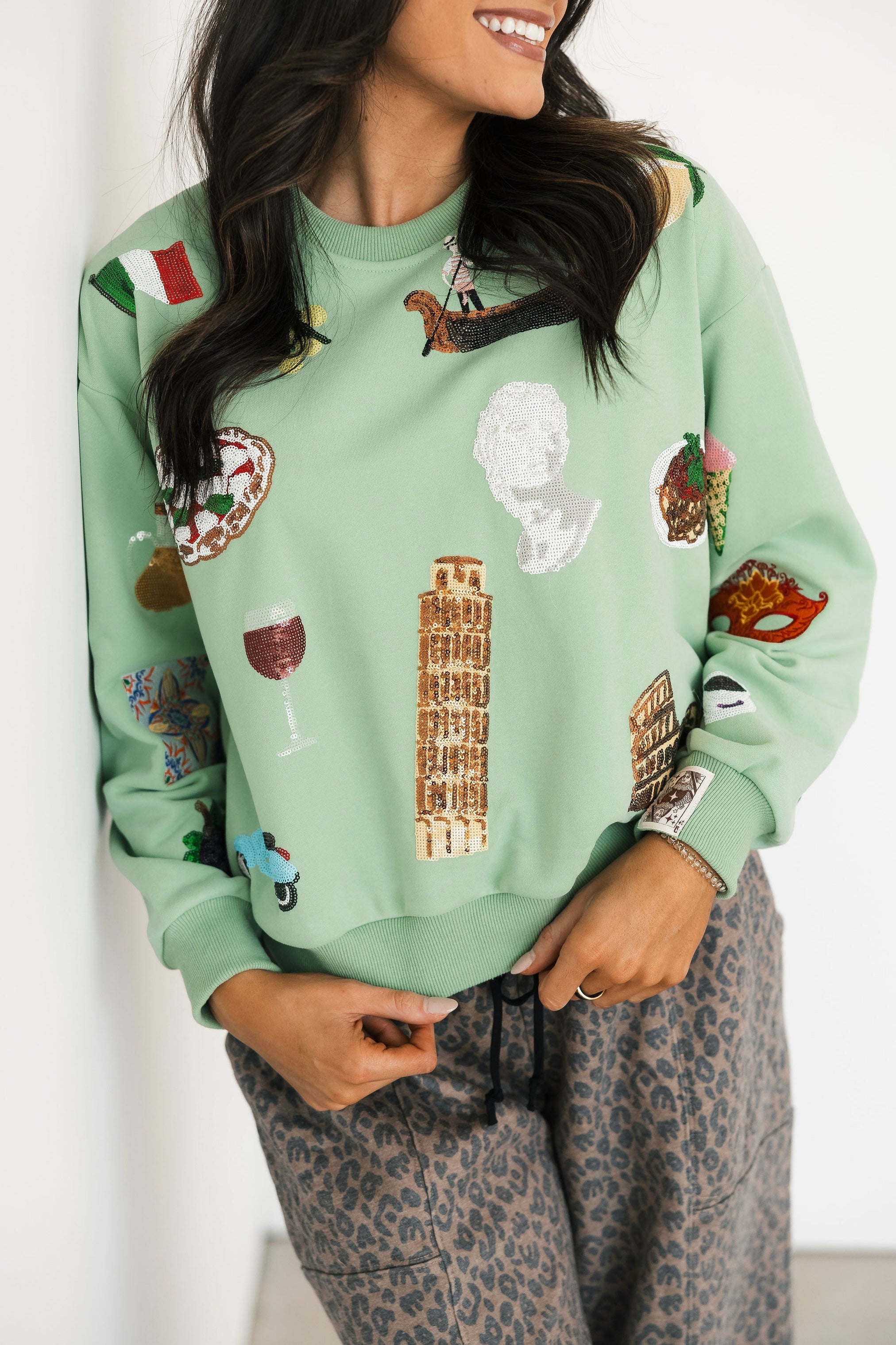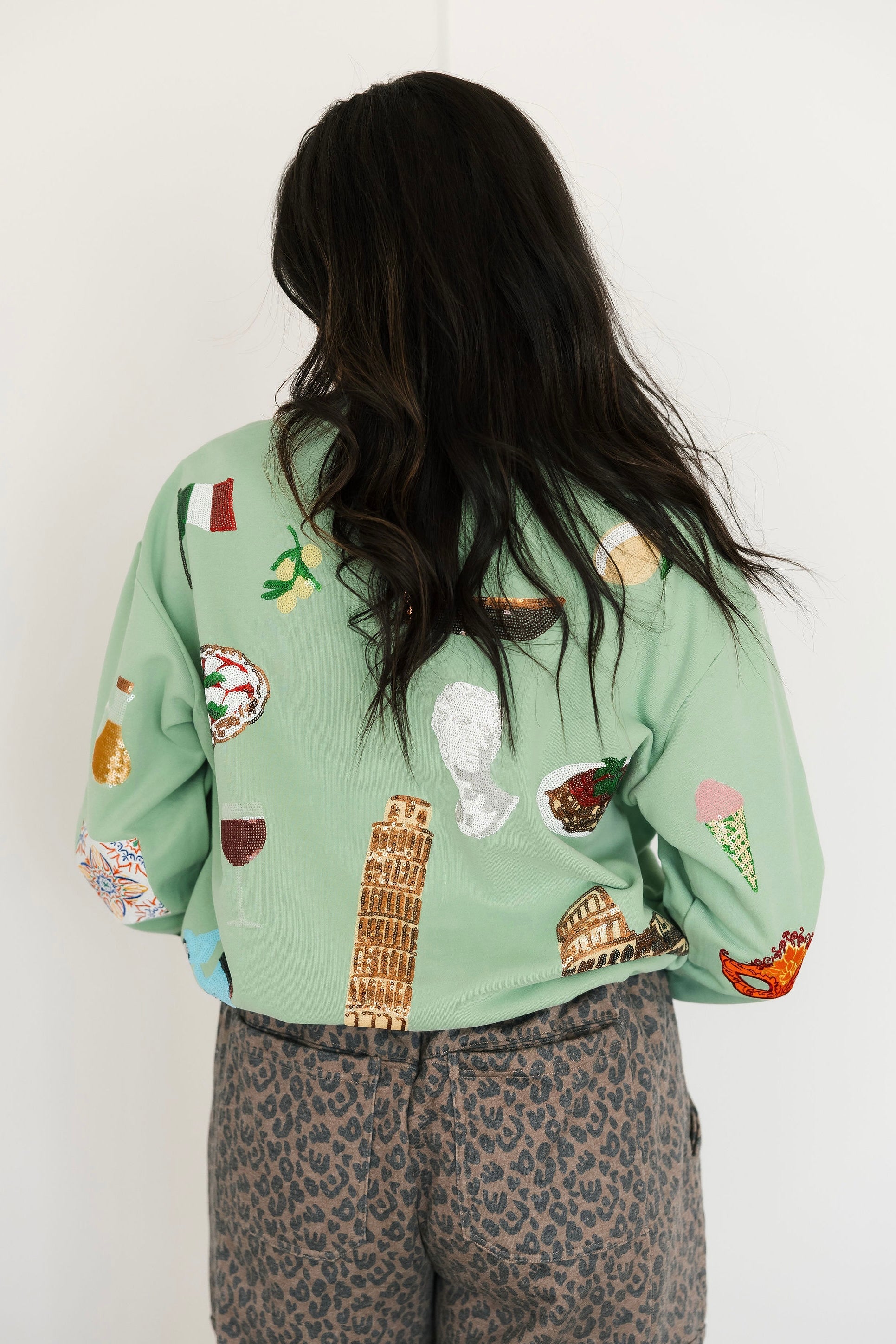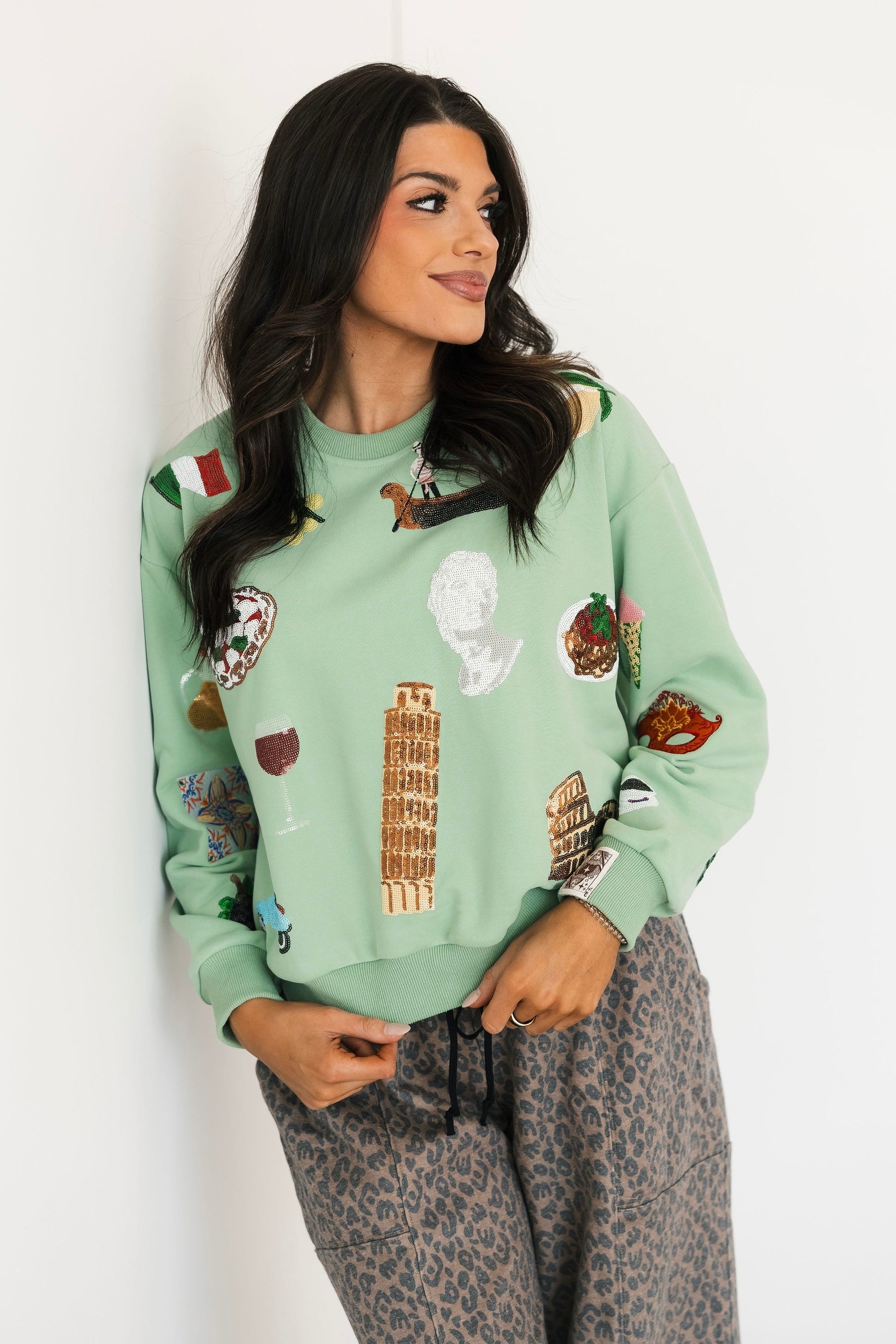 The Queen Of Sparkles Seafoam Scattered Italy Icons Sweatshirt features an oversized silhouette with a crewneck and long sleeves. Covered in whimsical Italy-inspired icons, it’s a fun, eye-catching piece that’s perfect for casual wear, lounging, or pairing with matching Queen Of Sparkles pieces. Harli is wearing an XS.