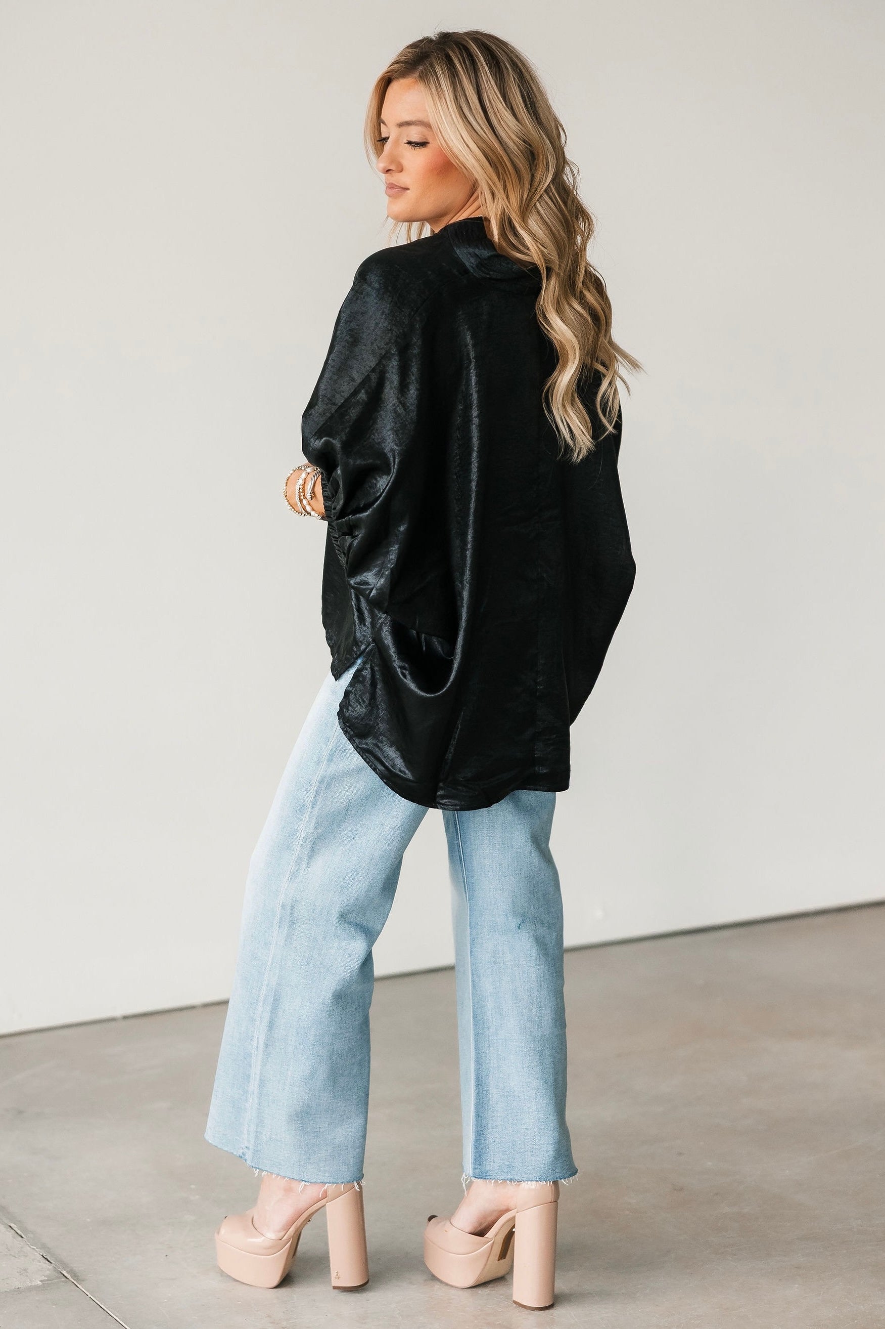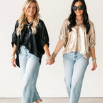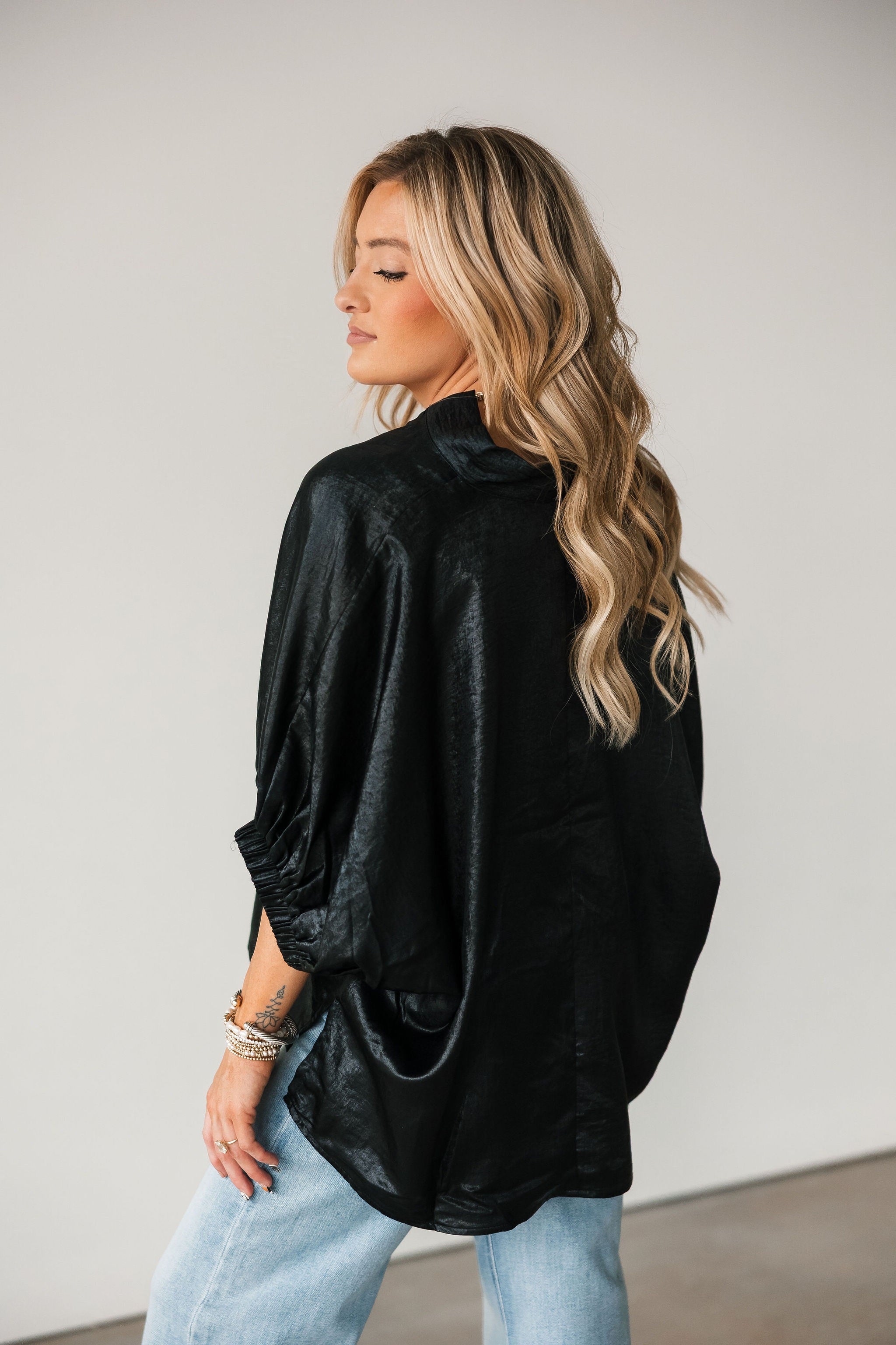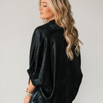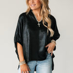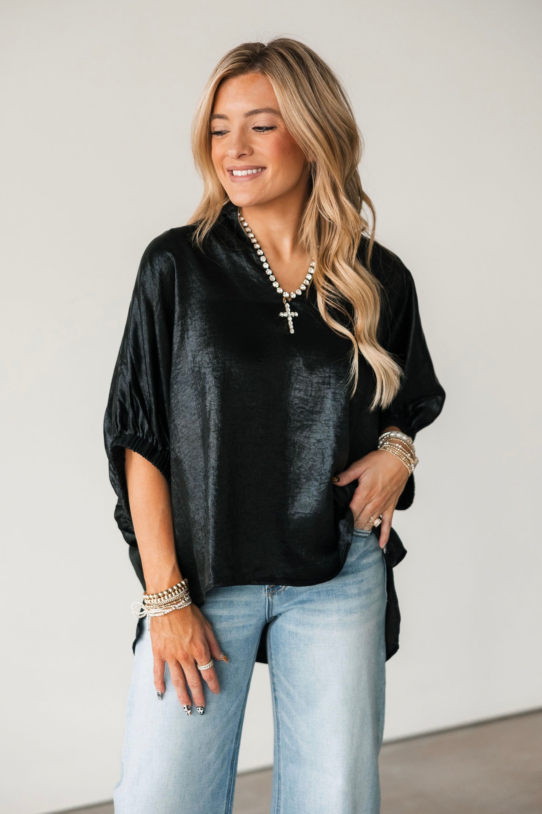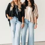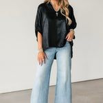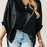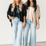 The Shine On Top brings an elevated glow to your wardrobe with its subtly shiny finish and relaxed, flowy silhouette. Designed with short elastic cuff sleeves and a flattering V-neckline, it drapes beautifully for an easy, polished look. Lightweight and versatile, it’s the ideal piece for holiday parties, date nights, or anytime you want to add a little sparkle without sacrificing comfort. Lexi is wearing a small.