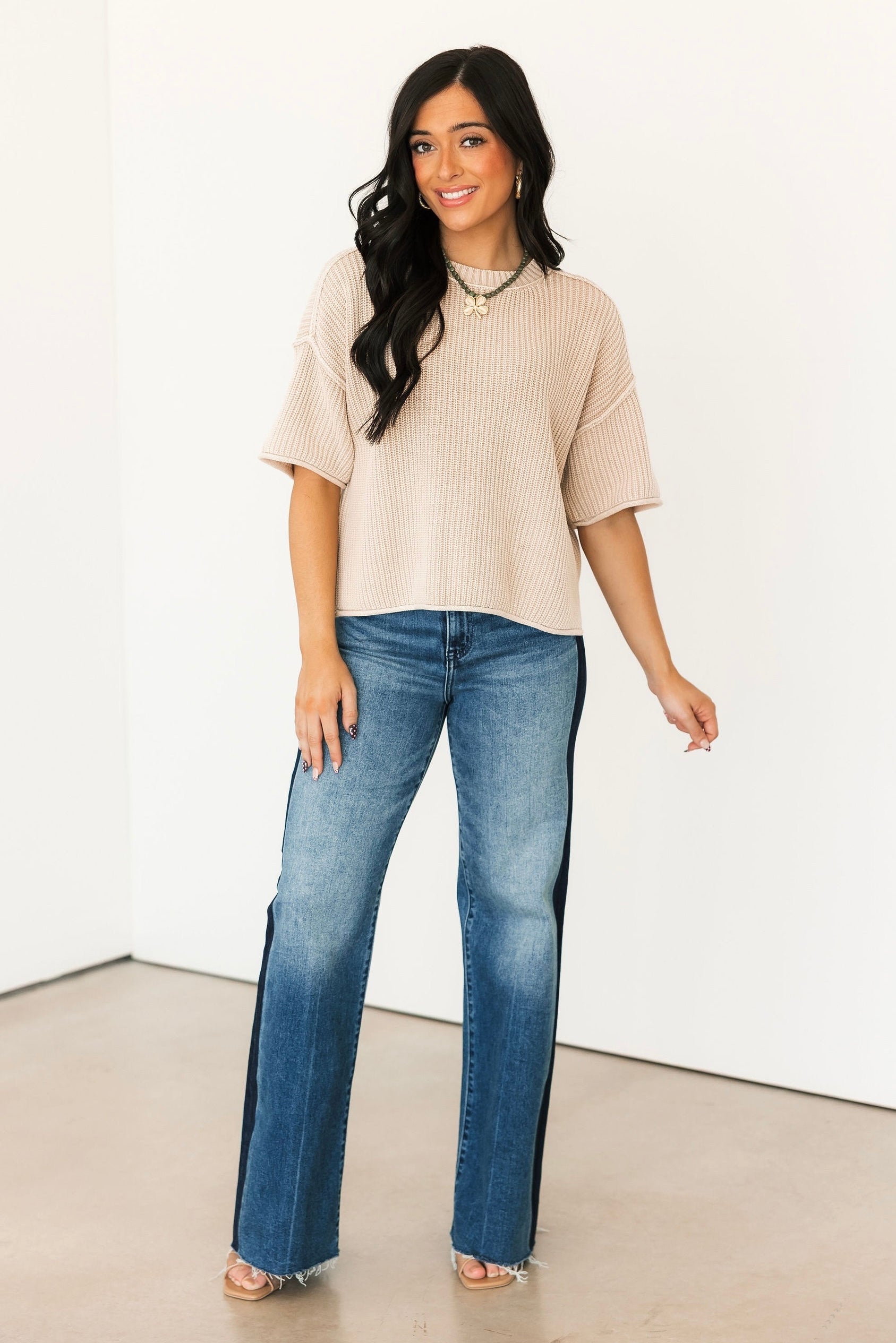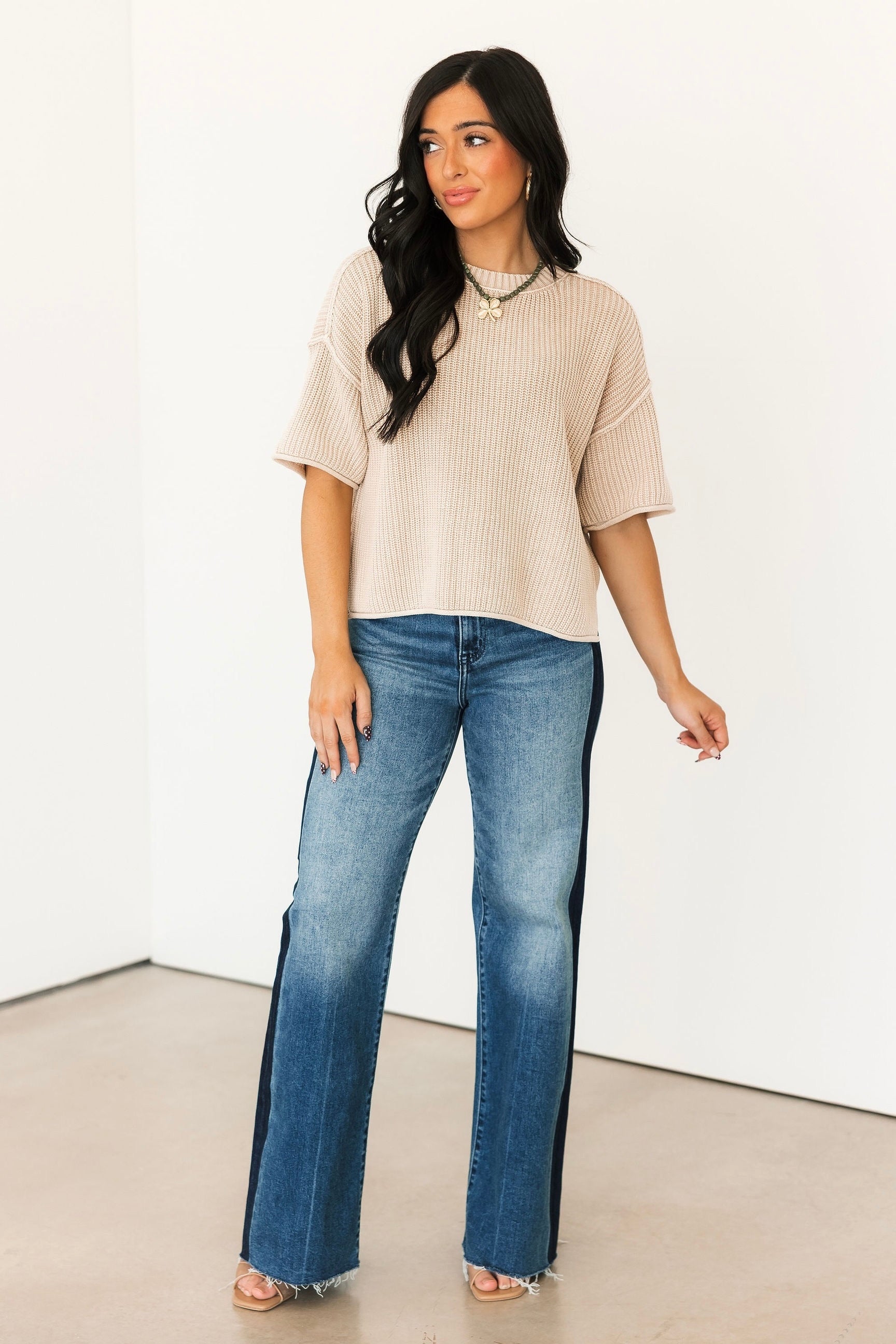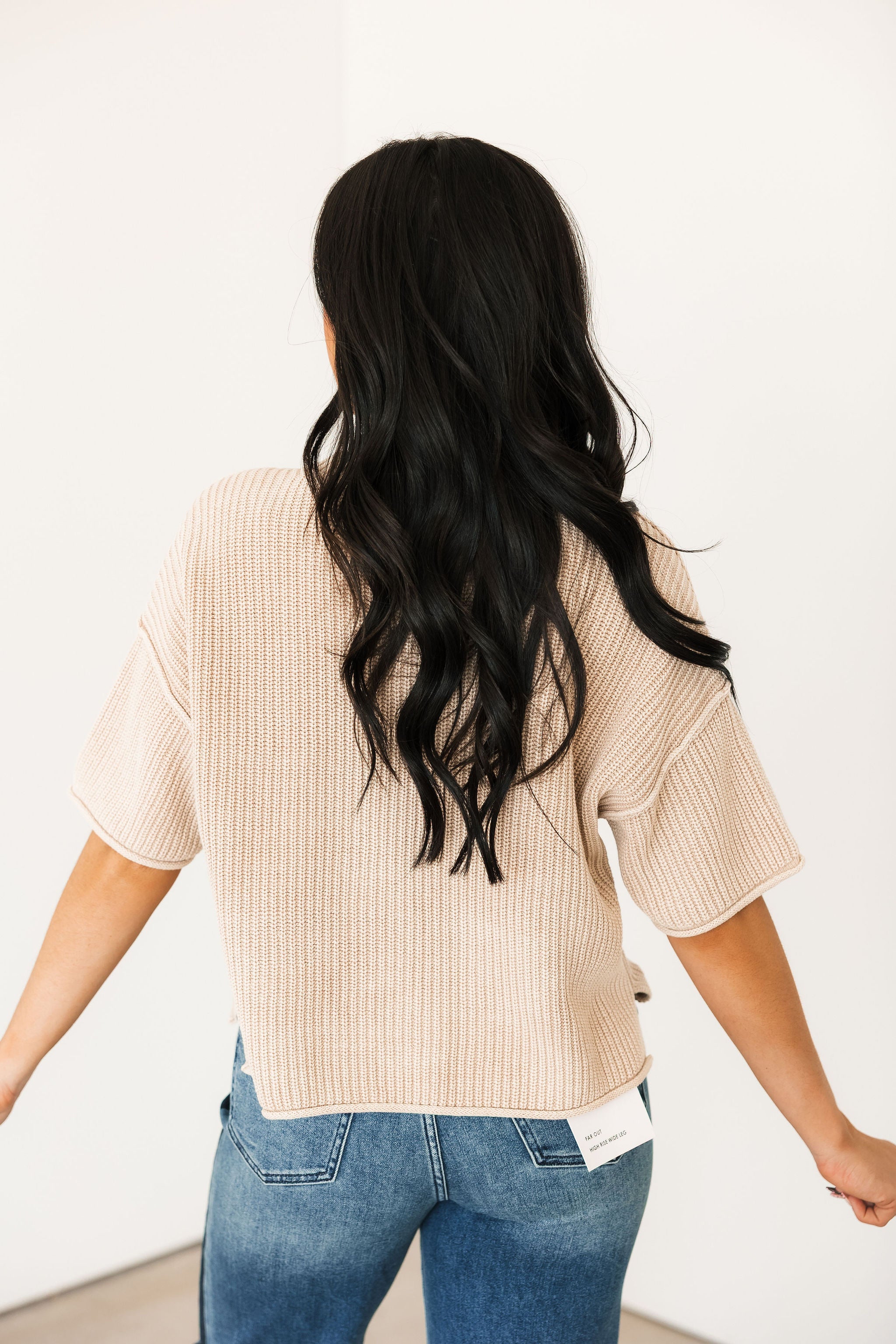 Our Short Sleeve Sweater in Khaki features a classic round neckline, short sleeves, and a relaxed drop-shoulder fit with exposed seaming and raw edge details. Timeless and easy to pair, it’s a versatile piece you’ll reach for again and again. Sage is wearing a small.
