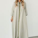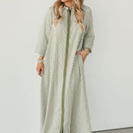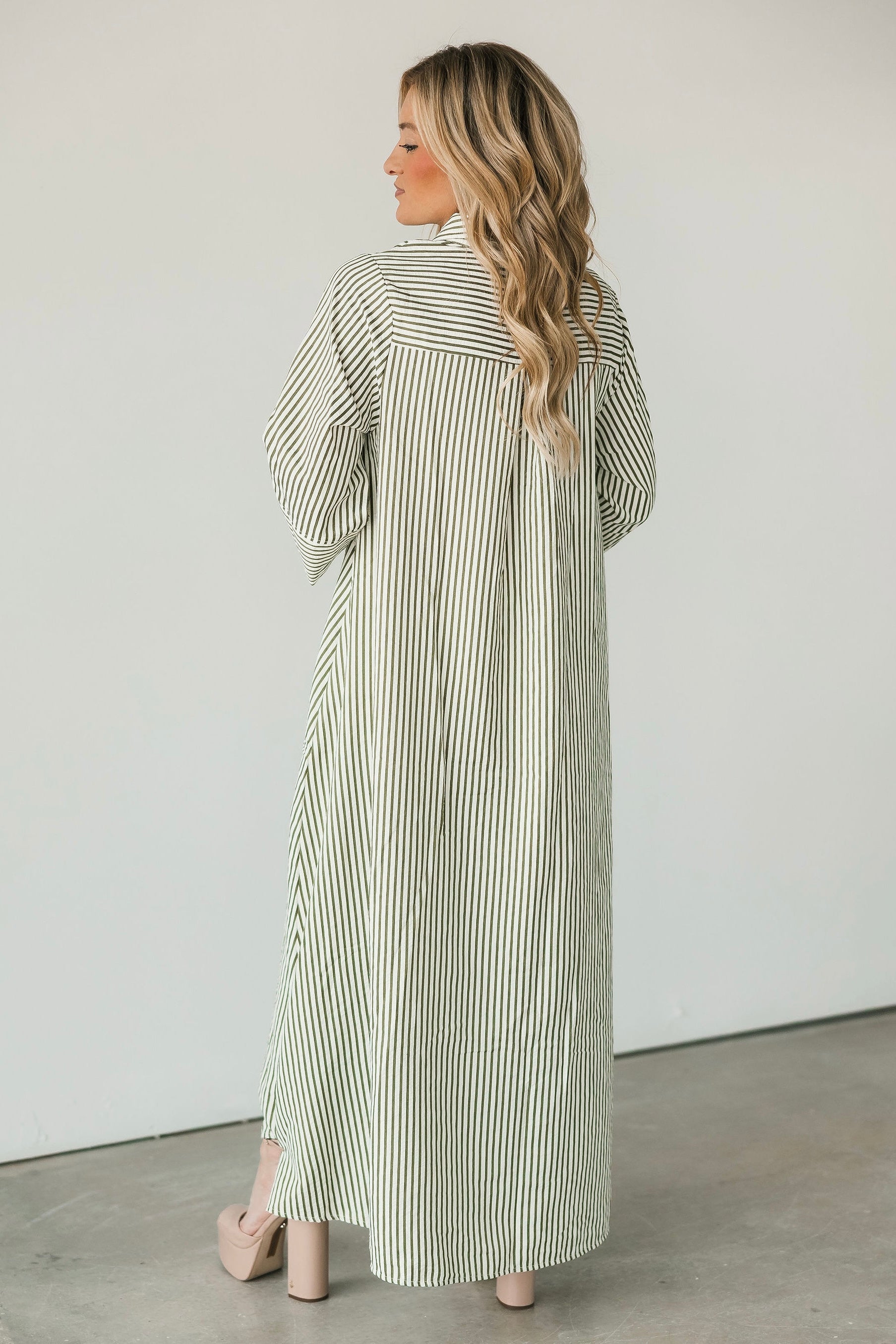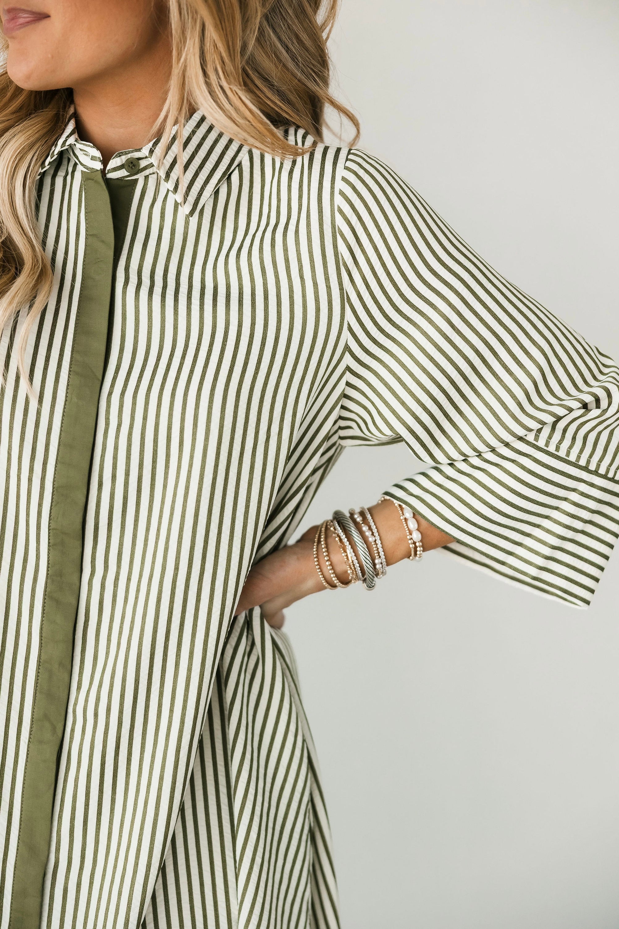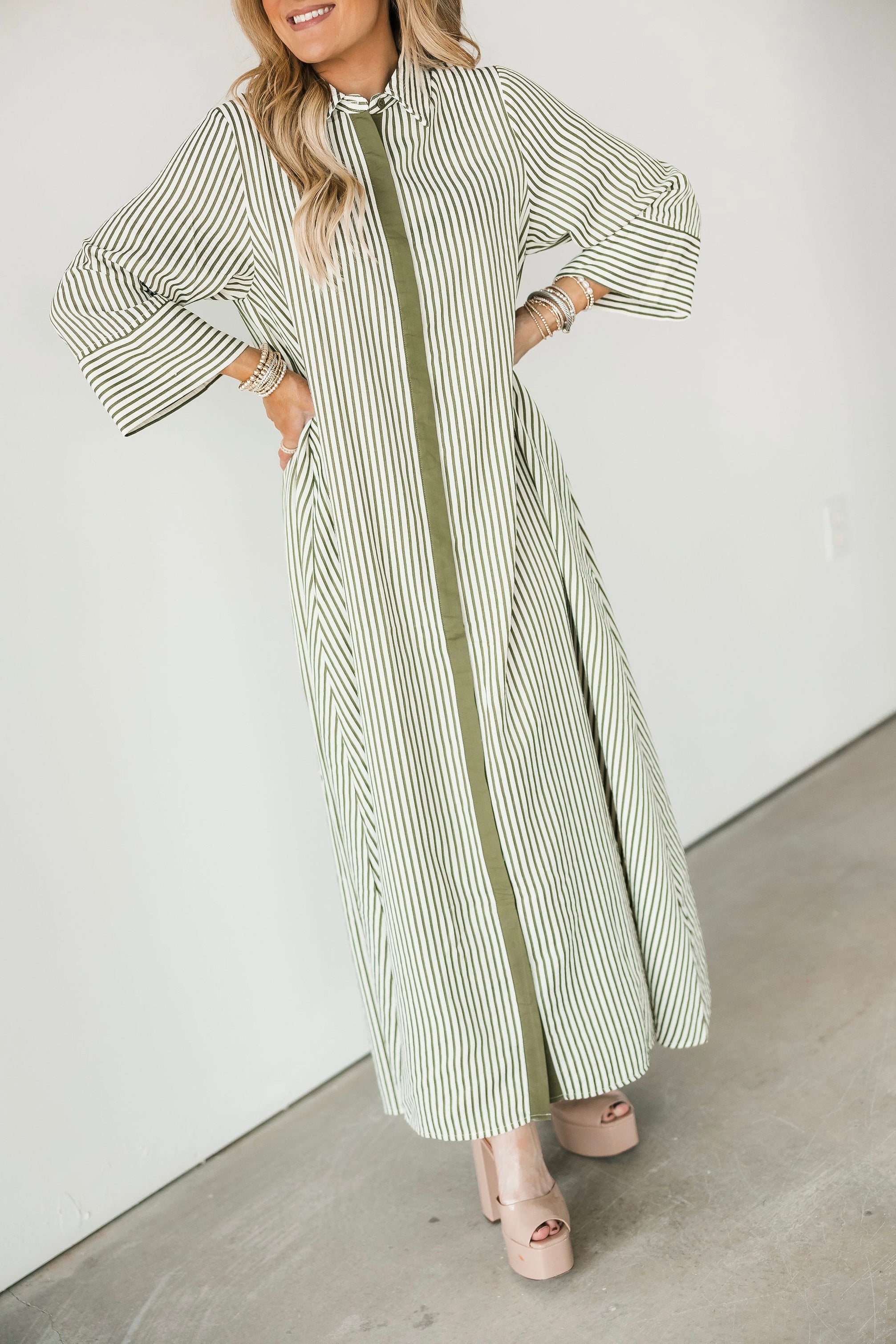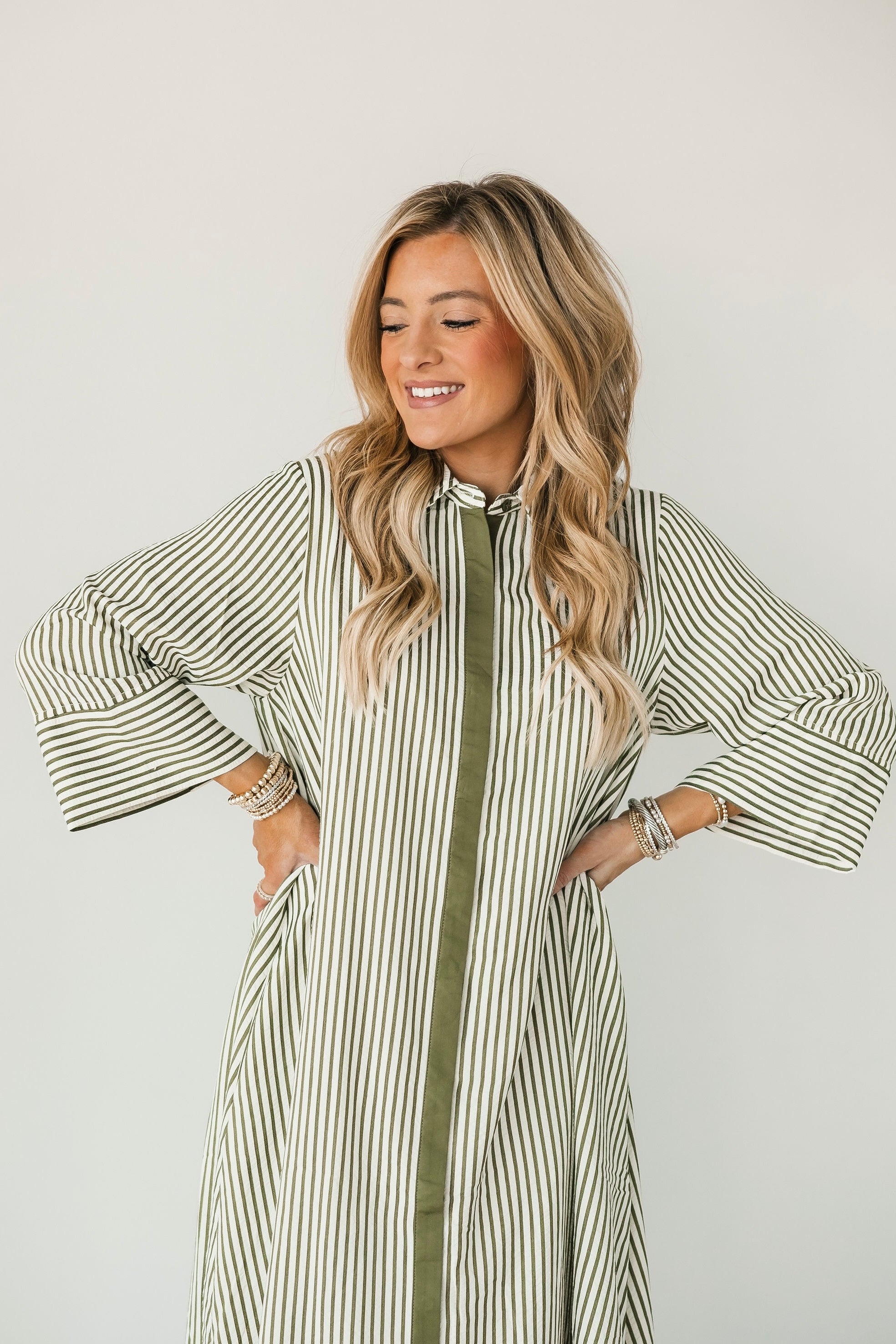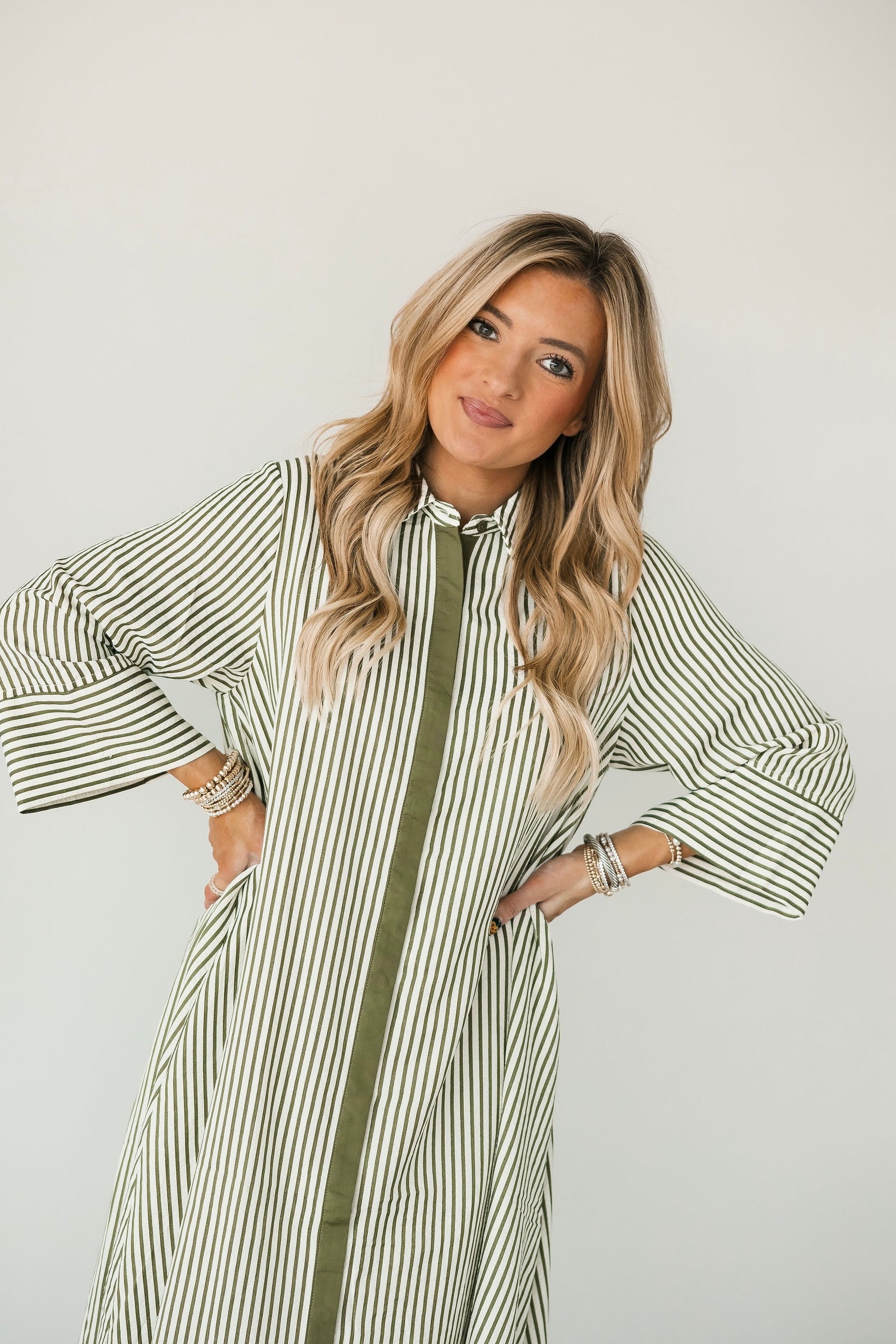 The Signature Stripe Midi Dress in Olive is an easy, everyday statement piece with a relaxed, billowy silhouette that drapes beautifully on the body. Designed with a classic shirt collar, 3/4 sleeves, and a button-front closure, it blends structure with flow for the perfect balance. The olive-toned stripes add a refined, timeless touch that works for both casual days and polished outings. Dress it up with boots or keep it relaxed with sneakers — it’s stunning either way. Lexi is wearing a small.