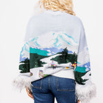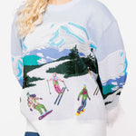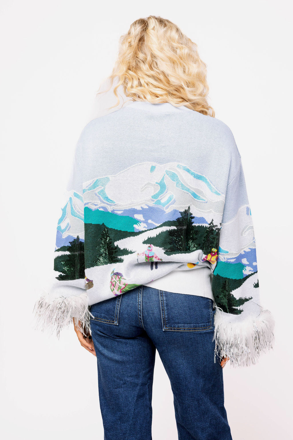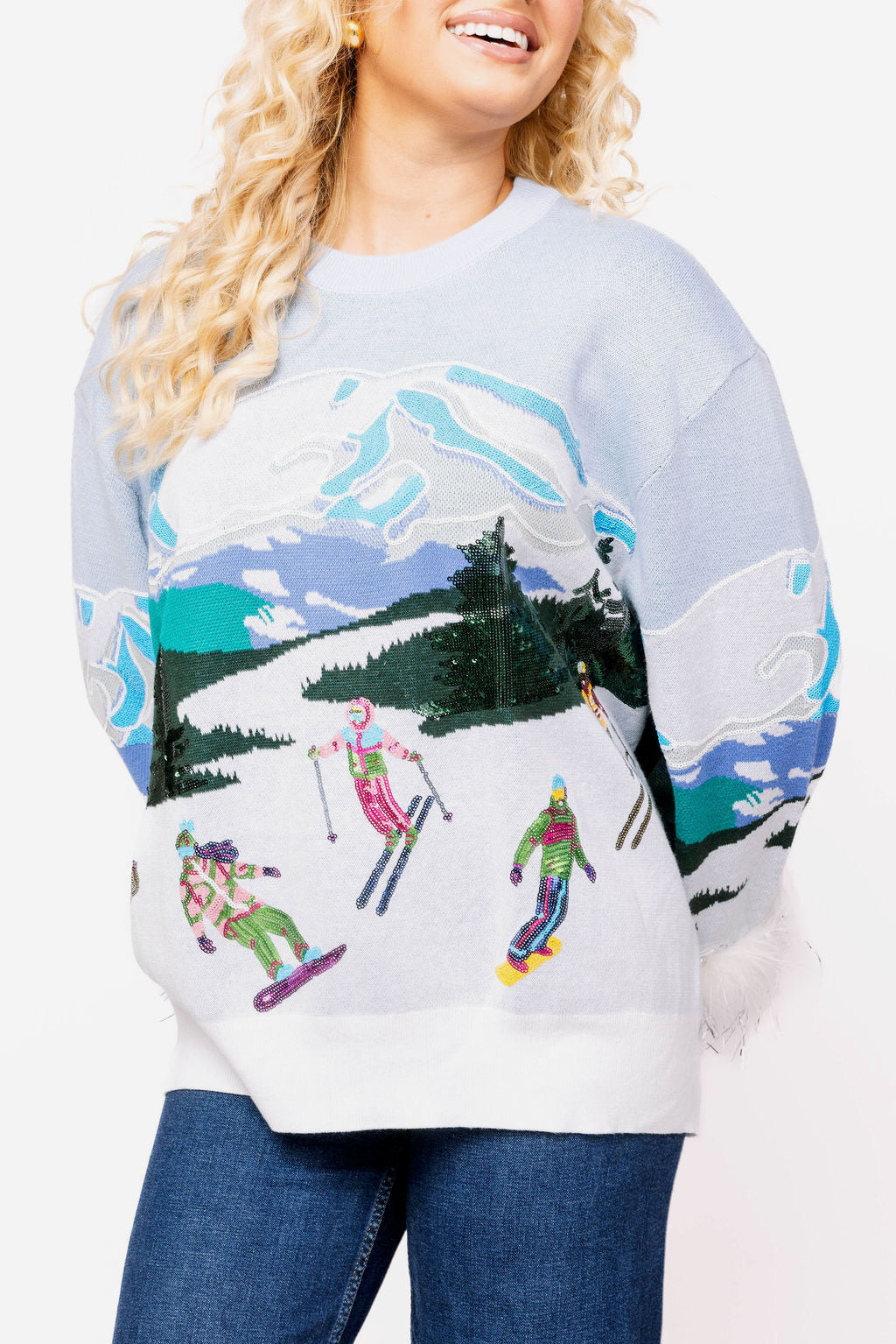 Skiers On Mountain Feather Sleeve Sweater | Queen Of Sparkles