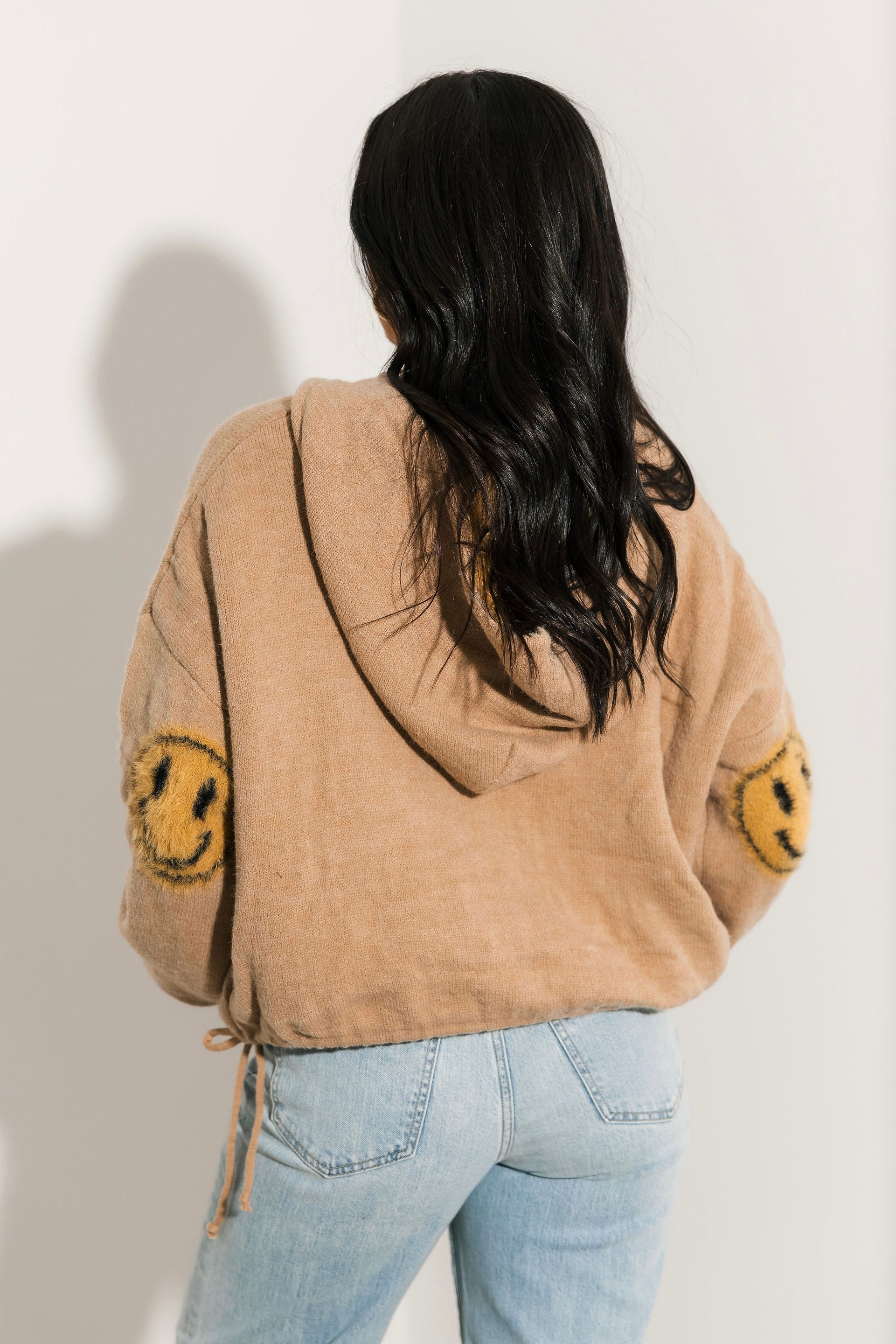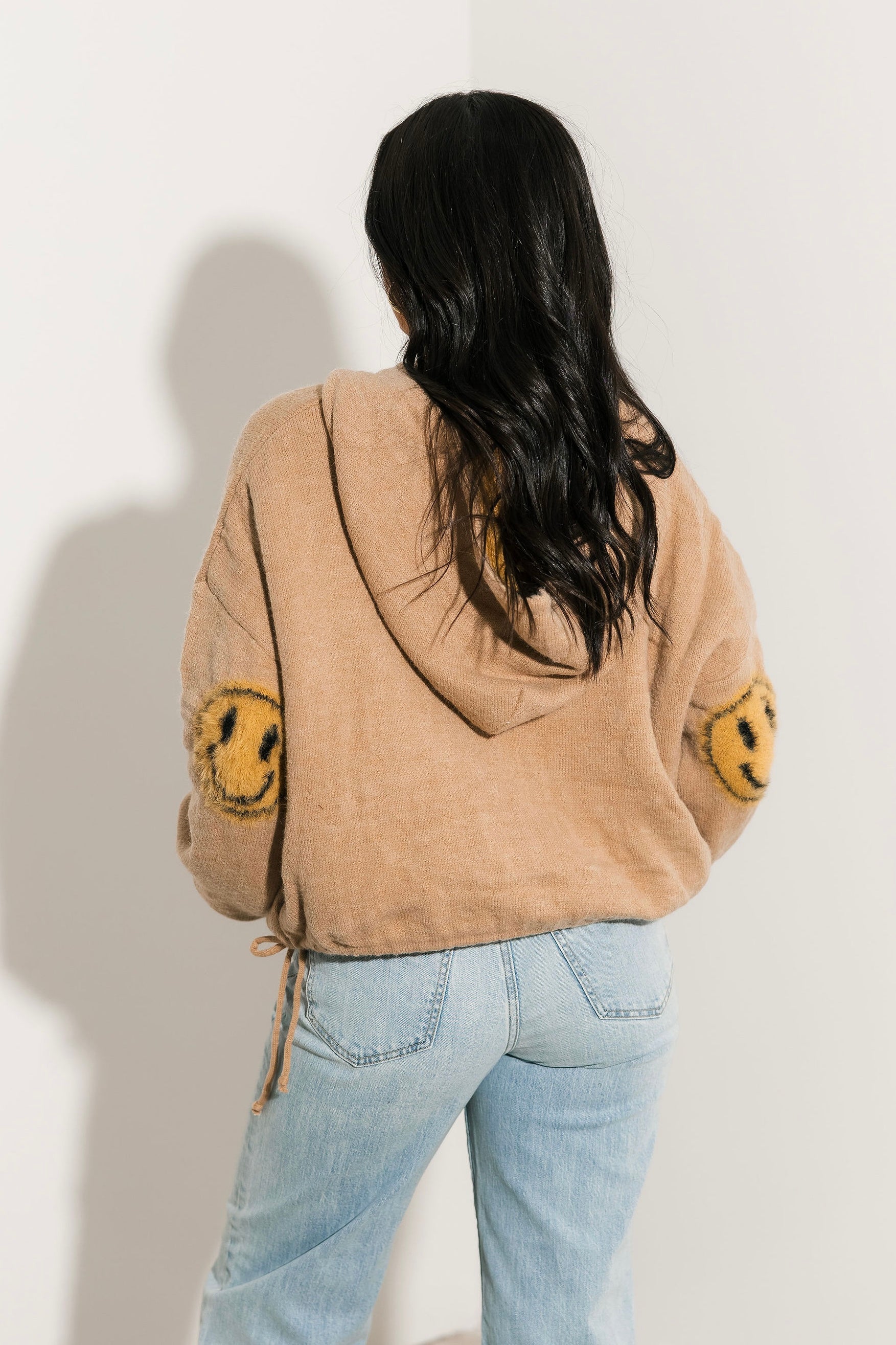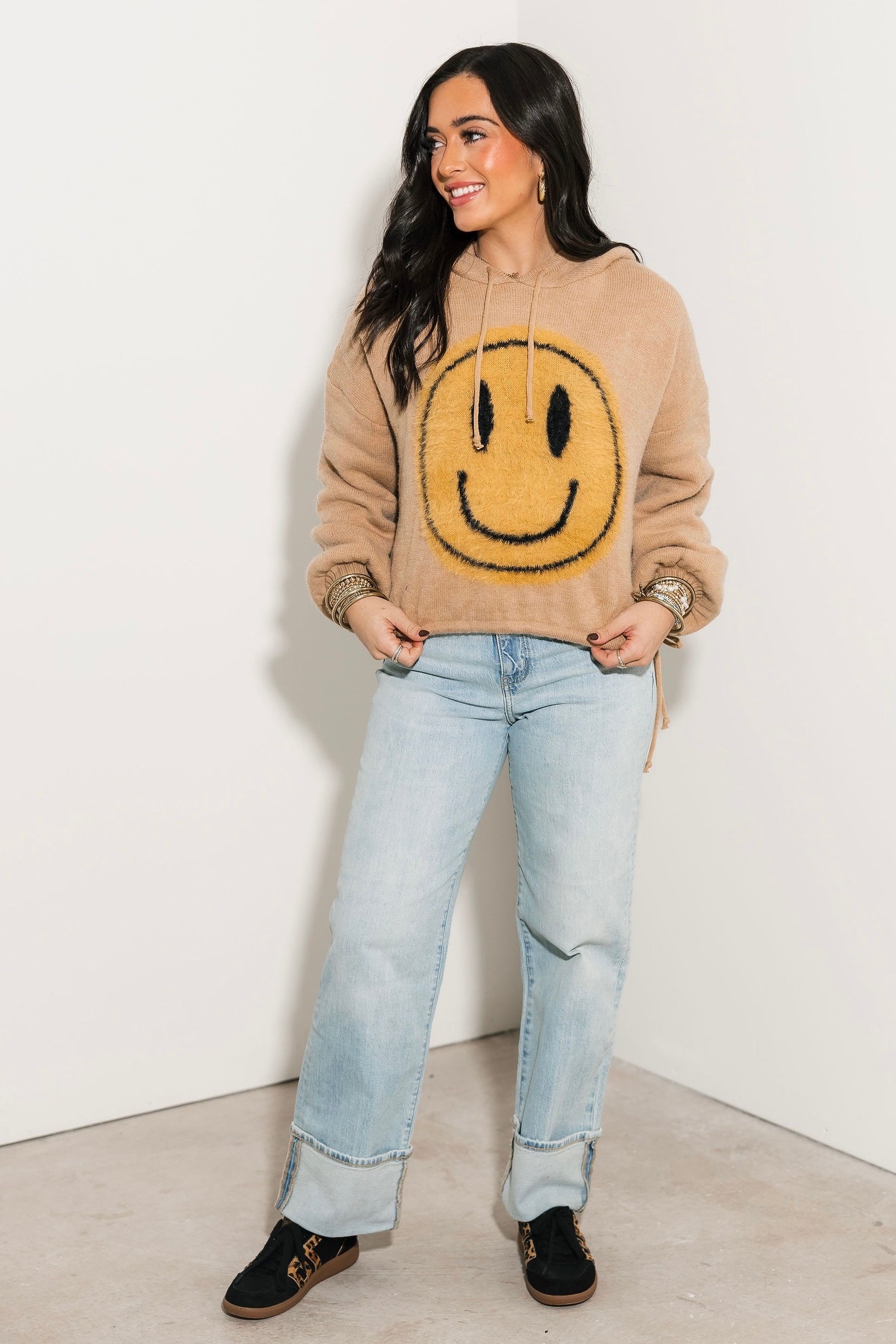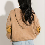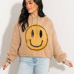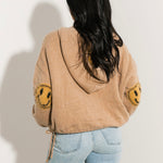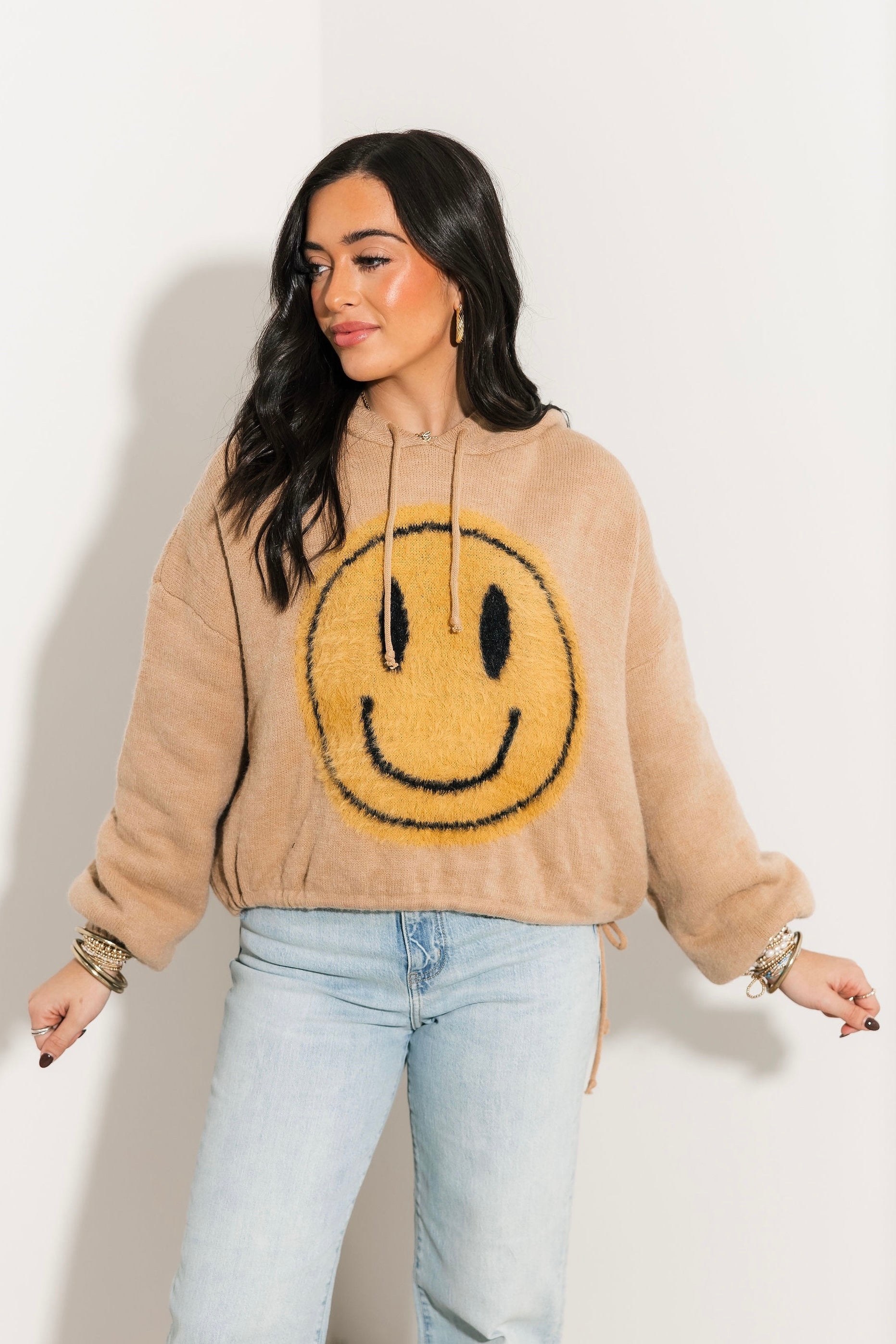 The Smiley Fuzzy Hoodie Sweater features a relaxed, oversized fit with long sleeves and a drawstring hood. Soft, plush, and comfortable, it’s a standout piece for layering or wearing on its own for a cozy, casual look. Sage is wearing a small.