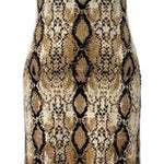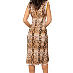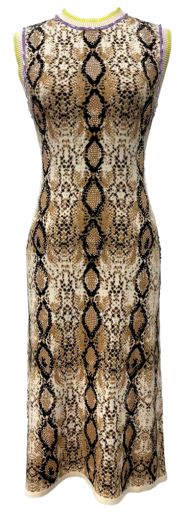 The Queen Of Sparkles Snake Print Rainbow Trim Knit Midi Dress features a fitted, stretchy silhouette with a classic crewneck and sleeveless design. Its midi length creates a flattering shape, making it perfect for layering or styling on its own for a standout outfit.