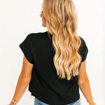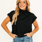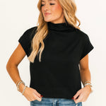 The Soft Touch Mock Neck Sweater in Black features a relaxed fit with a classic mock neck and short sleeves. Its soft, comfortable fabric makes it ideal for layering or wearing on its own for a polished, everyday look. Lexi is wearing a small.