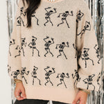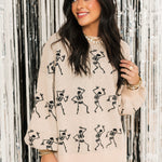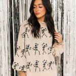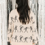 The Spooky Dancing Skeletons Sweater features a relaxed fit with a classic round neckline and long sleeves. Designed with a fun skeleton graphic, it’s the perfect piece for adding a seasonal touch to your everyday look. Pair with denim, leggings, or a skirt for a comfy yet spirited style that dances right into spooky season. Sage is wearing a small.