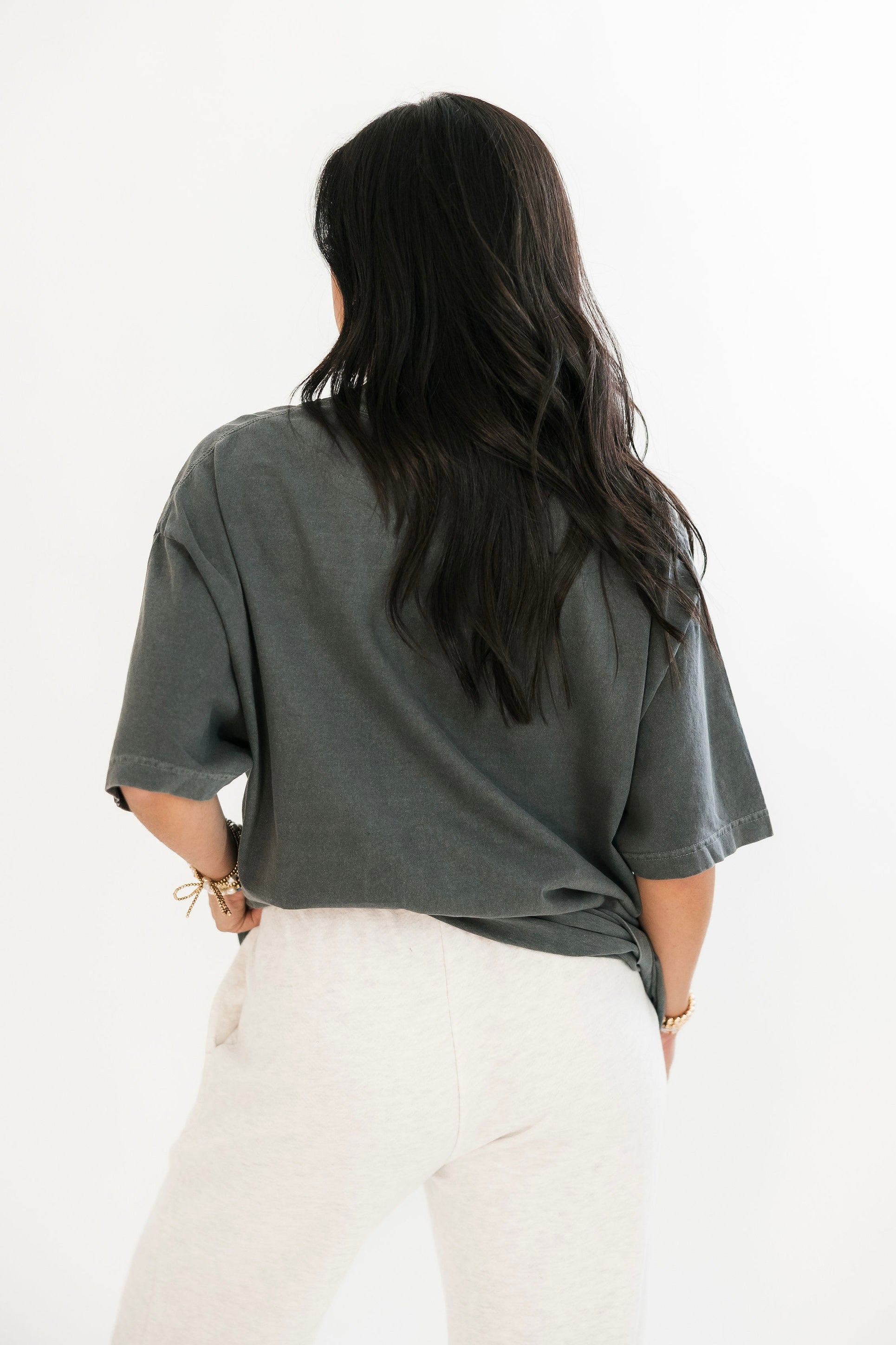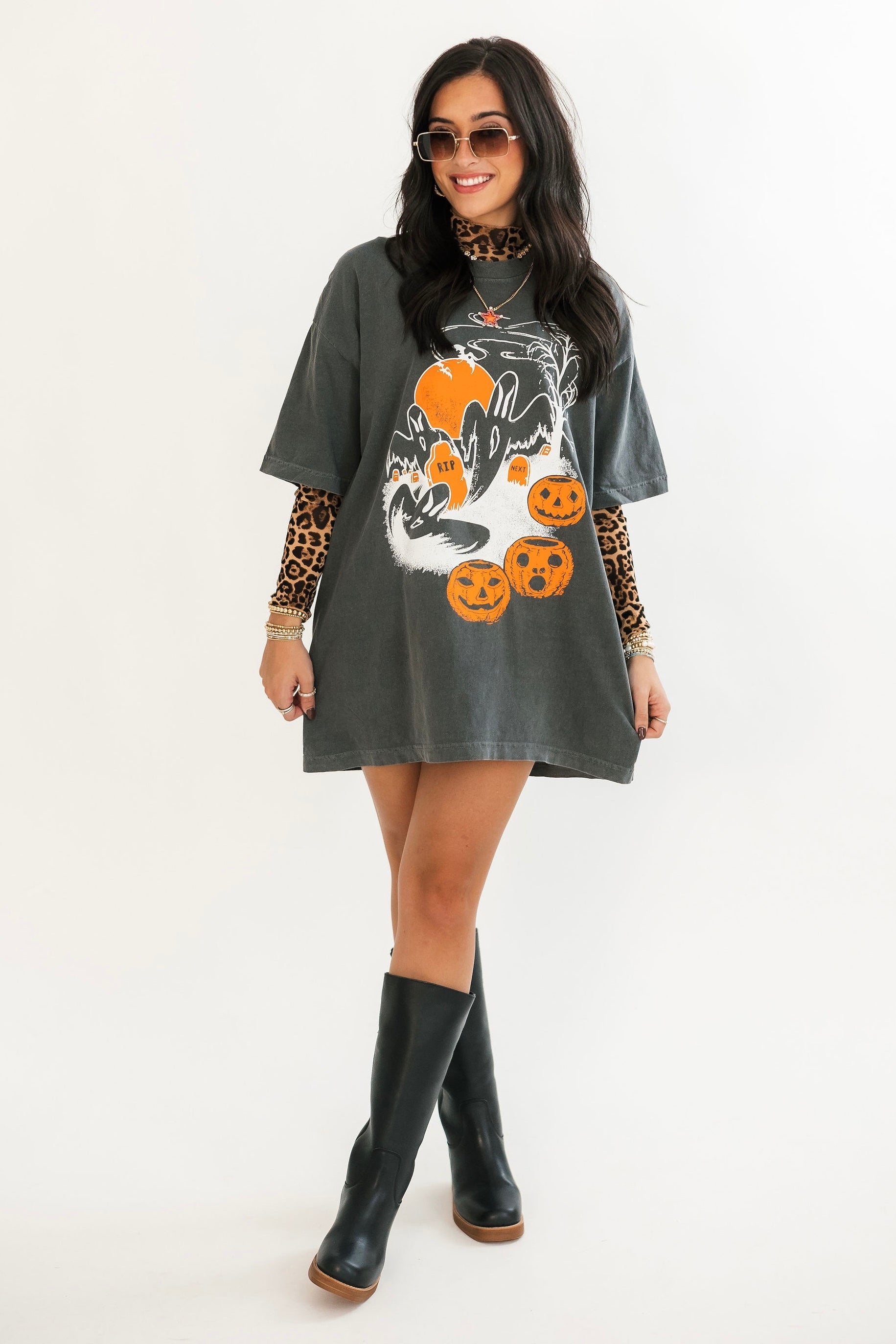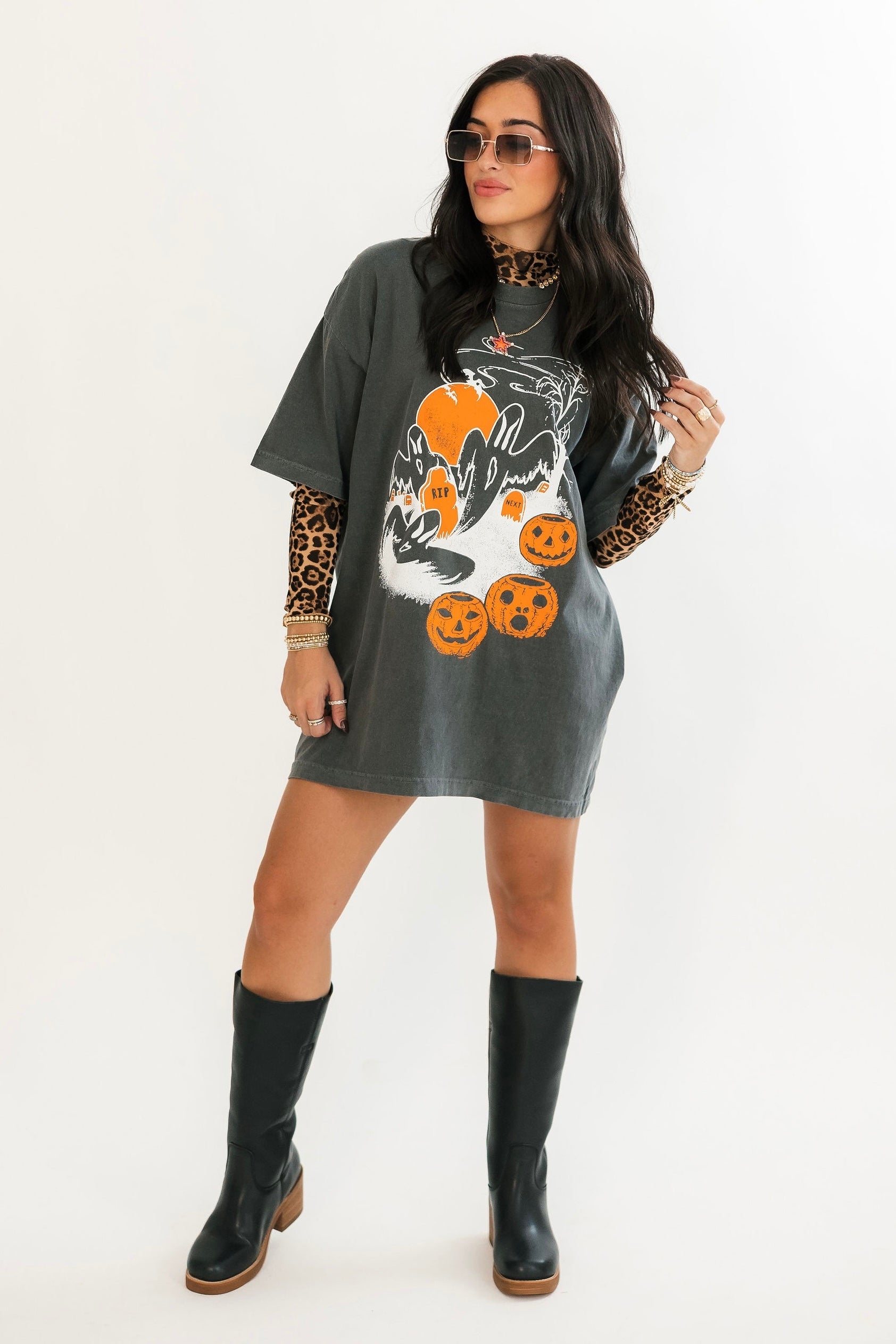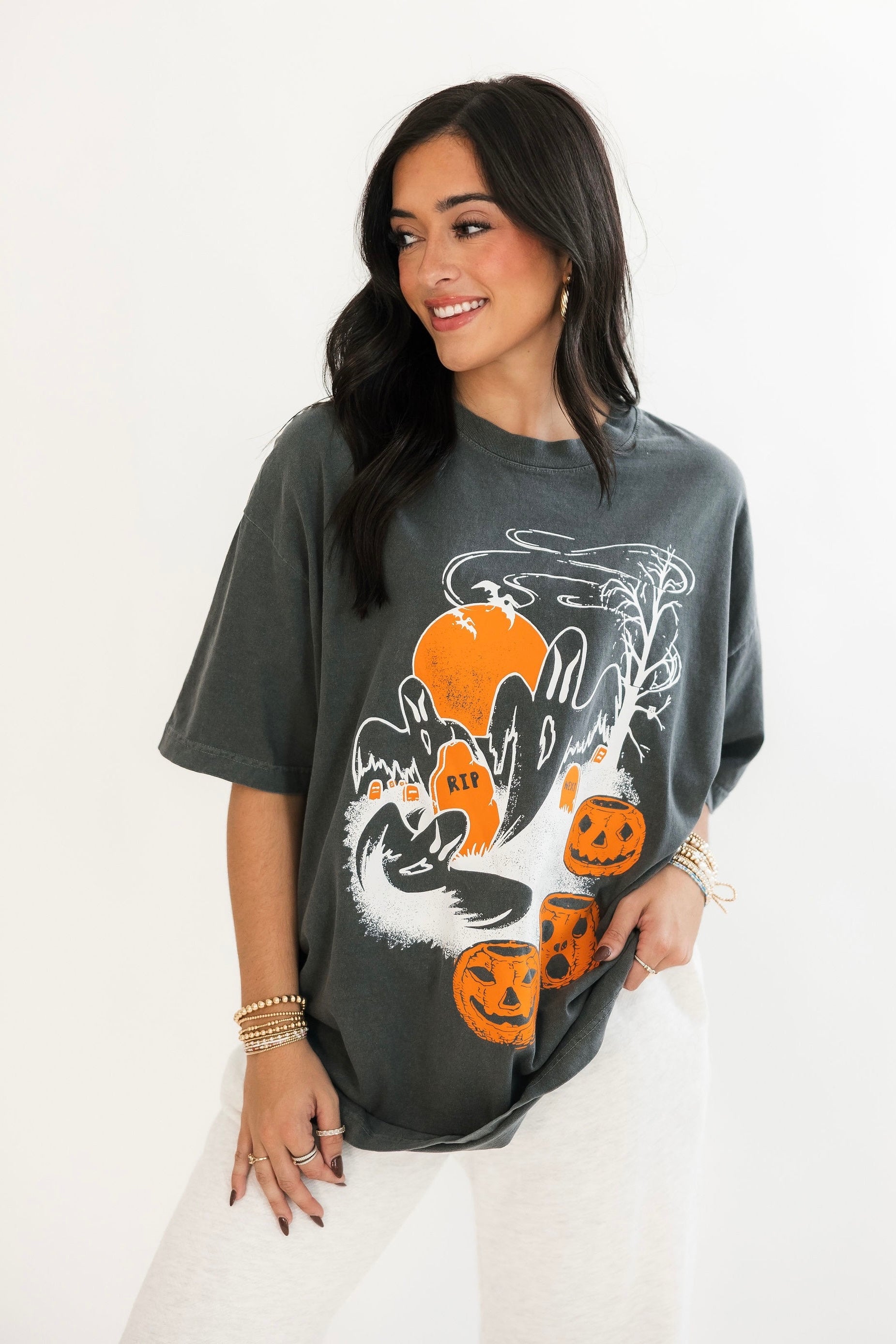 The Spooky Season Oversized Tee is the perfect mix of comfort and festive flair. Featuring a relaxed, oversized fit with a classic crewneck and short sleeves, this tee is finished with a playful Halloween graphic that celebrates the season in style. Whether you’re headed to a haunted house, carving pumpkins, or just lounging at home, this tee makes every day feel a little more fun and spooky. Sage is wearing a S/M.