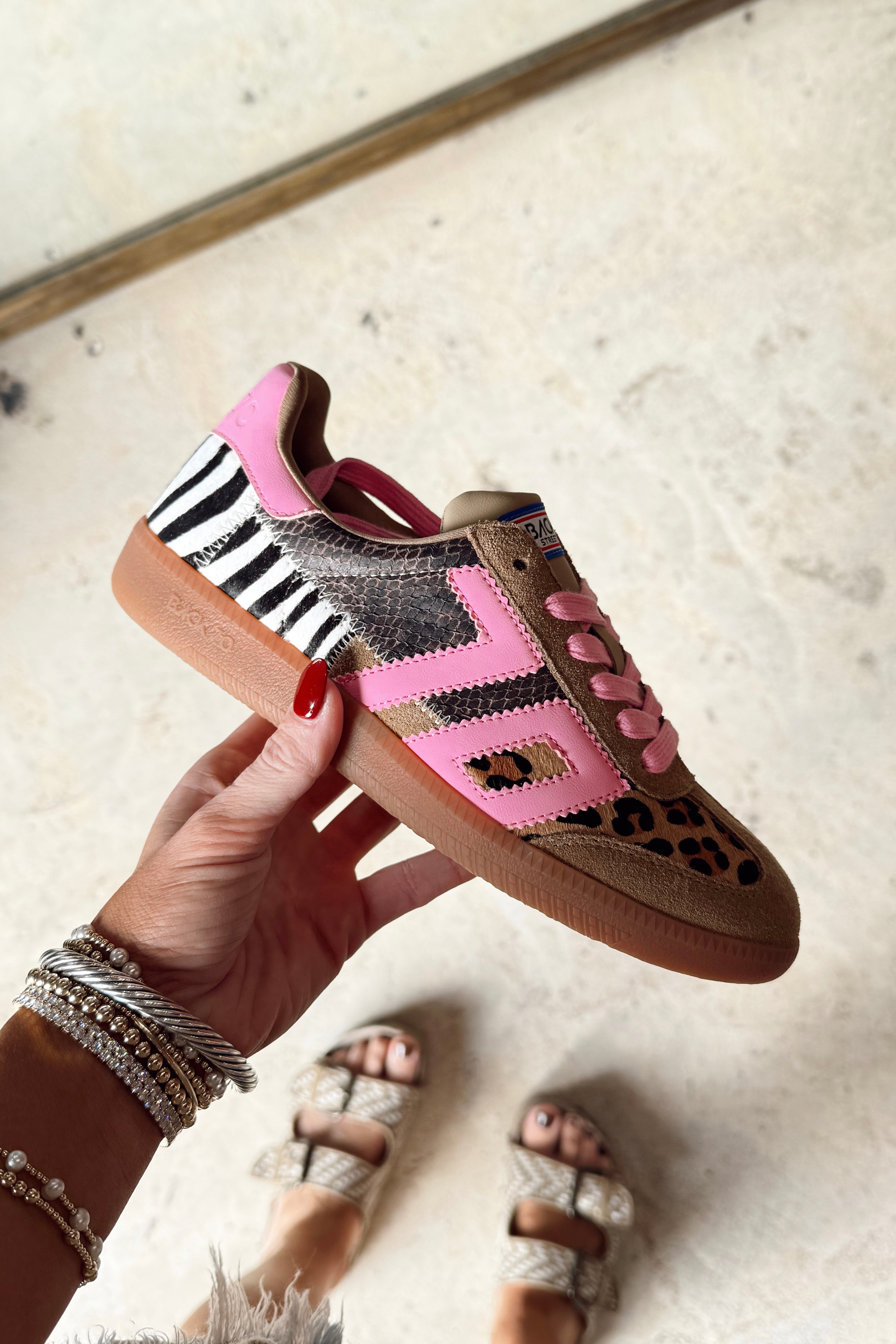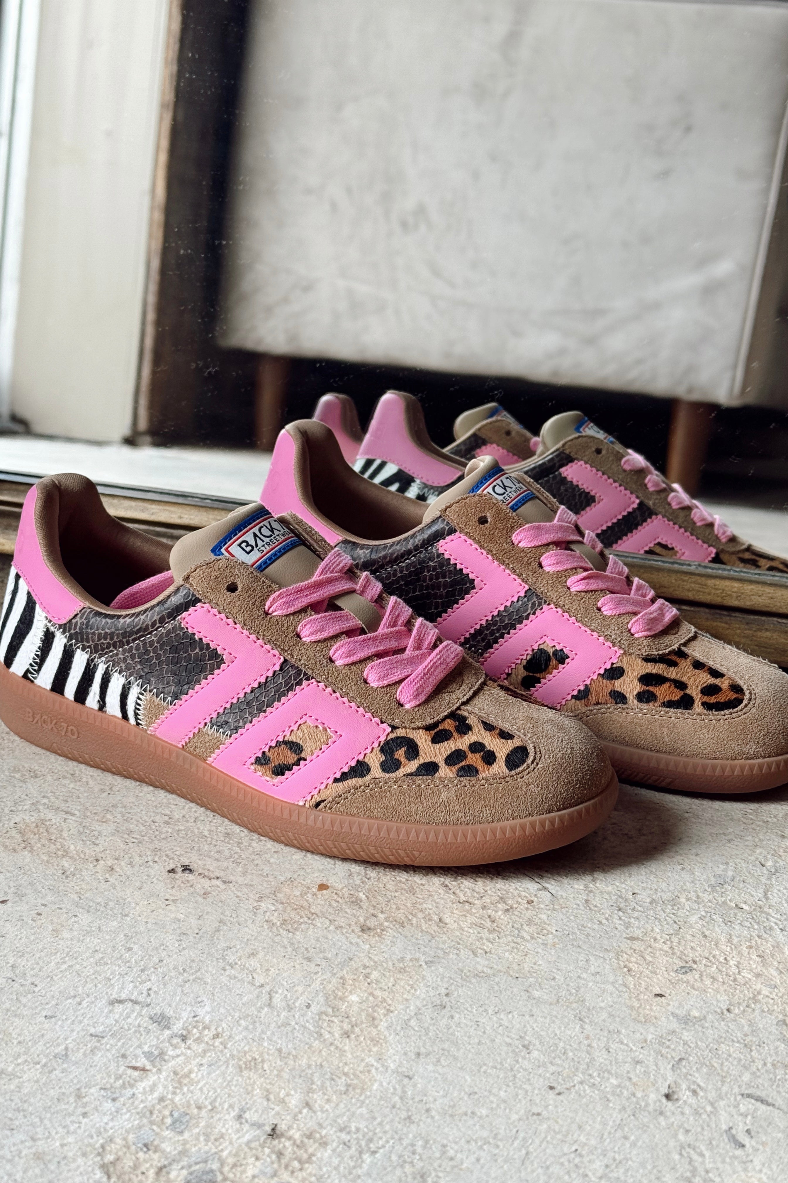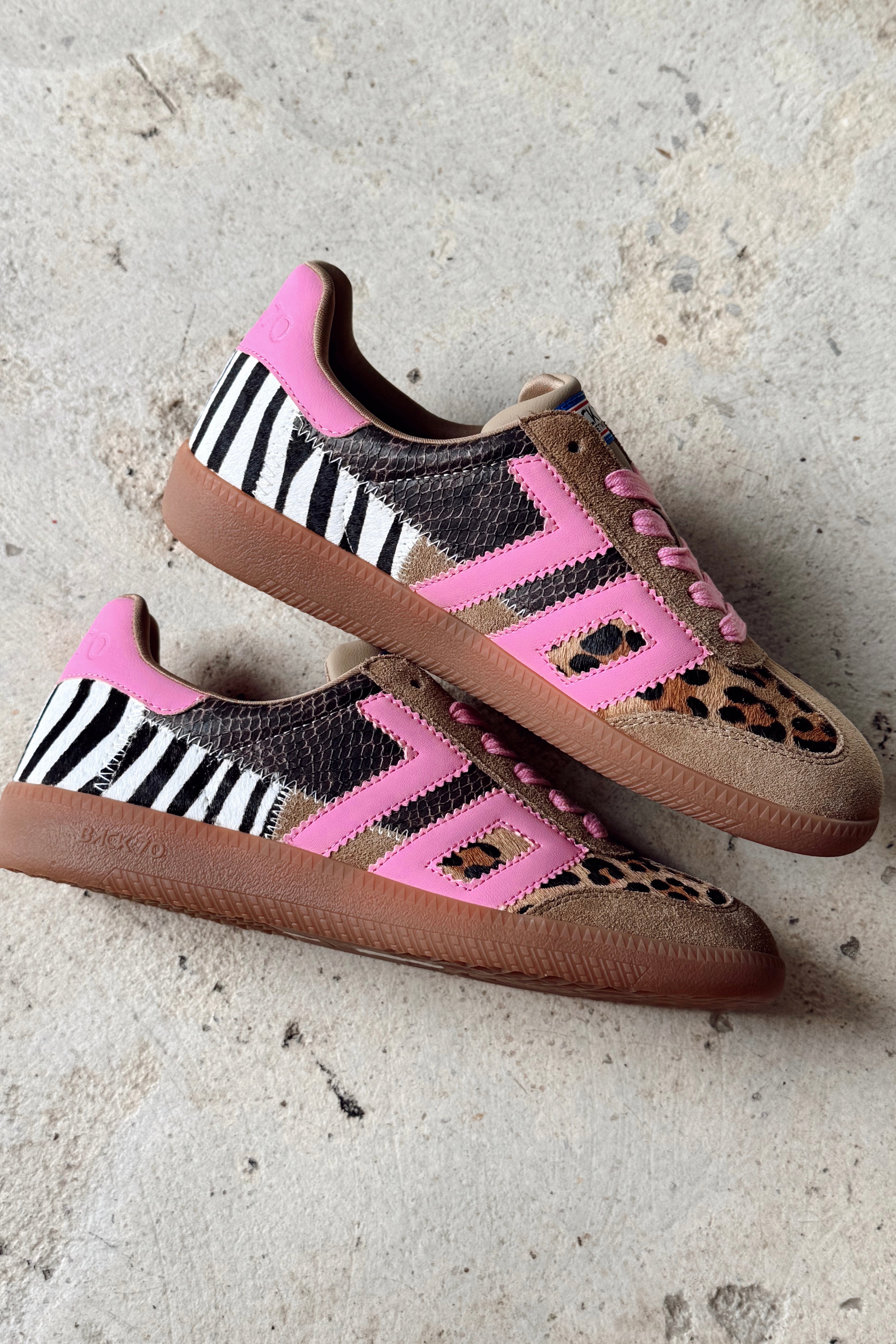 Say hello to the most bold iconic sneakers of the season. Animal print always makes a statement, and Squid takes it to the next level with a patchwork of rich leathers and a distinctly girly punch featuring Back 70's signature vintage icon in bright lipstick pink. If fashion were time, this is the moment you've been waiting for.