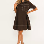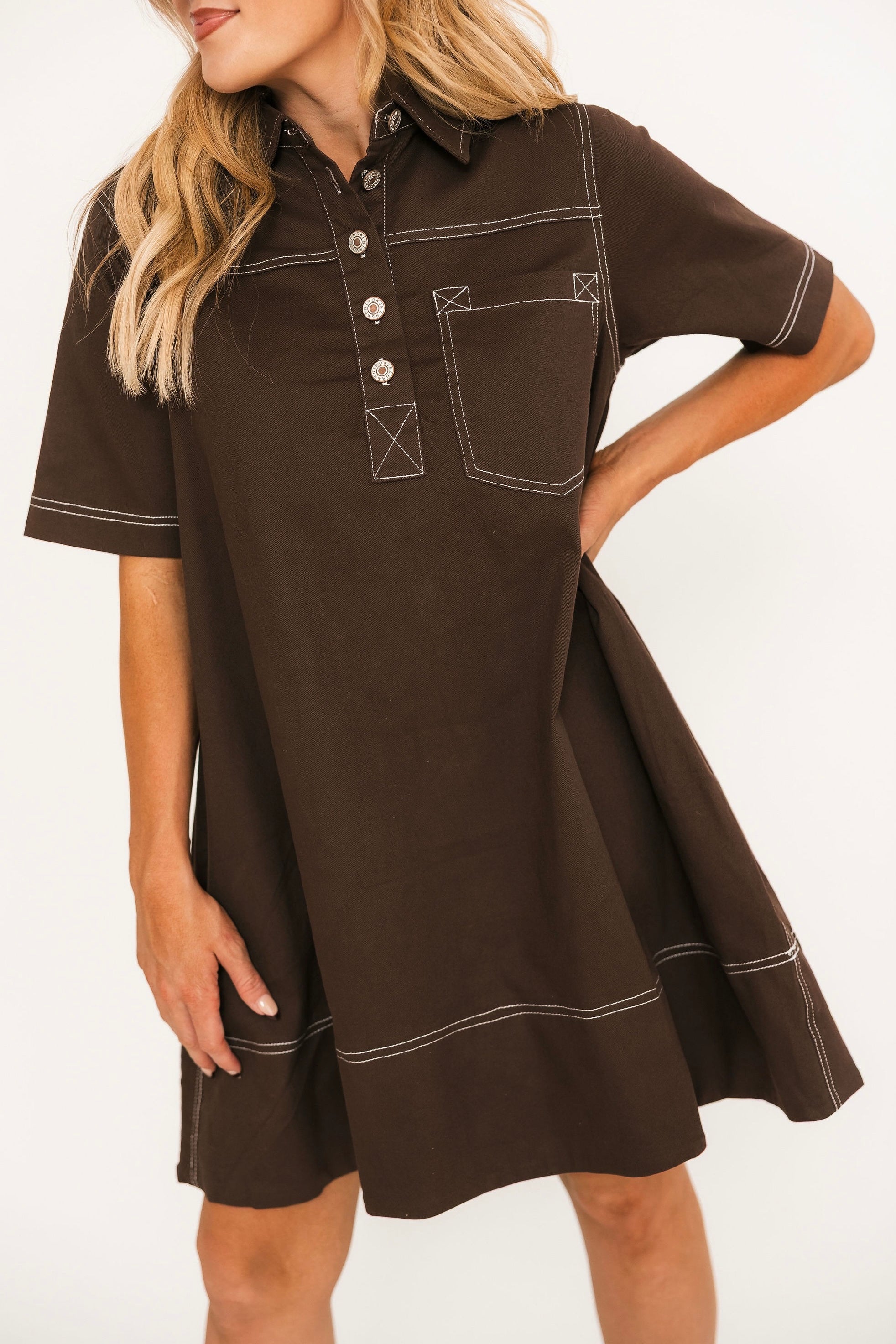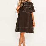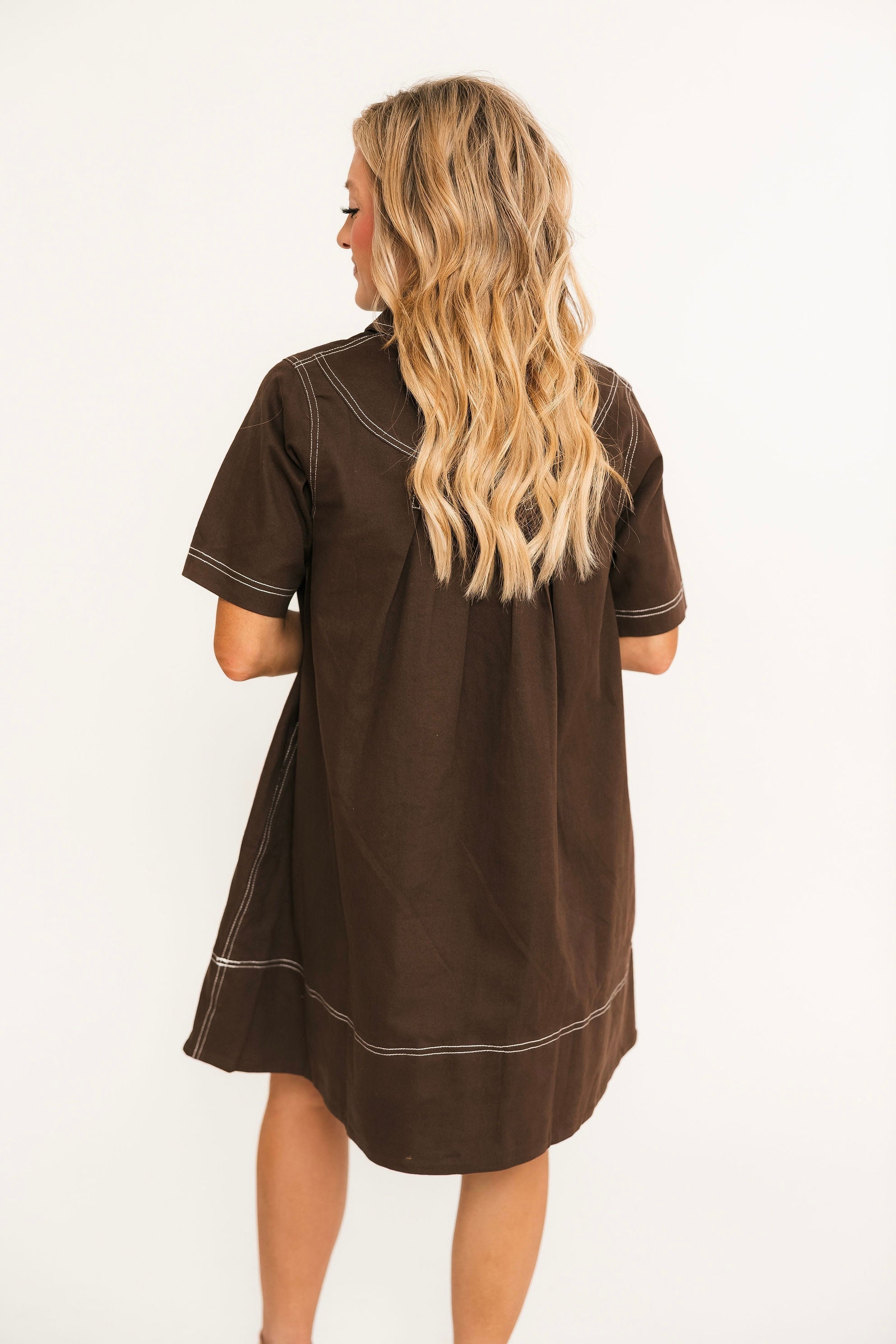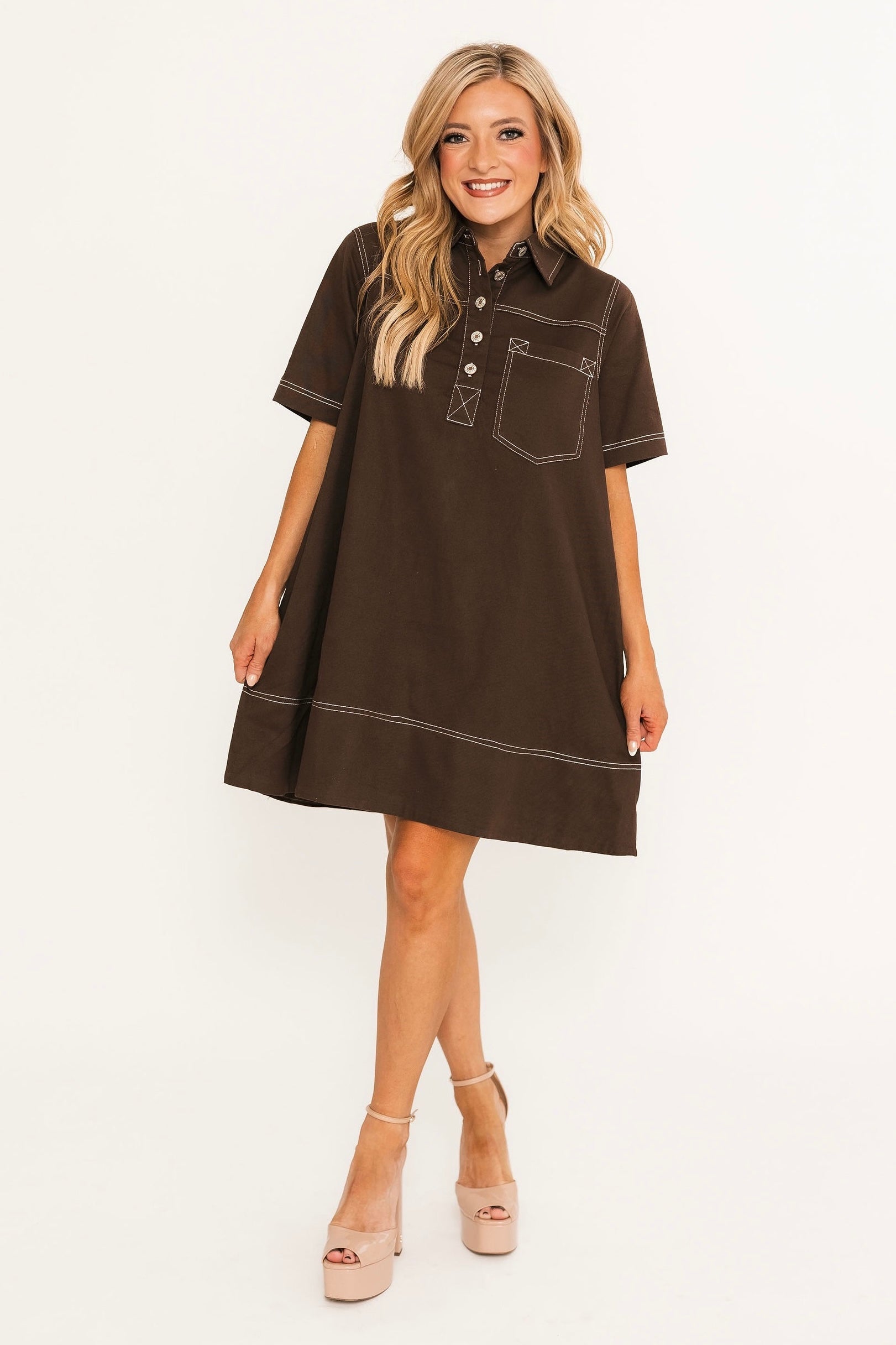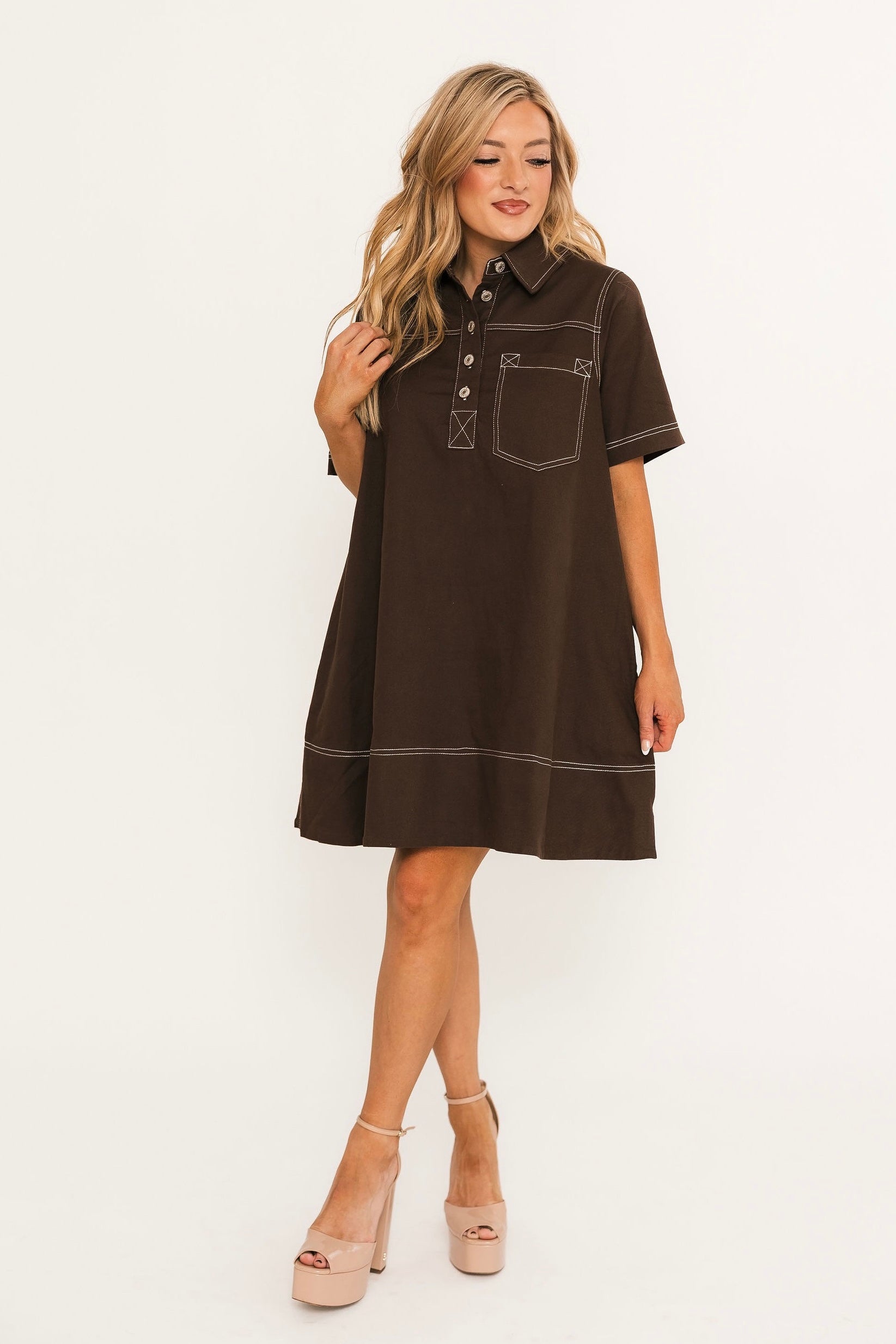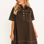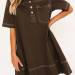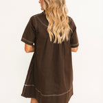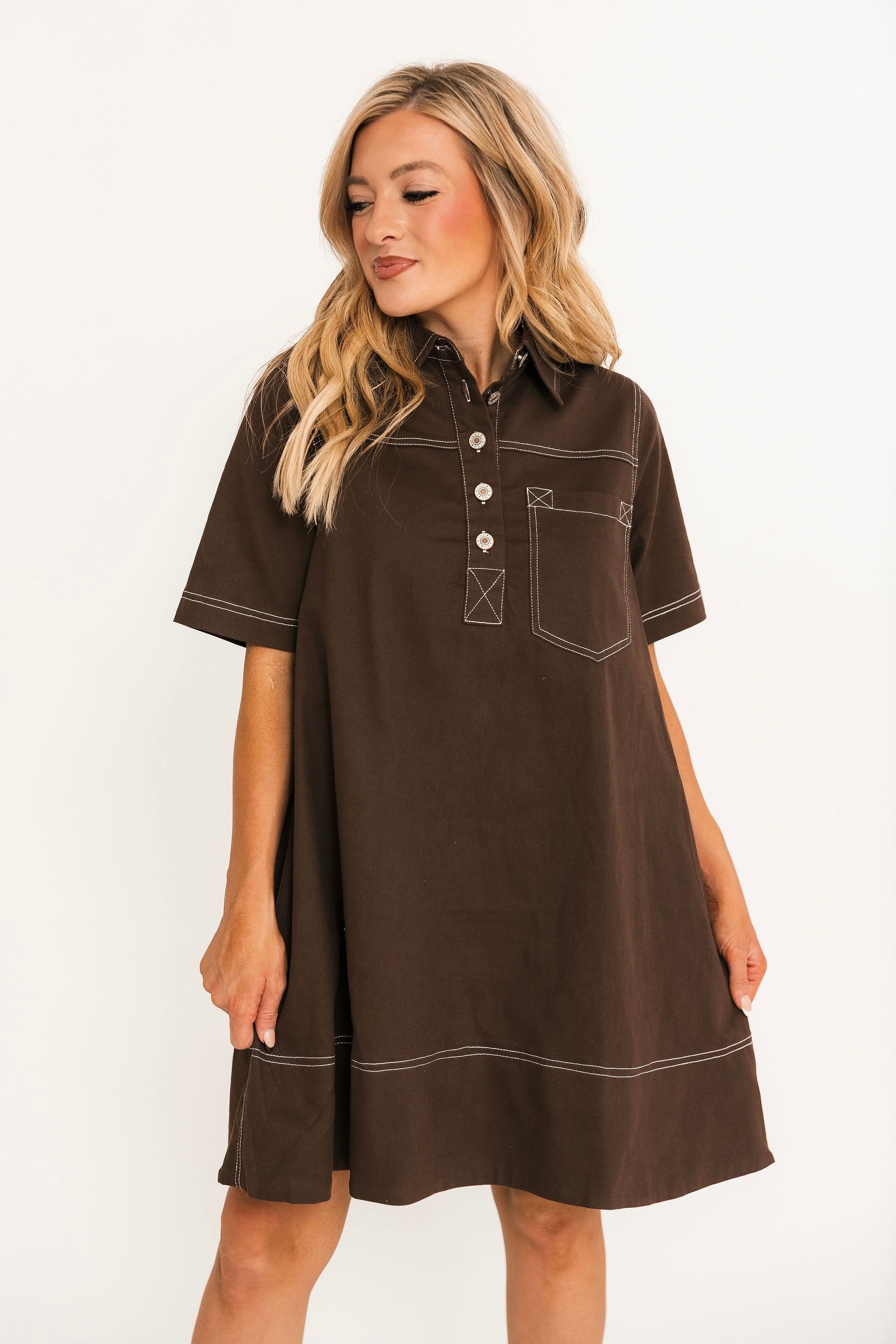 Effortlessly cool and endlessly wearable, the Steele Mini Dress is your go-to for modern minimalism. With clean lines, a relaxed silhouette, and subtle utility-inspired structure, this brown mini is polished enough for a night out and easy enough for everyday wear. Short sleeves and soft structure give it that just-right balance of edge and ease. Lexi is wearing a small.