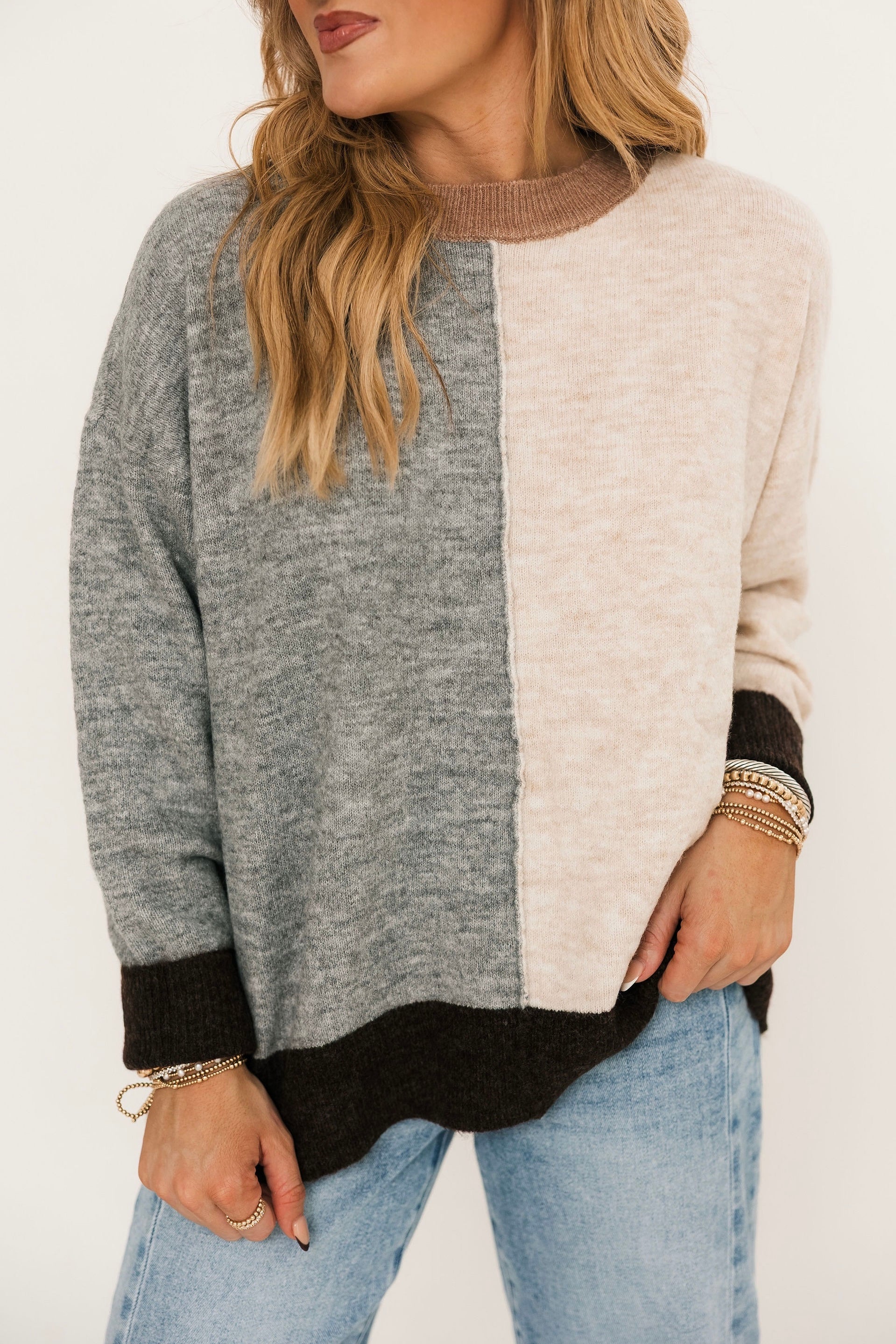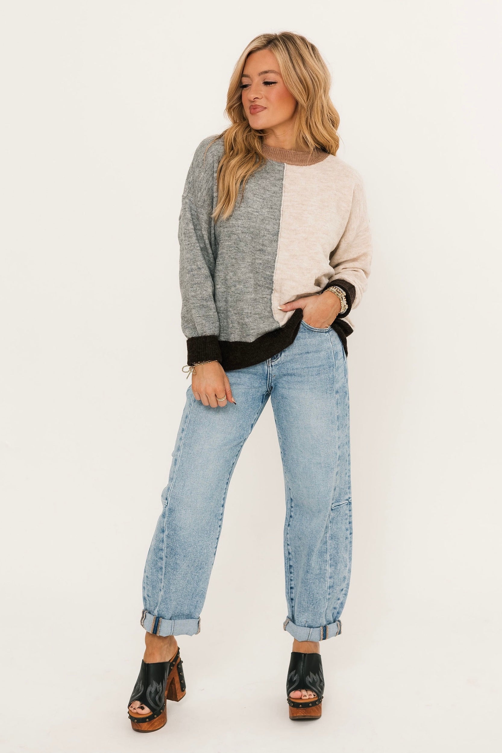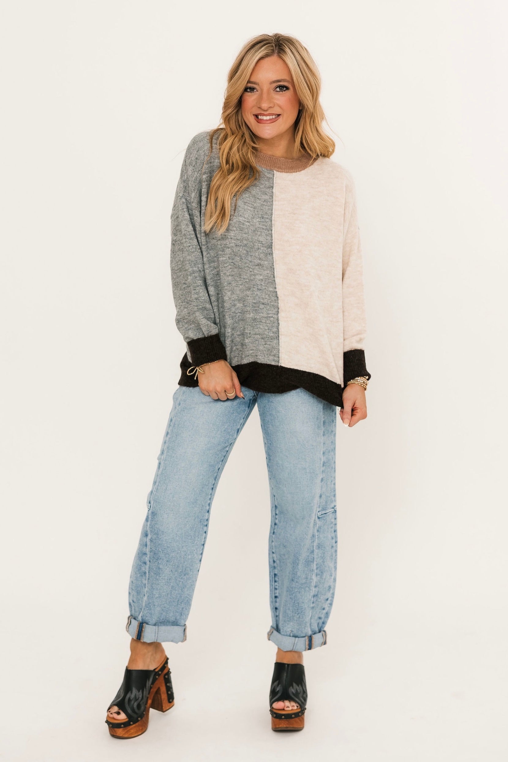The Stone & Spice Colorblock Sweater is a cozy-chic essential that makes everyday dressing effortless. Designed with a relaxed fit and easy drop shoulders, this sweater pairs a timeless silhouette with a playful colorblock pattern for a fresh, modern vibe. The crew neckline and front seam detail add that extra touch of casual polish—perfect for layering with your favorite jeans or skirts all season long. Lexi is wearing a small.
