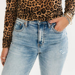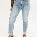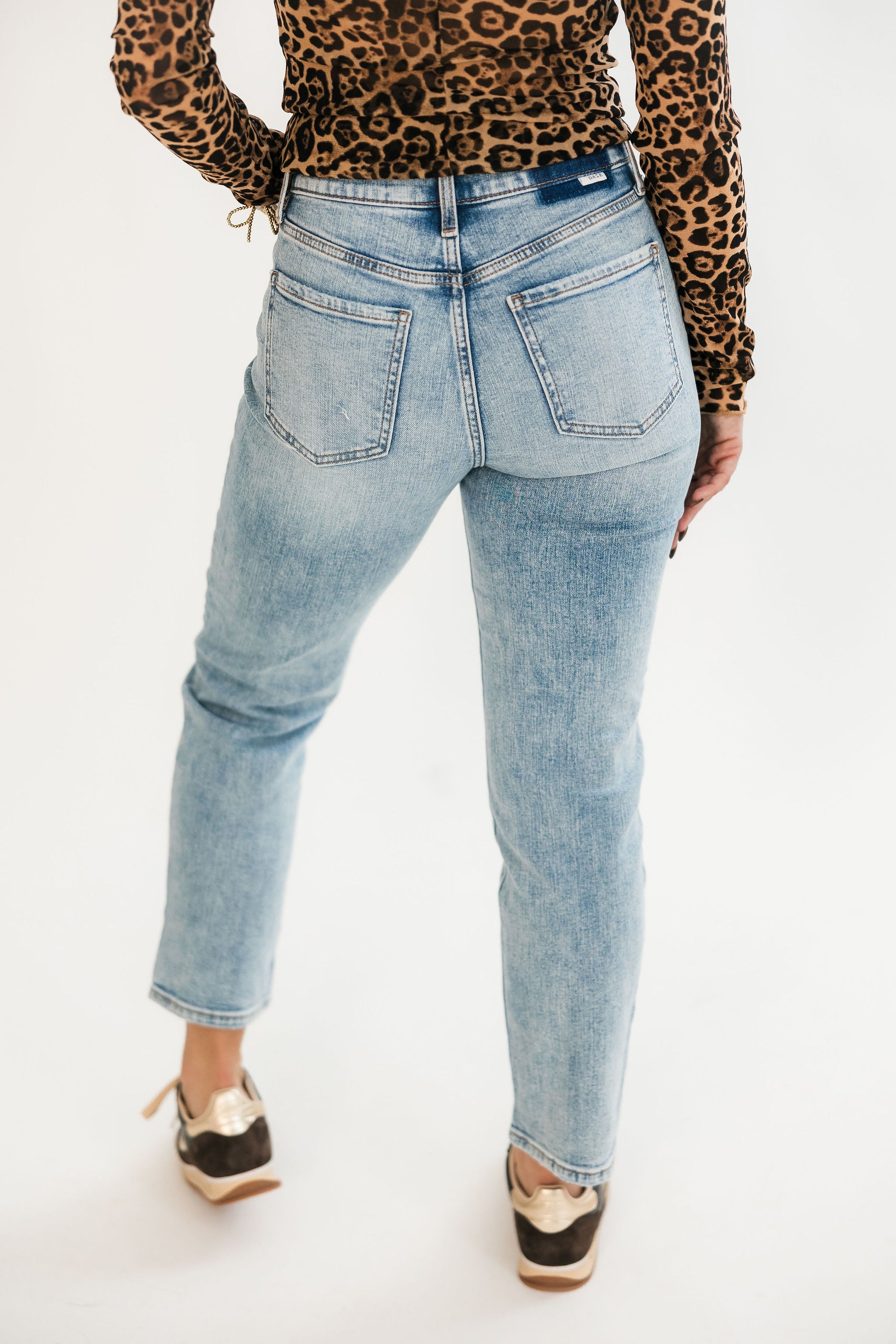 This waist defining, high rise jean is created in a light wash with subtle fading and slight grinding at the hems to give it a true been-around-for-decades vintage look. Constructed in our "Tough Love" fabric that gives the vintage feeling of rigid structure, with just a touch of stretch.
