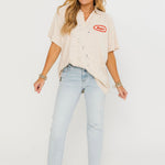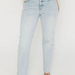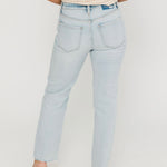 This waist defining, high rise jean is created in a light wash with subtle fading and slight grinding at the hems to give it a true been-around-for-decades vintage look. Constructed in our "Tough Love" fabric that gives the vintage feeling of rigid structure, with just a touch of stretch.