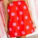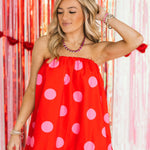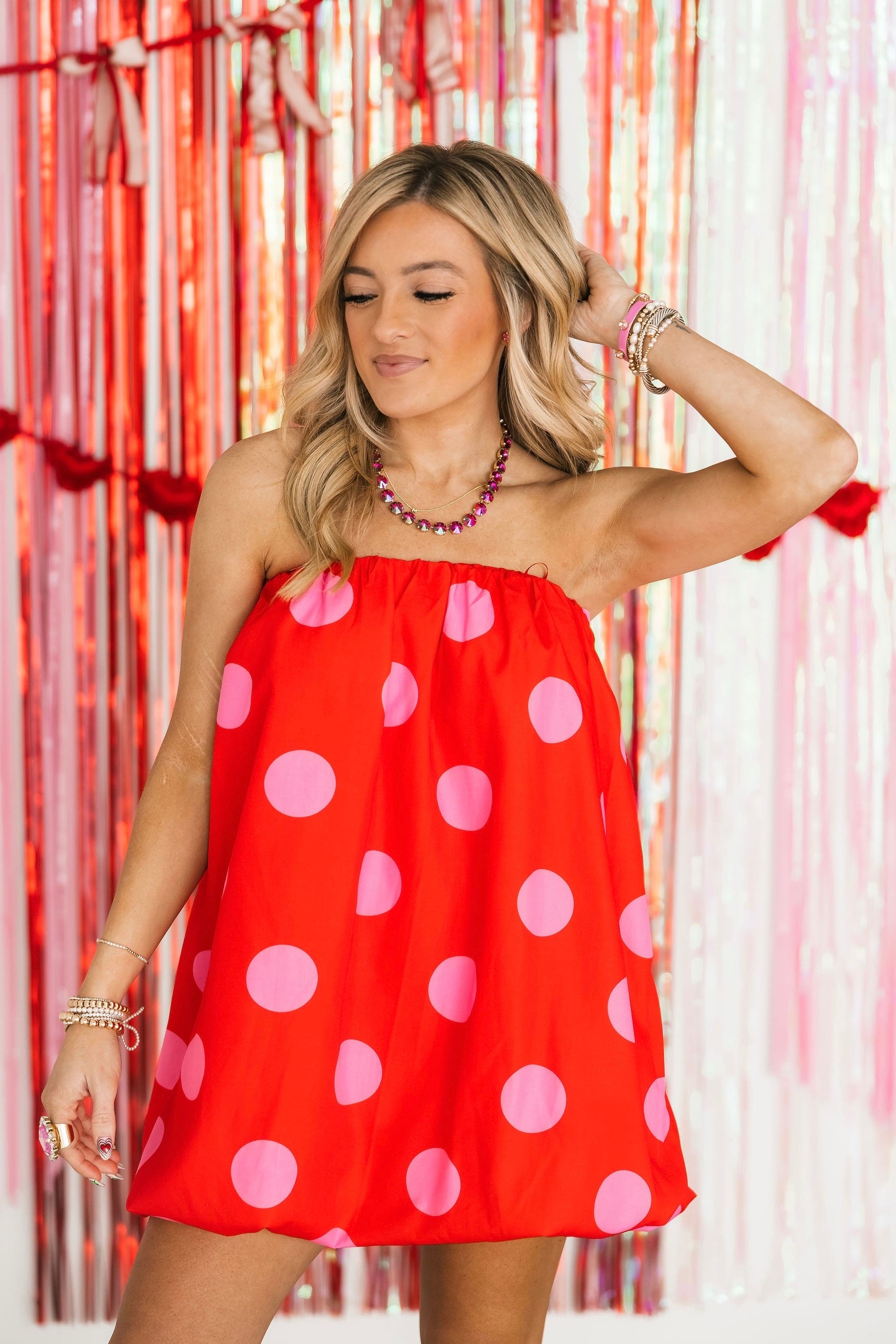 The Strapless Bubble Mini Dress in Red Polka Dot features a loose, voluminous fit with a bubble hem and strapless neckline. Mini length and playful polka dots give it a cheerful, romantic energy—perfect for Valentine’s Day celebrations or anytime you want to stand out. Lexi is wearing a small.