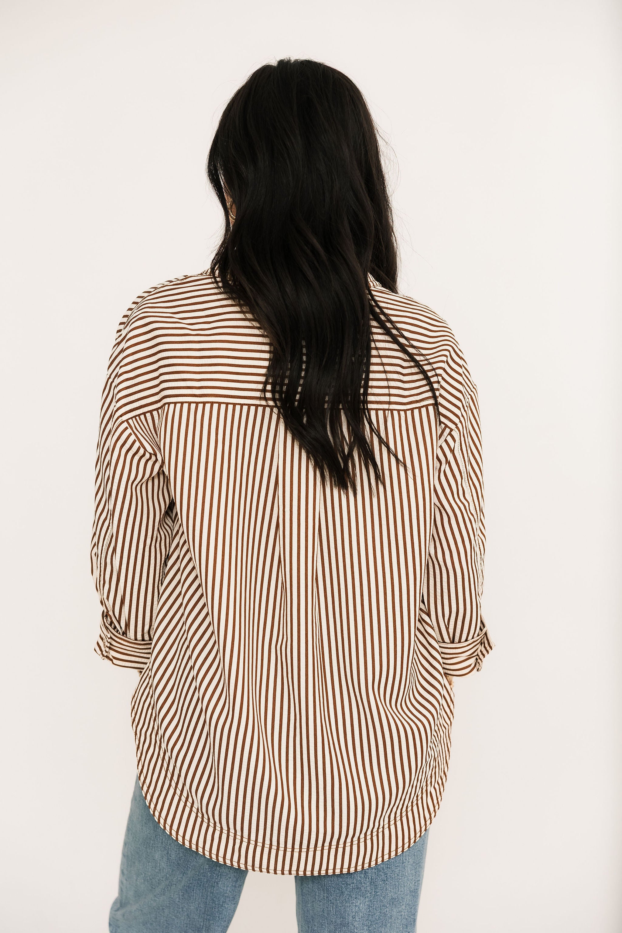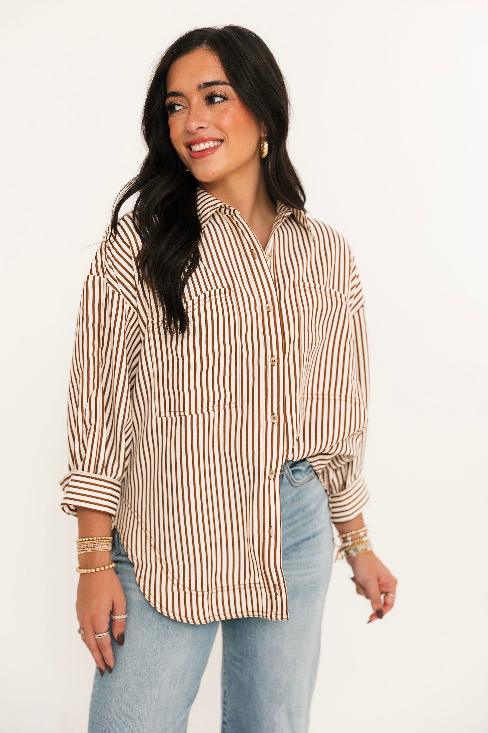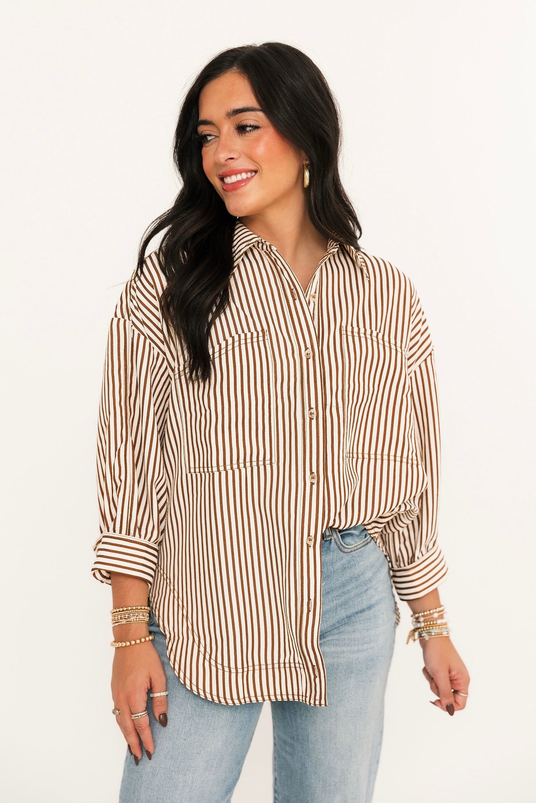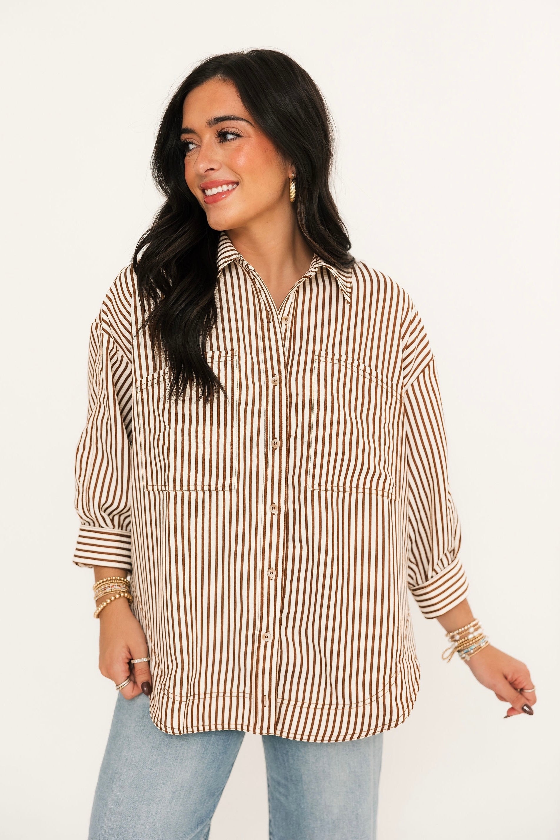 A timeless take on a closet classic. The Margot Top features a relaxed fit with a crisp collared neckline and button-down front. Designed in a warm brown stripe, it’s effortlessly chic for workdays, weekends, and everything in between. Wear it tucked, tied, or layered—this one does it all. Sage is wearing a small.