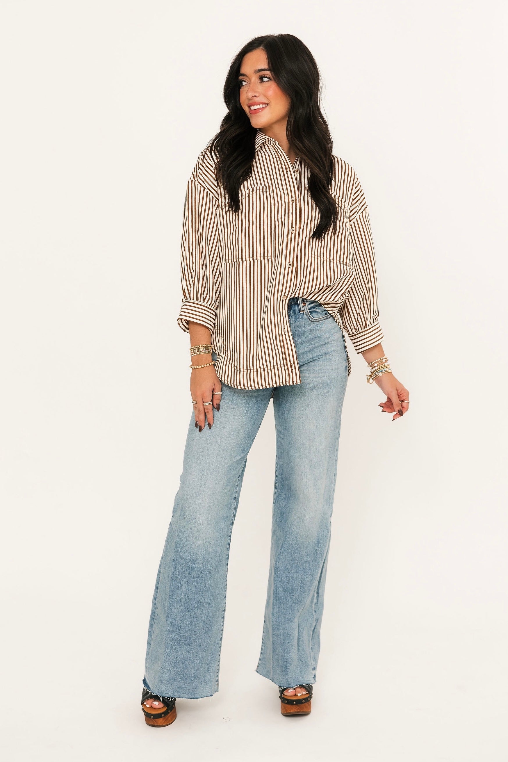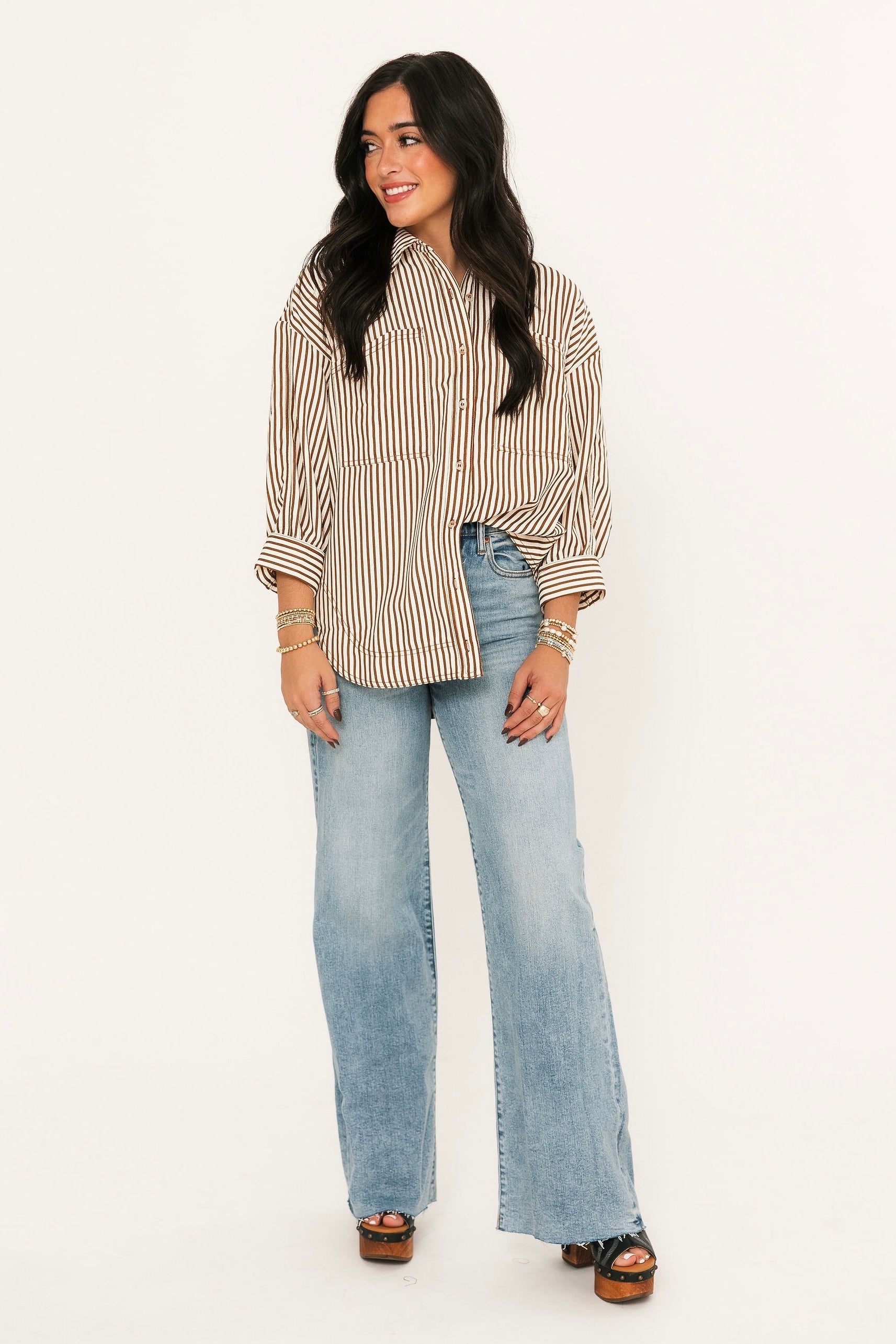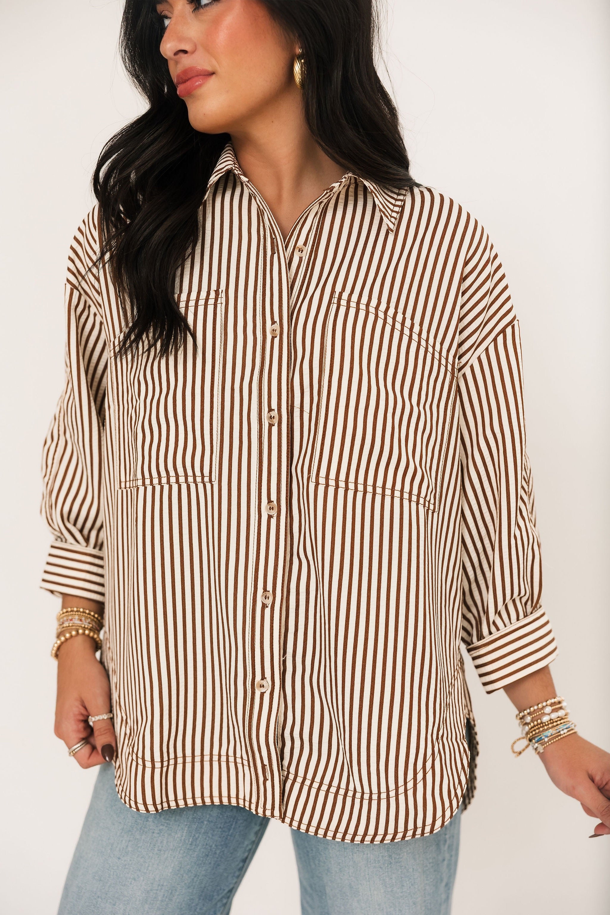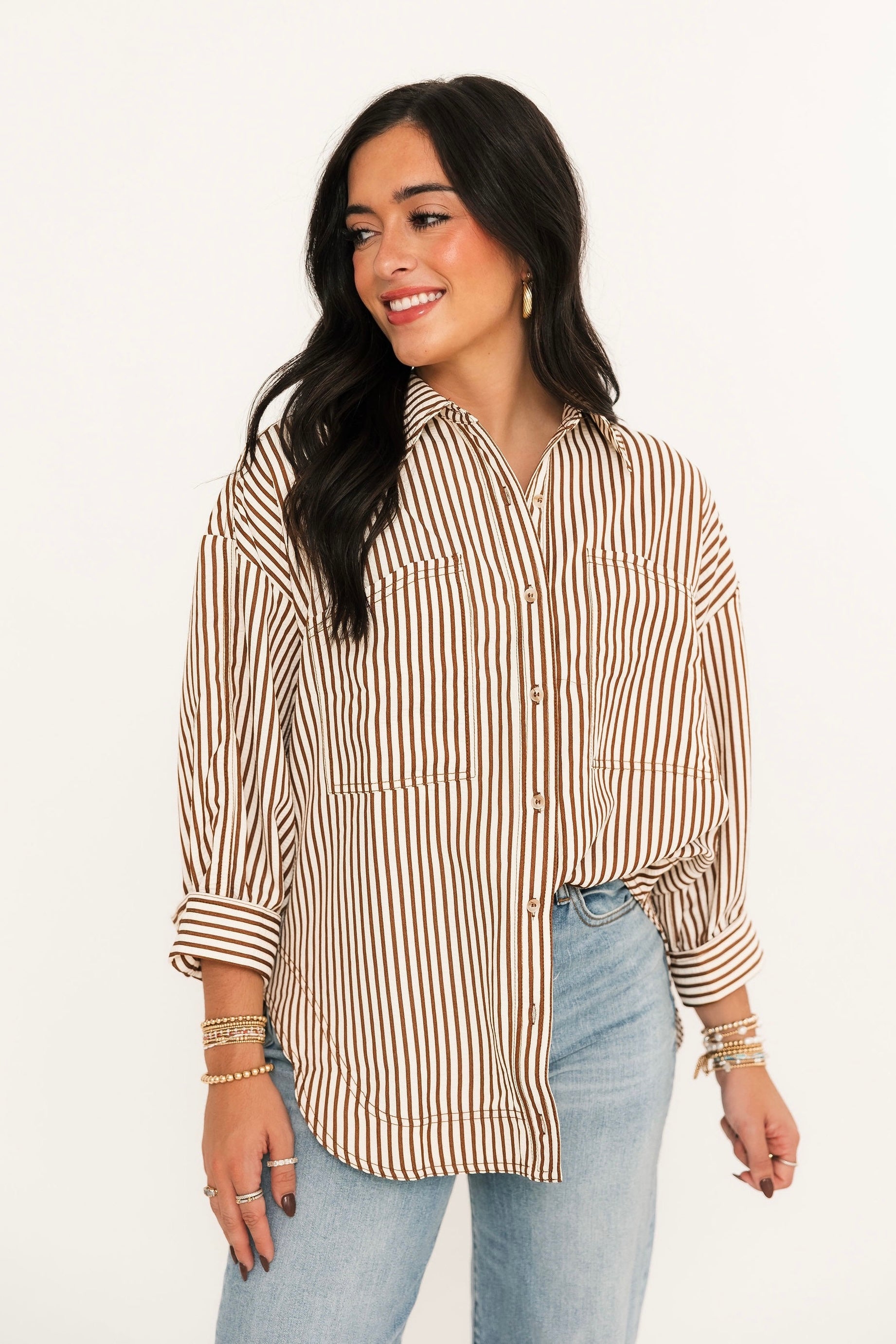 A timeless take on a closet classic. The Margot Top features a relaxed fit with a crisp collared neckline and button-down front. Designed in a warm brown stripe, it’s effortlessly chic for workdays, weekends, and everything in between. Wear it tucked, tied, or layered—this one does it all. Sage is wearing a small.