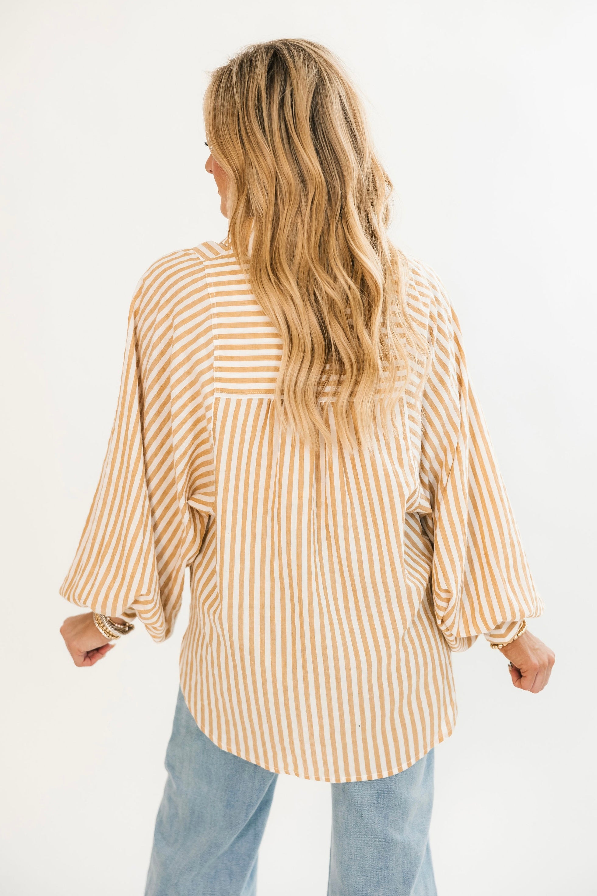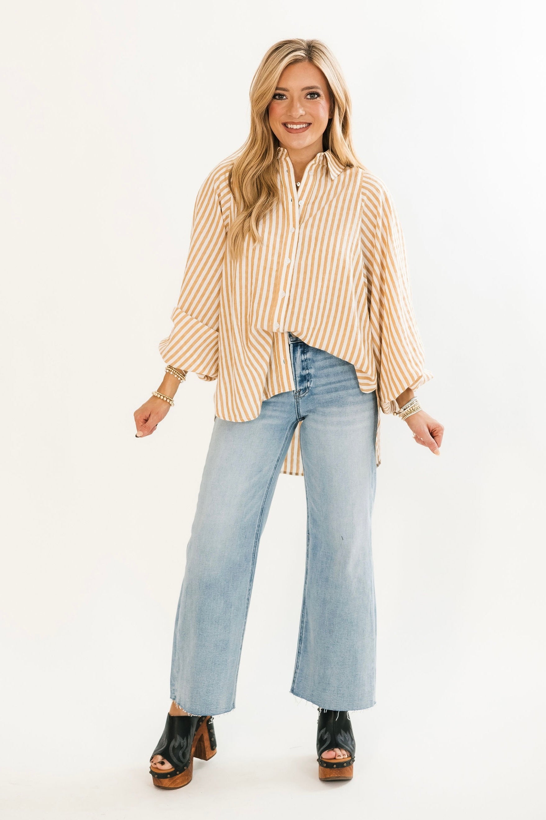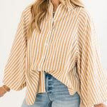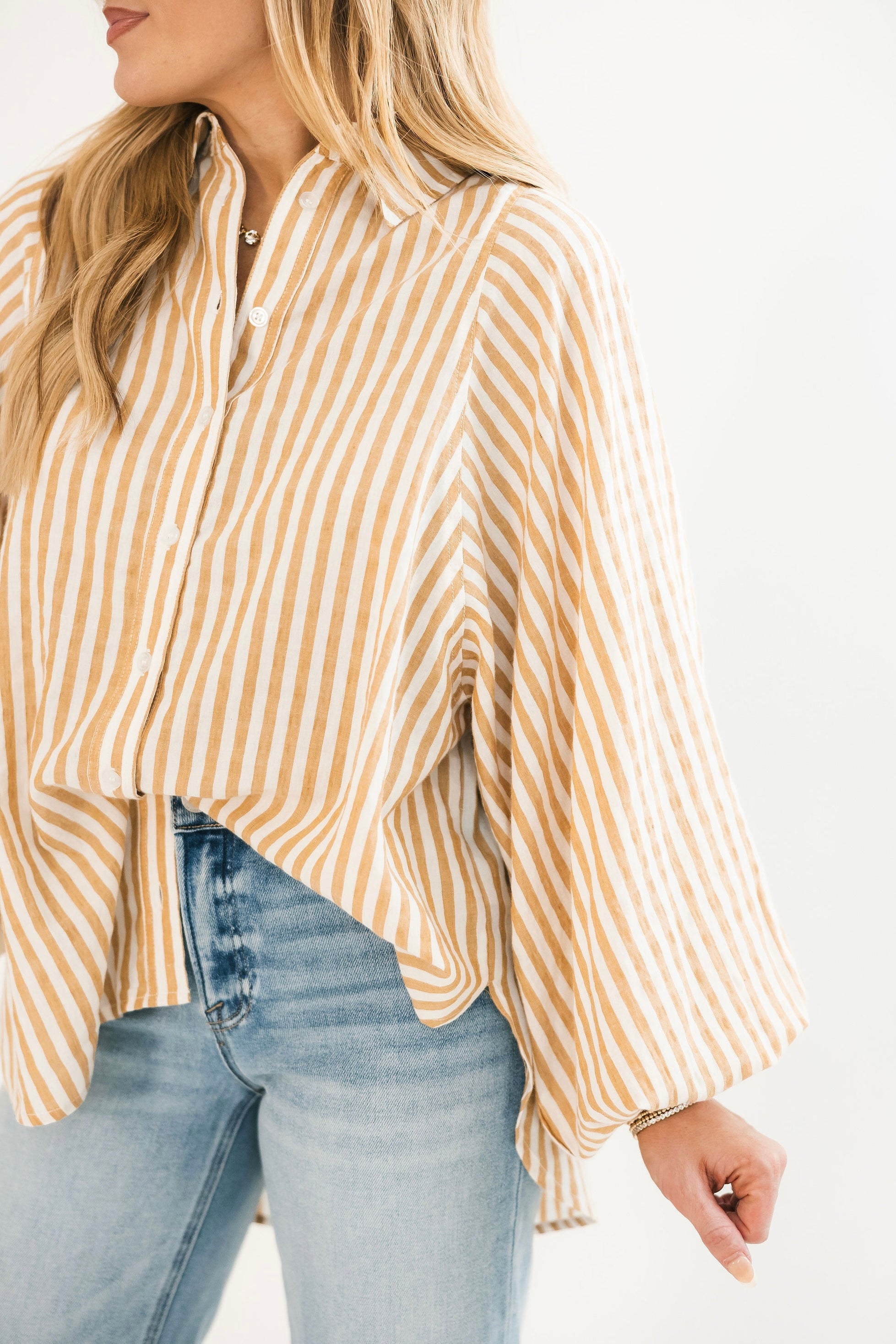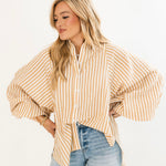 So essential in an oversized silhouette, this laidback jacket is featured in a button-down style with a collared neckline and a pinstripe pattern. Lexi is wearing a small.