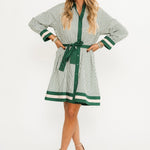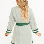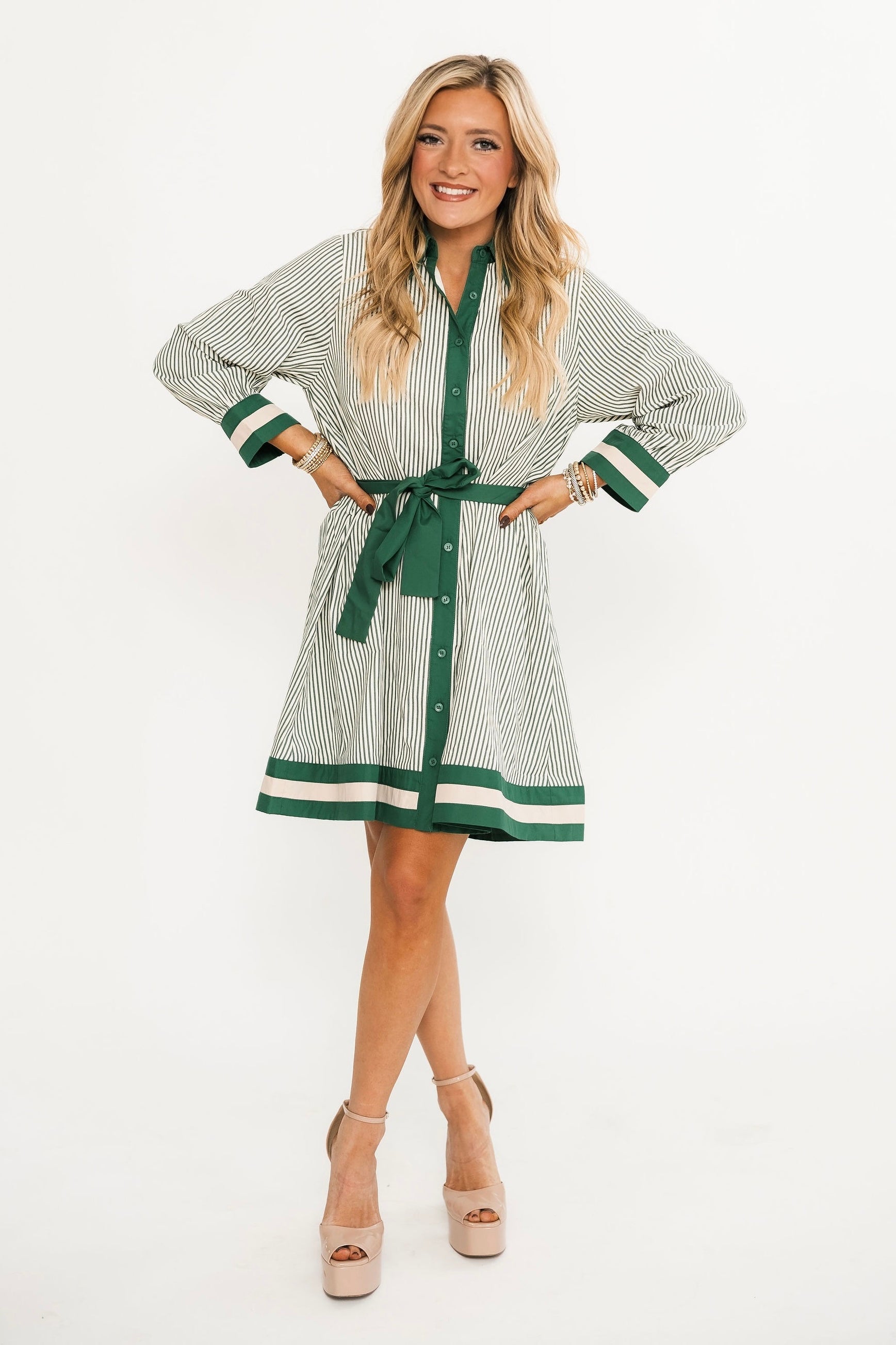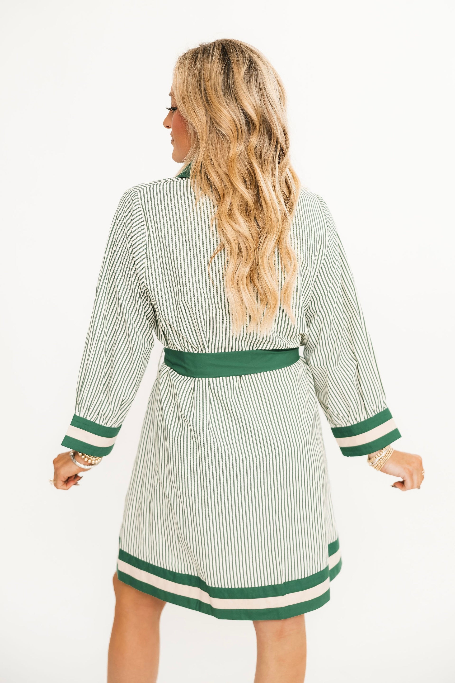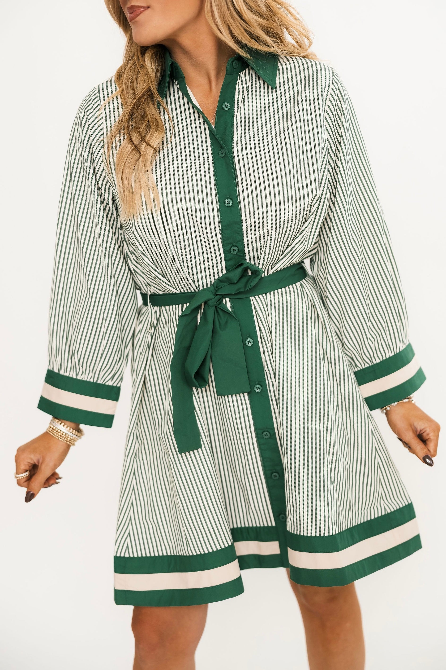 Effortless polish meets playful charm in the Striped & Chic Mini. This collared button-up dress features a warm rust hue with timeless stripes, a flattering mini length, and long sleeves for year-round wear. Dress it up with boots or keep it casual with sneakers—either way, it’s a standout. Lexi is wearing a small. Lexi is wearing a small.