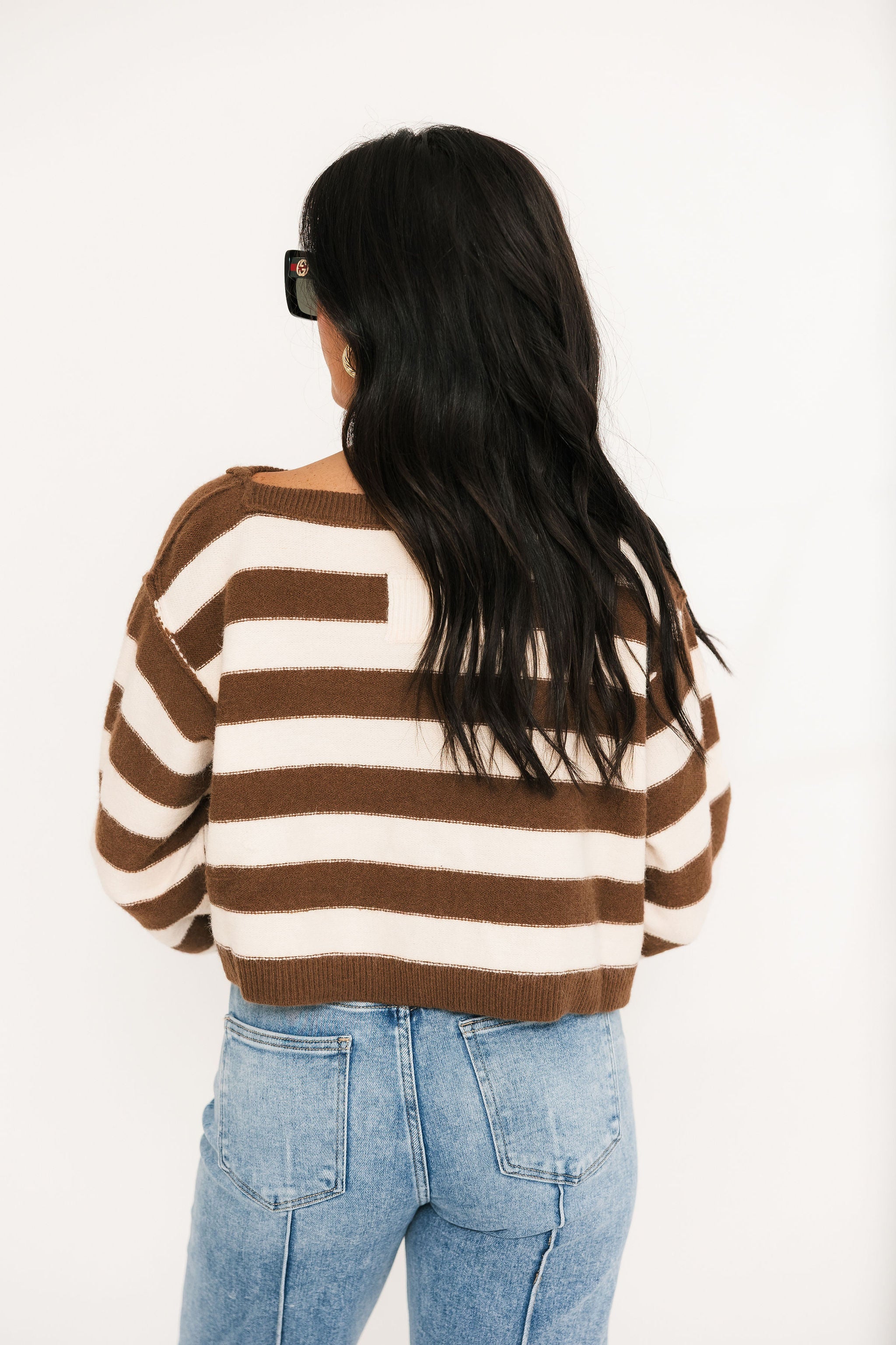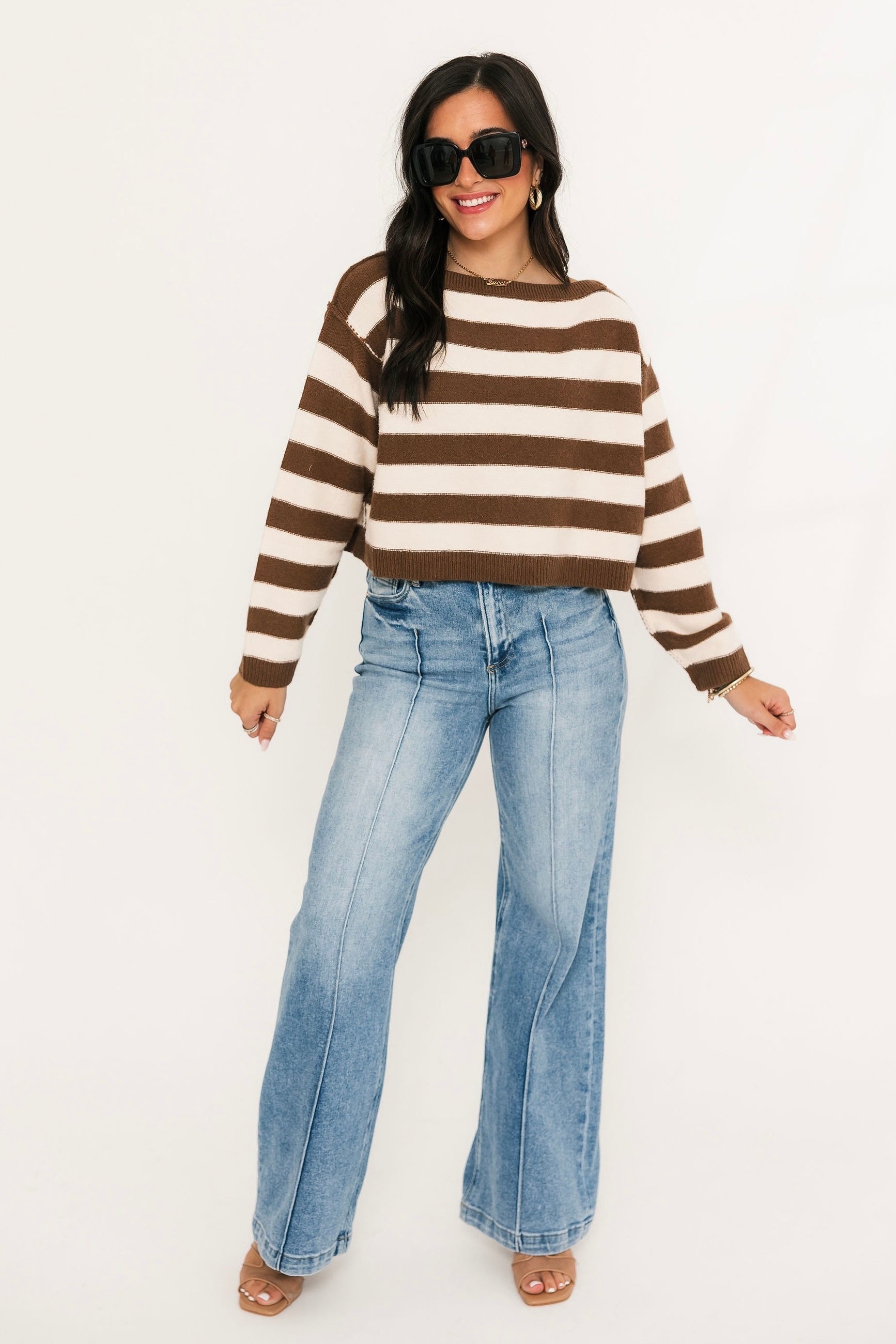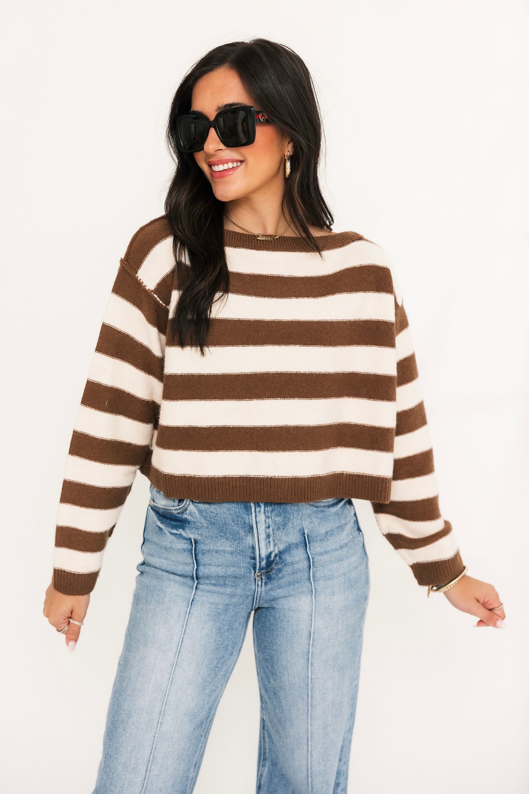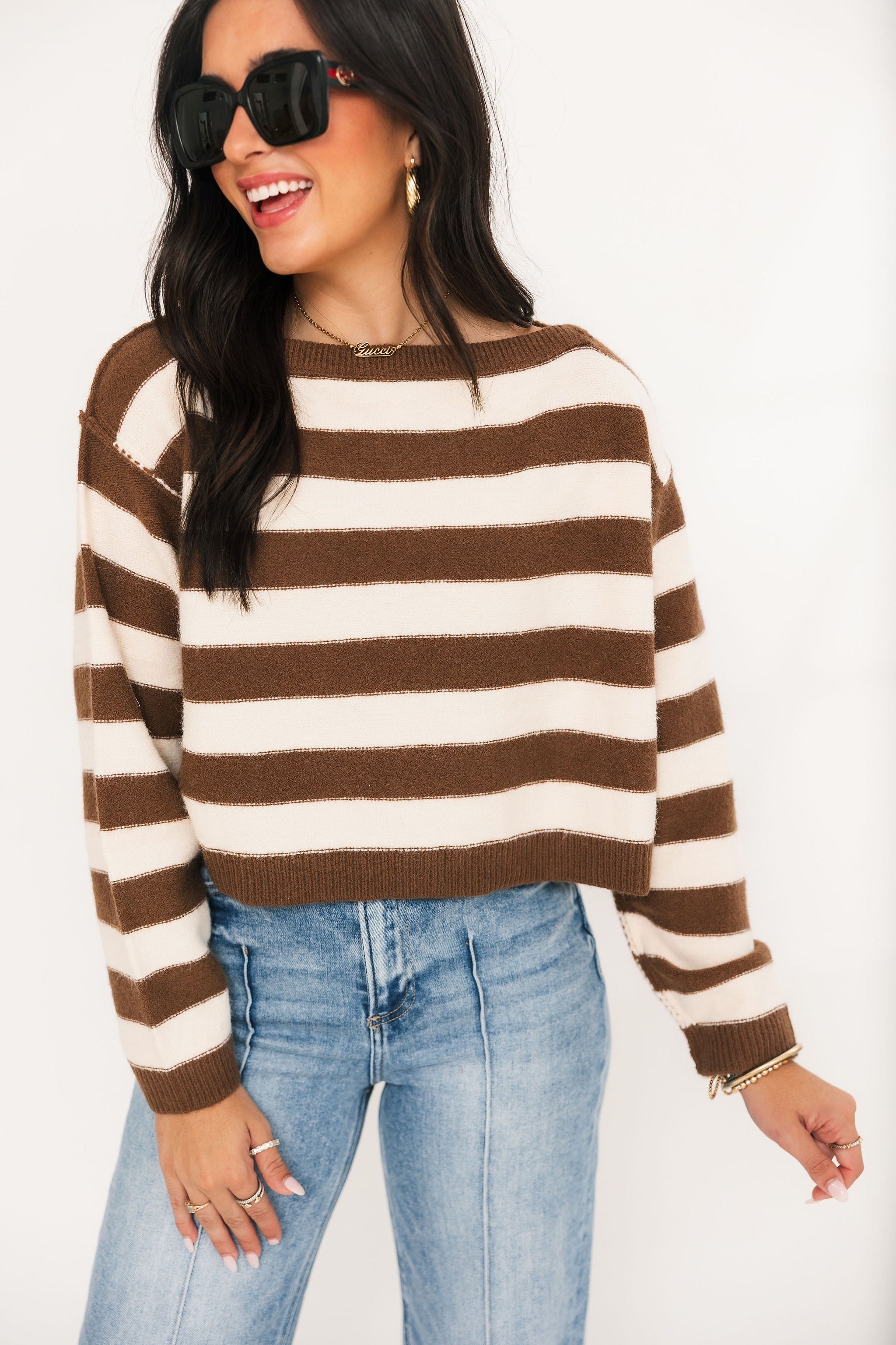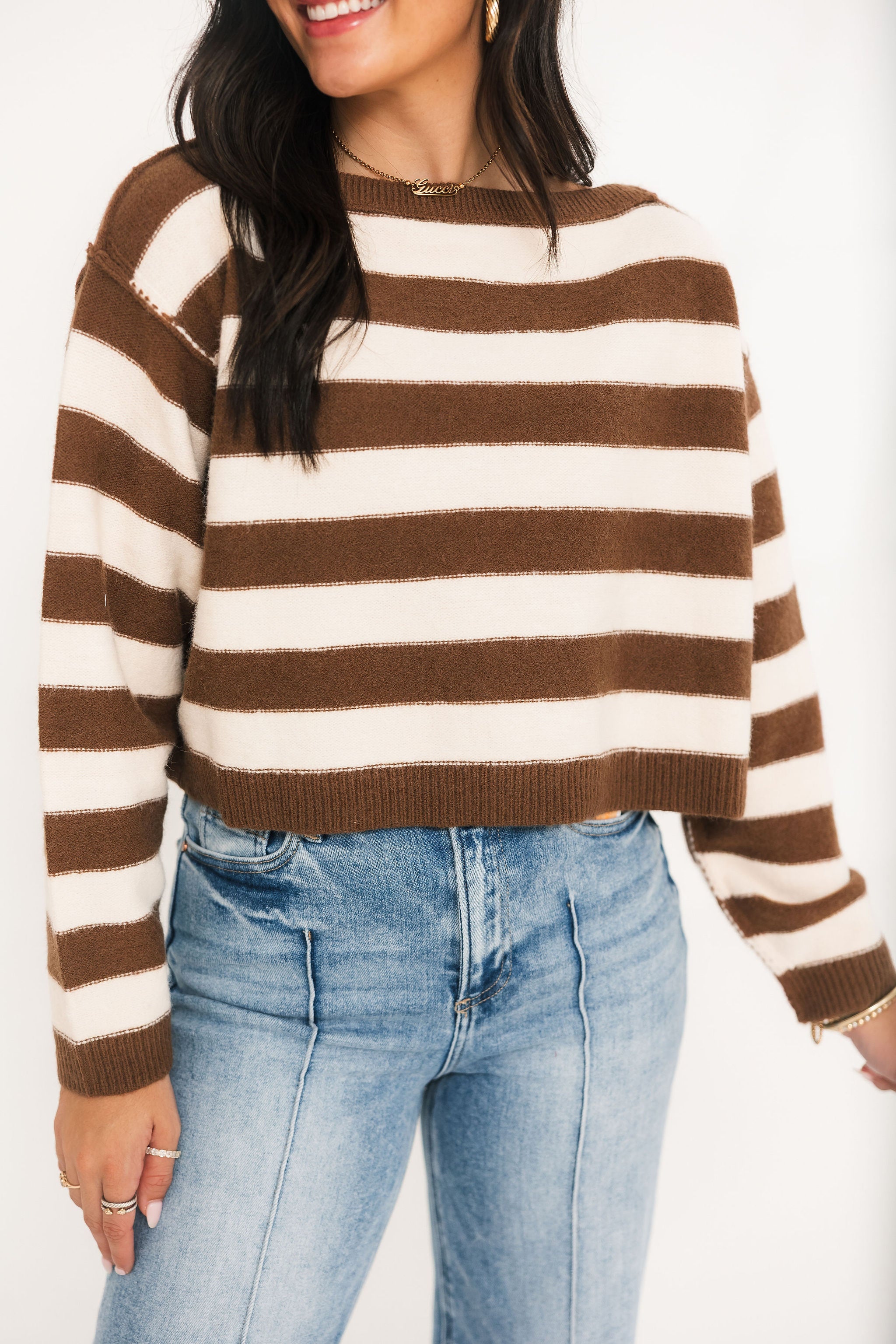 The Striped Crop Sweater in Earthbound features a relaxed fit with a boat neckline, drop shoulders, and long sleeves. Its cropped silhouette and subtle exposed seam detailing make it perfect for layering or pairing with high-waisted bottoms for effortless style. Sage is wearing a small.