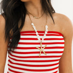 Sunshine-ready and effortlessly chic. This strapless maxi features a playful striped top and flowy fit—perfect for warm nights, seaside strolls, and everything summer. Sage is wearing a small.