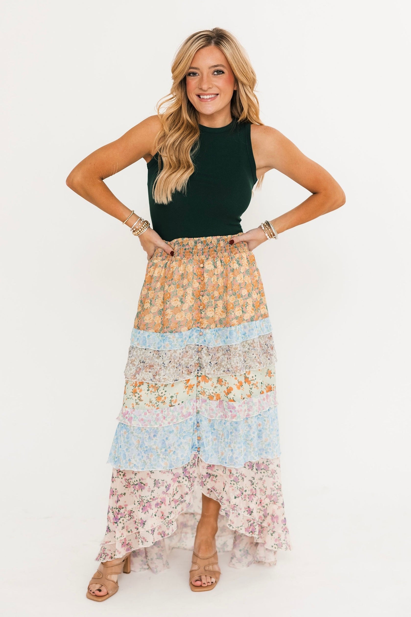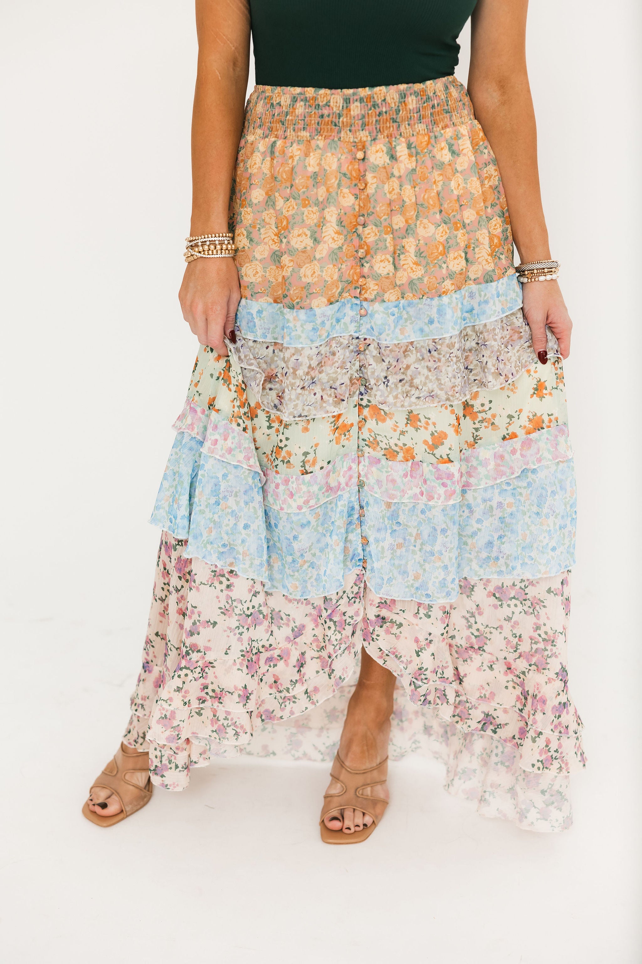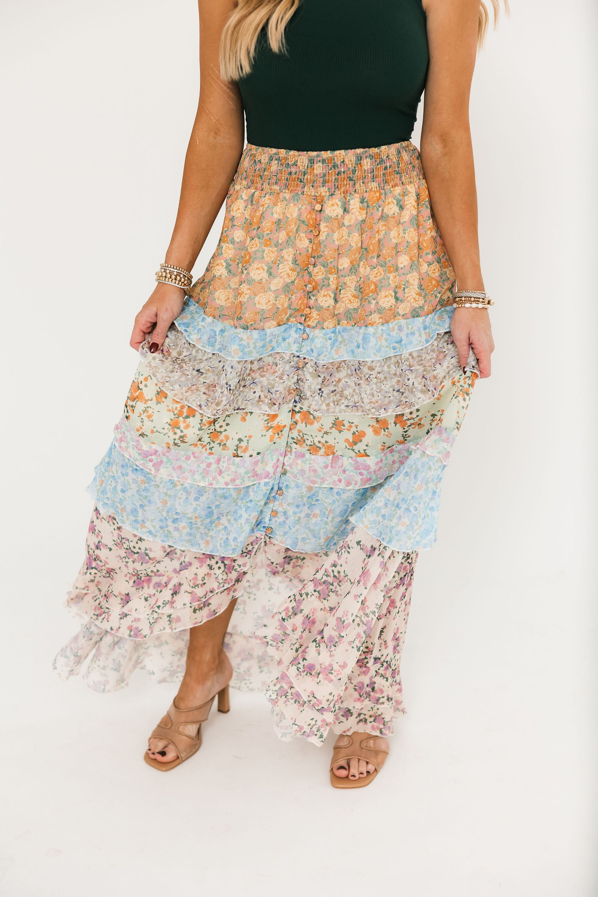 The Sunset Blooms Maxi Skirt features a tiered, billowy silhouette with a colorful, sunset-inspired print. Front button detailing adds subtle charm, while an elastic waistband ensures a comfortable, flattering fit. Perfect for layering with a tee for daytime or dressing up for evening events, this skirt is a versatile, statement-making staple. Lexi is wearing a small.