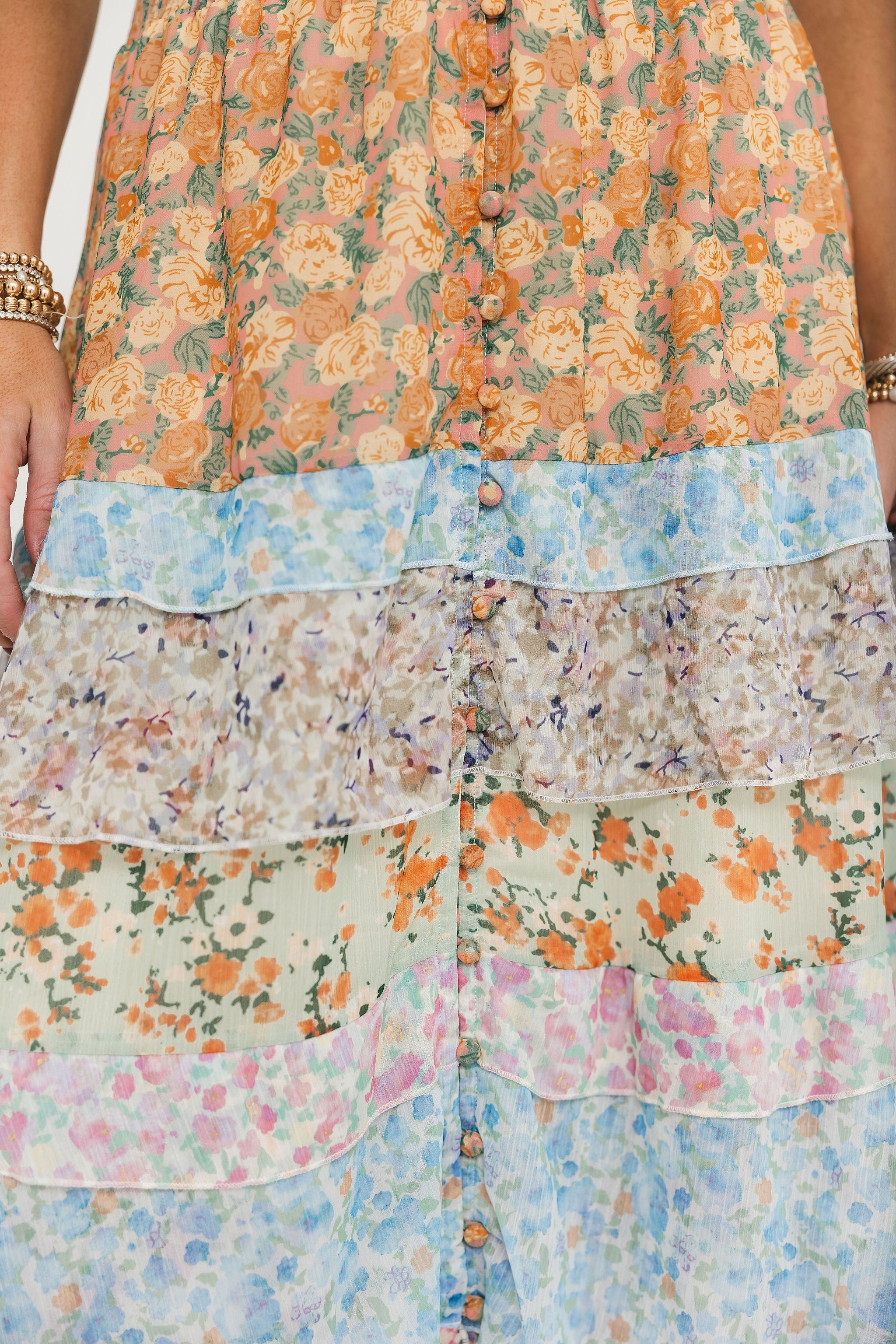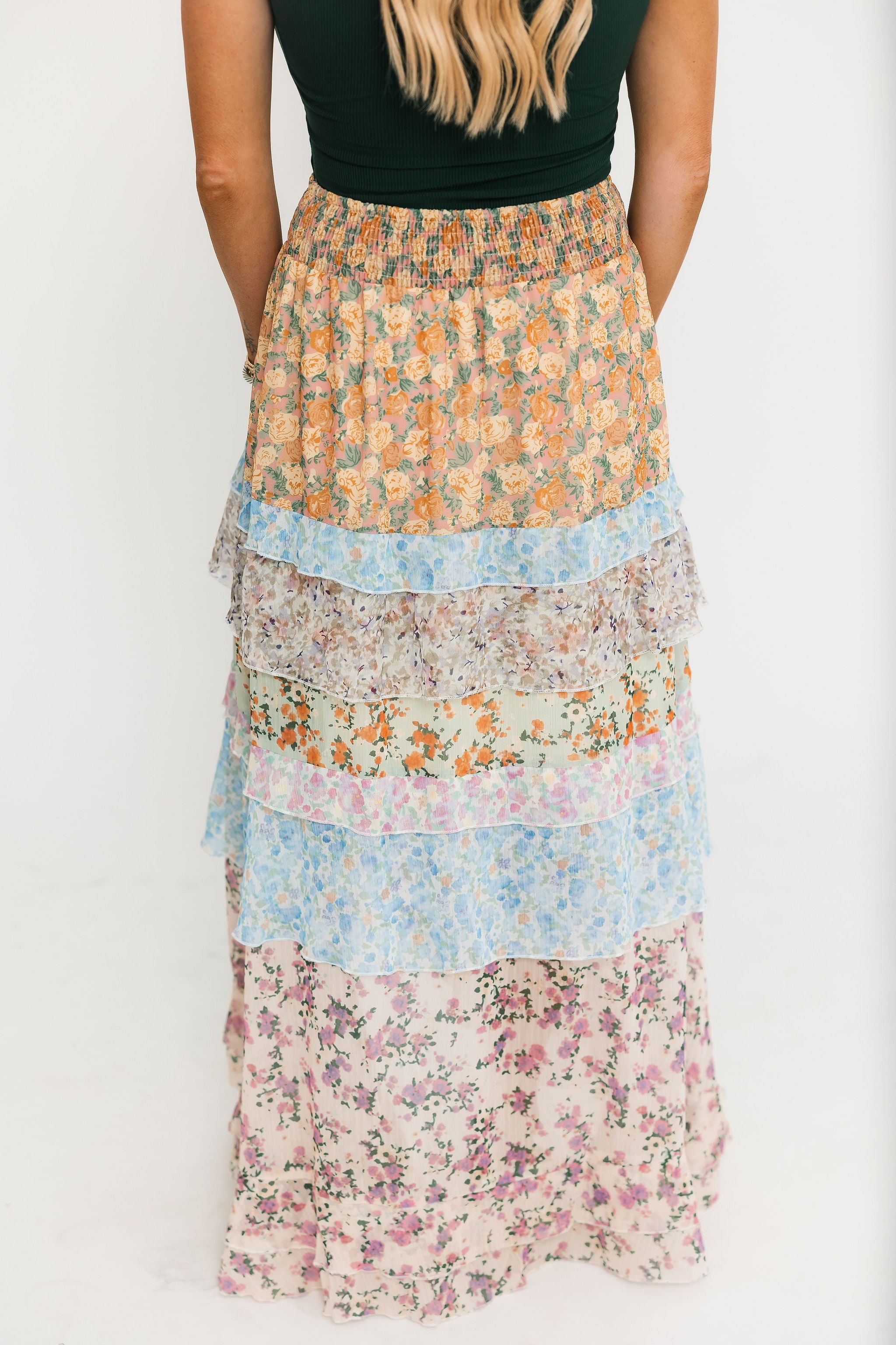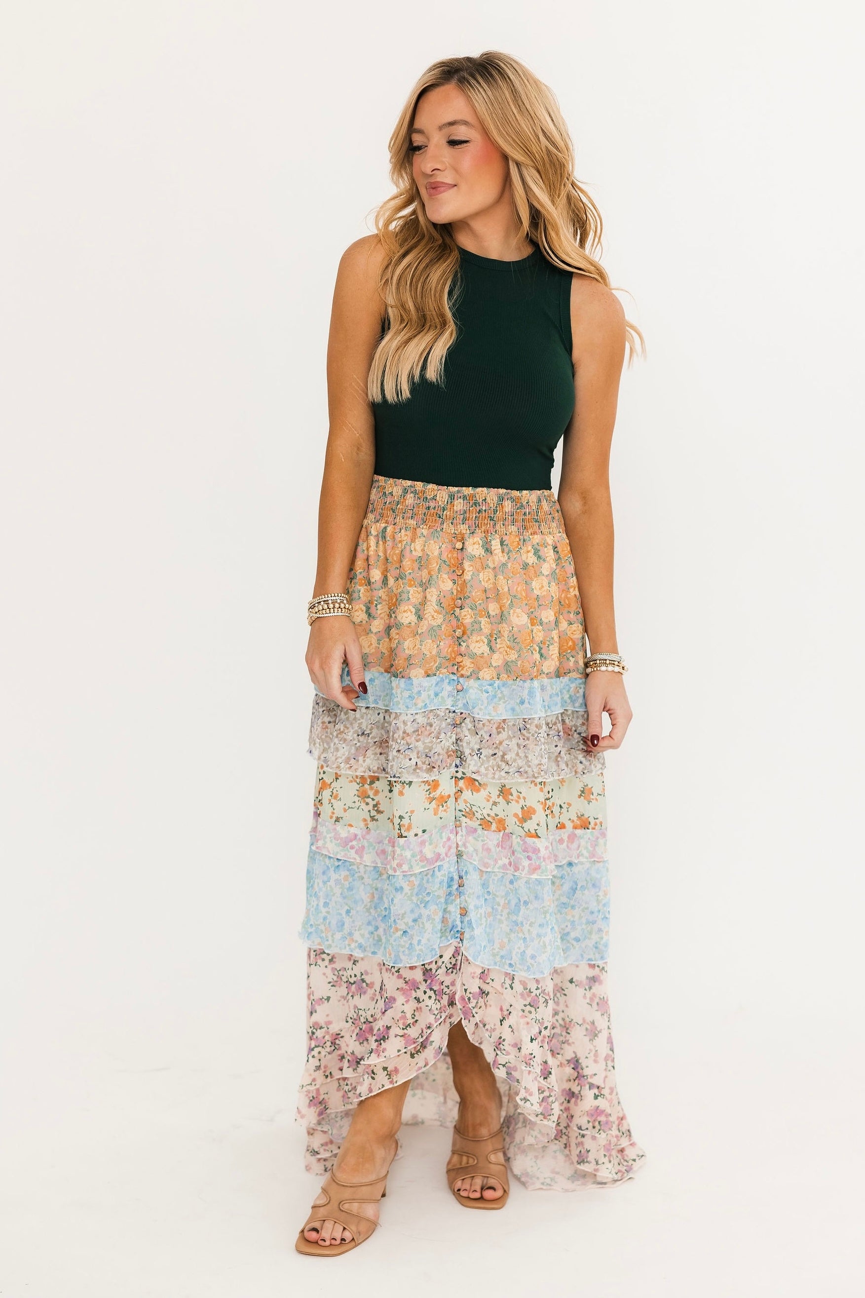 The Sunset Blooms Maxi Skirt features a tiered, billowy silhouette with a colorful, sunset-inspired print. Front button detailing adds subtle charm, while an elastic waistband ensures a comfortable, flattering fit. Perfect for layering with a tee for daytime or dressing up for evening events, this skirt is a versatile, statement-making staple. Lexi is wearing a small.