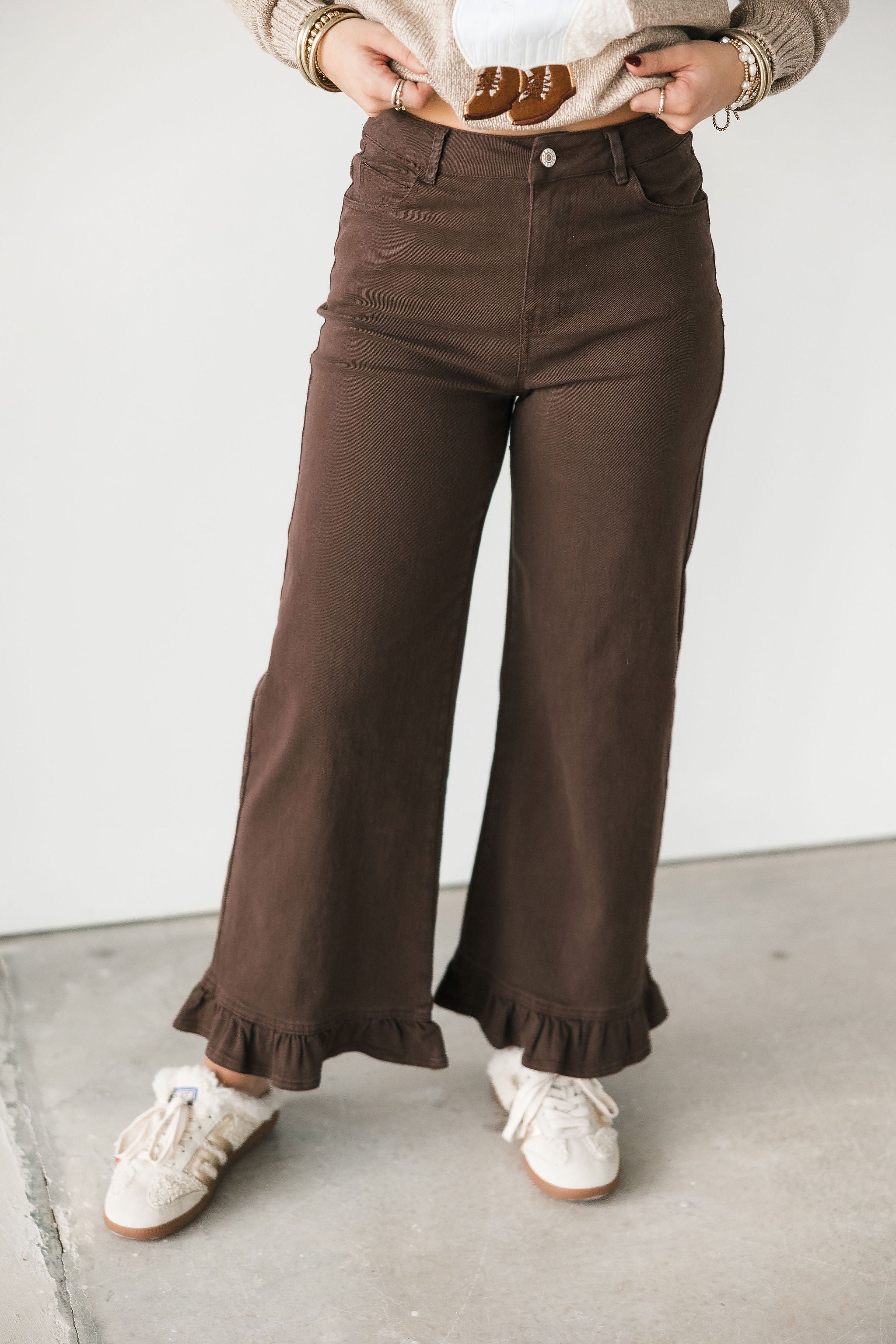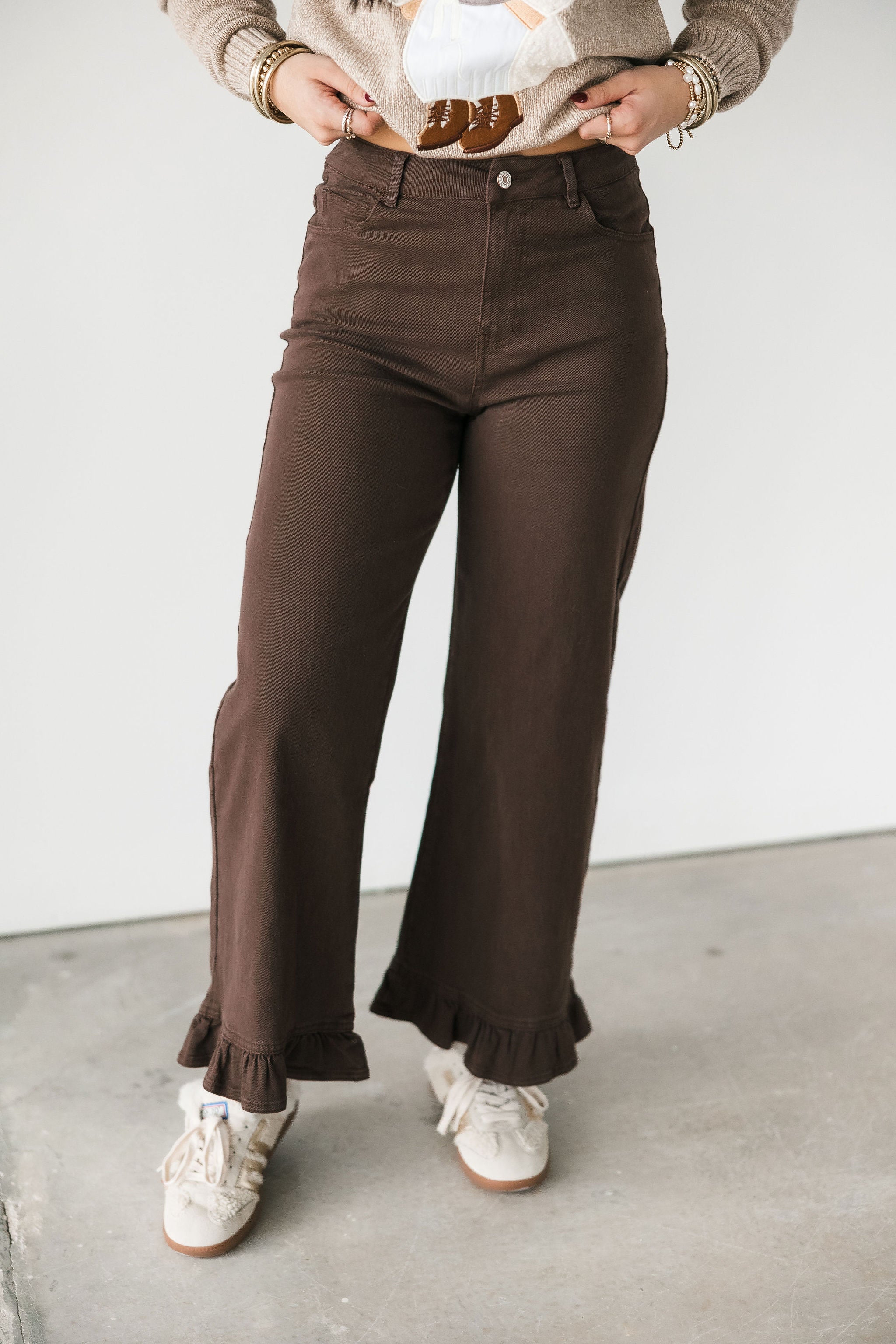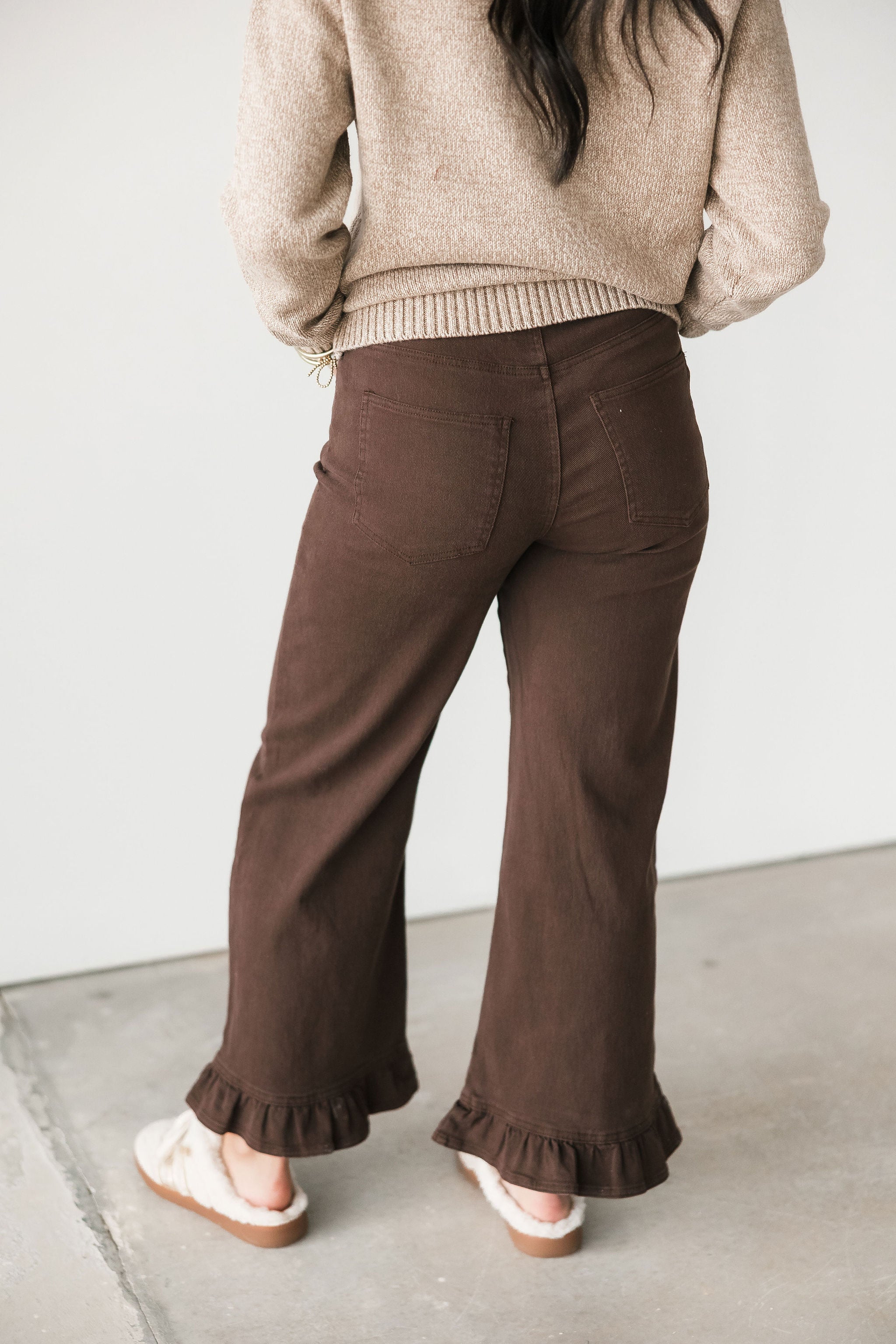 The Sweet Edge Jeans feature a wide-leg fit with a flattering high-rise waist and playful ruffle hem that adds just the right amount of personality. Easy to dress up or down, they’re the perfect blend of feminine flair and casual comfort for the season. Sage is wearing a small.