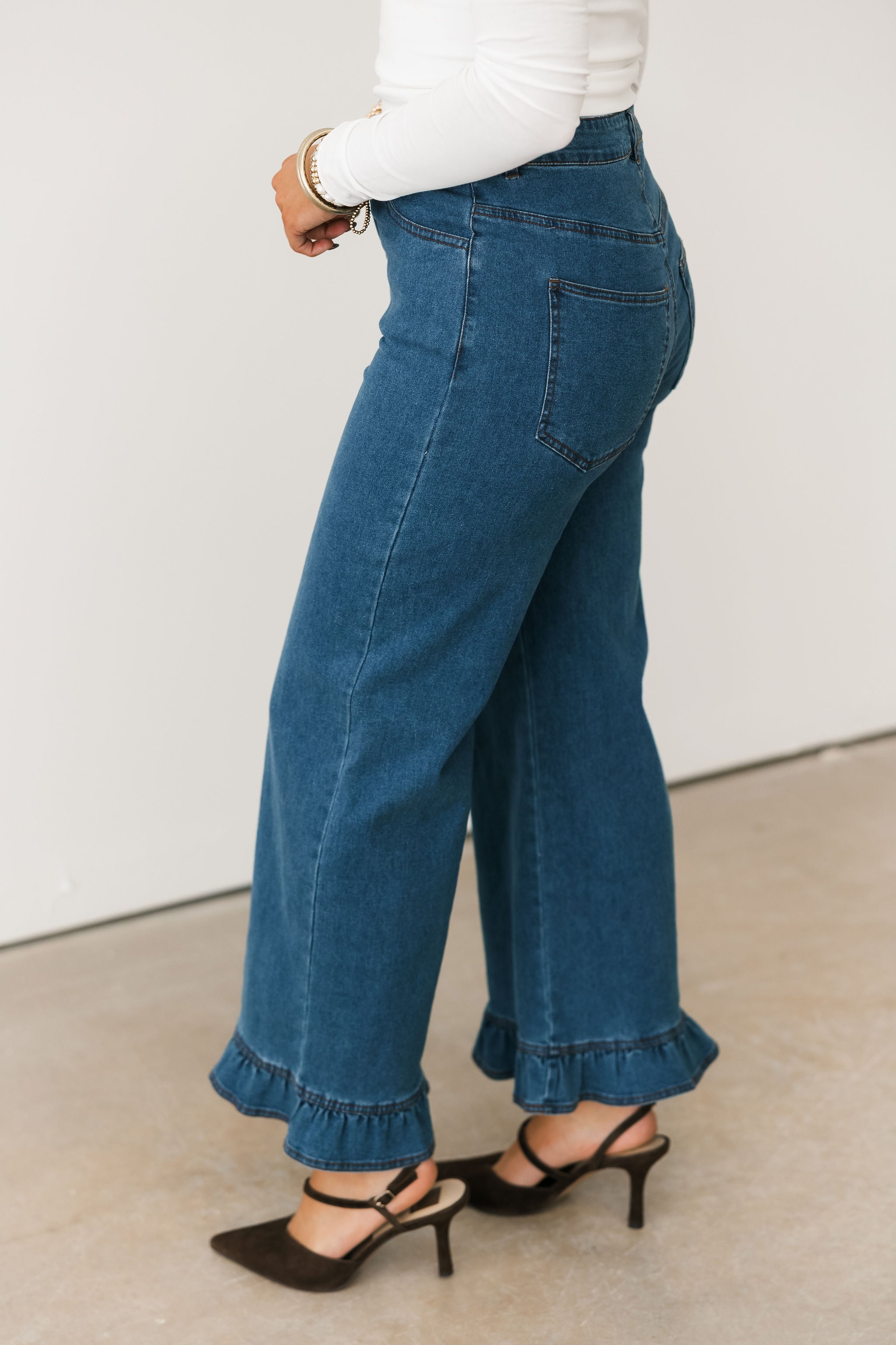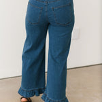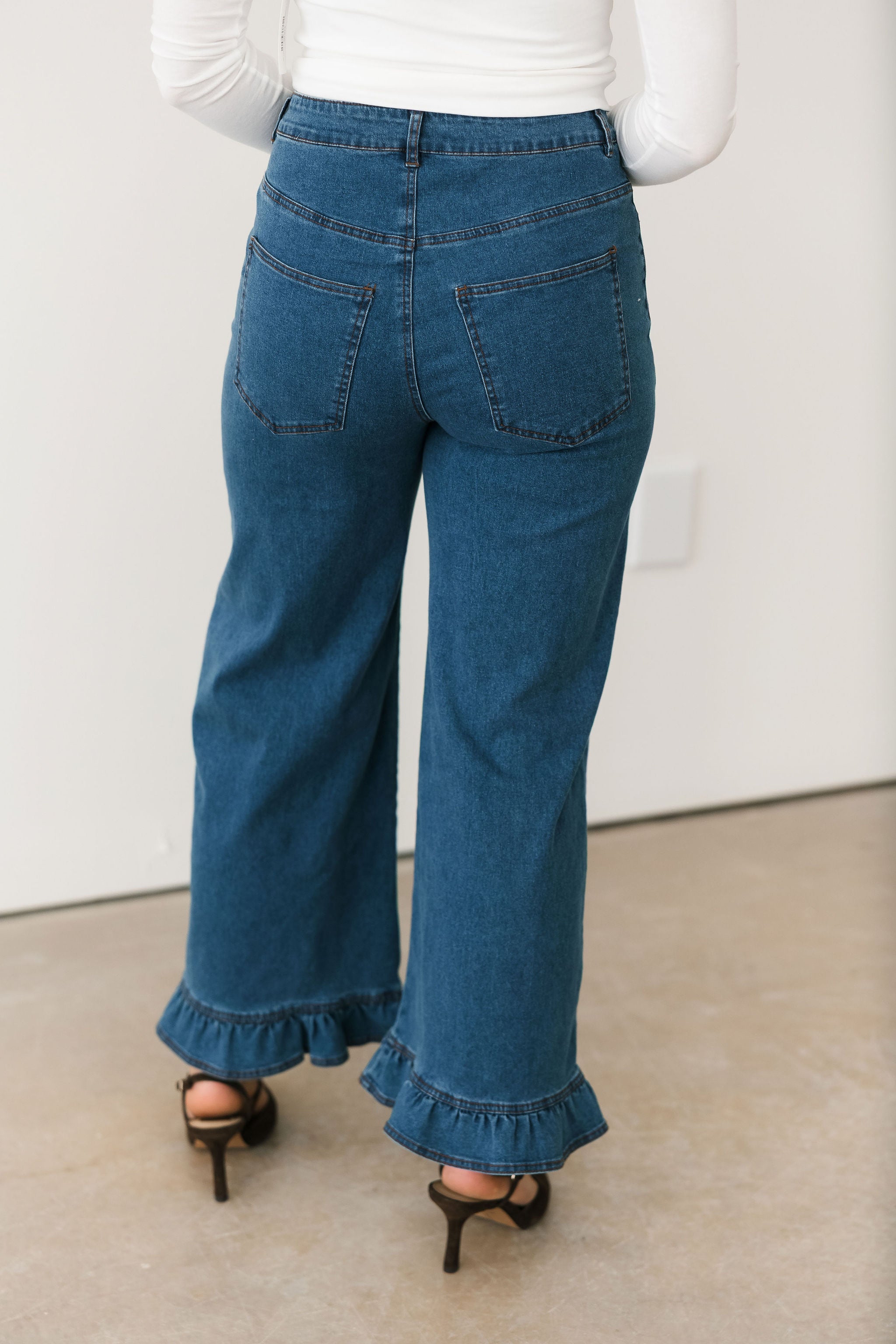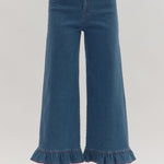 The Sweet Edge Jeans feature a wide-leg fit with a flattering high-rise waist and playful ruffle hem that adds just the right amount of personality. Easy to dress up or down, they’re the perfect blend of feminine flair and casual comfort for the season. Sage is wearing a small.